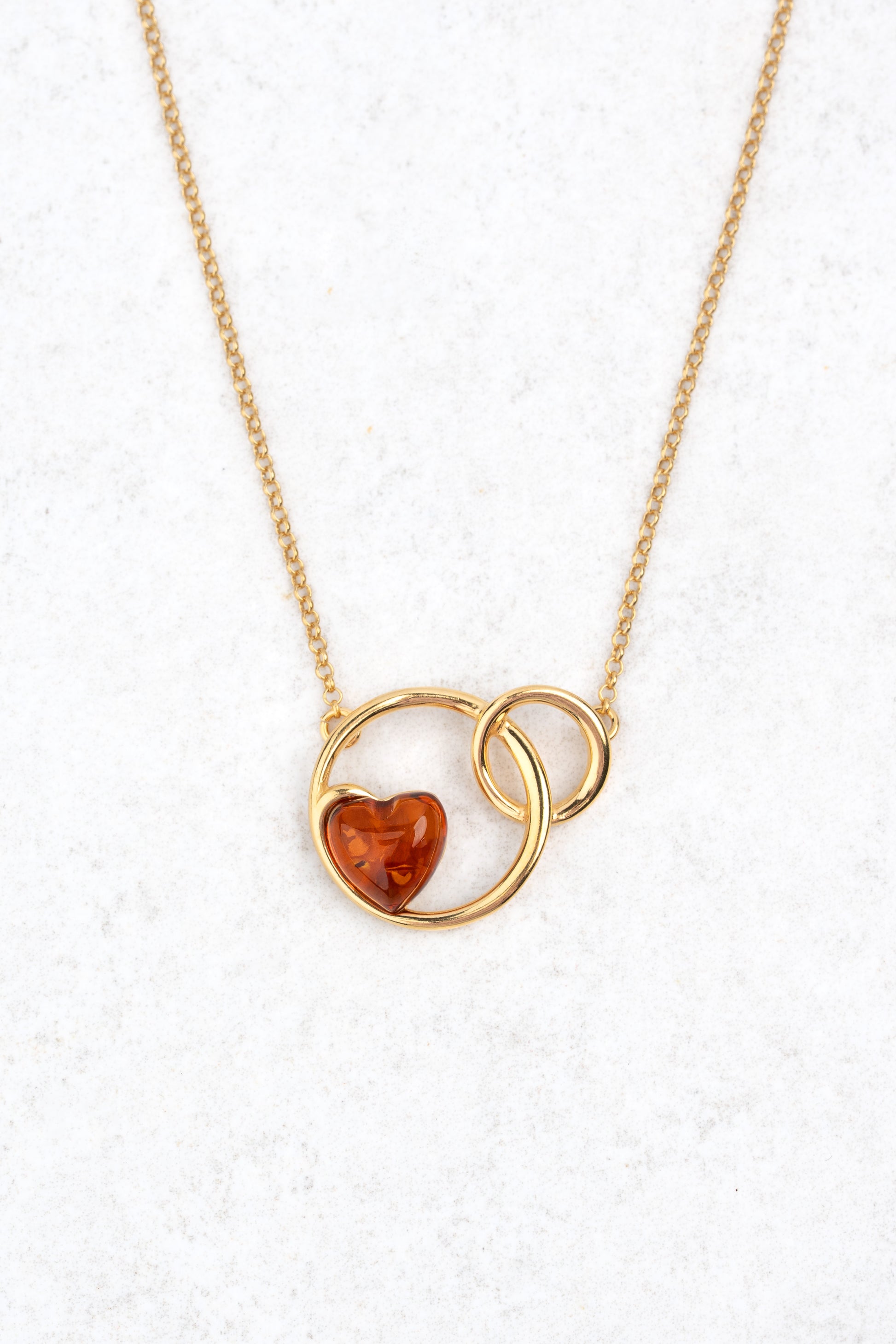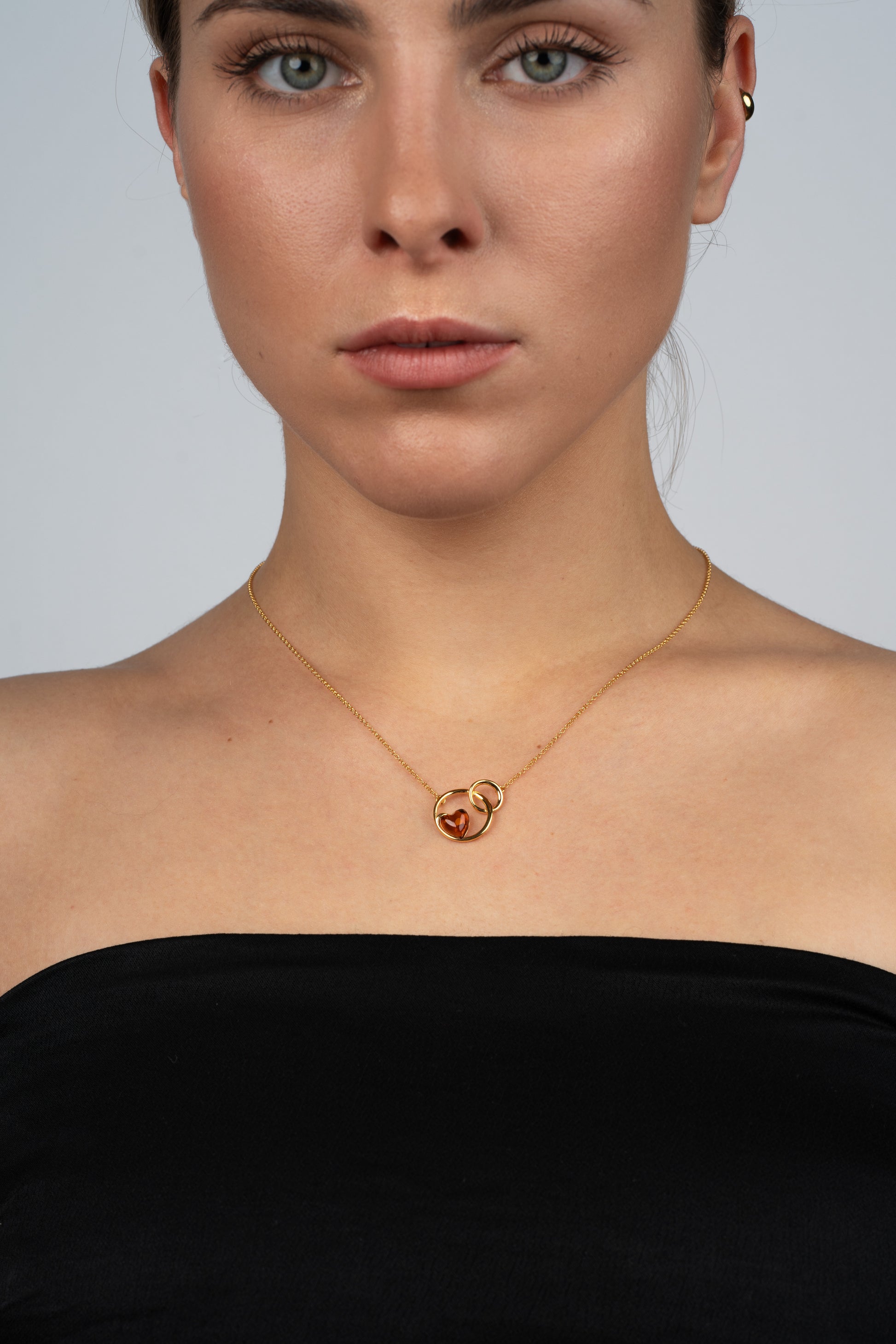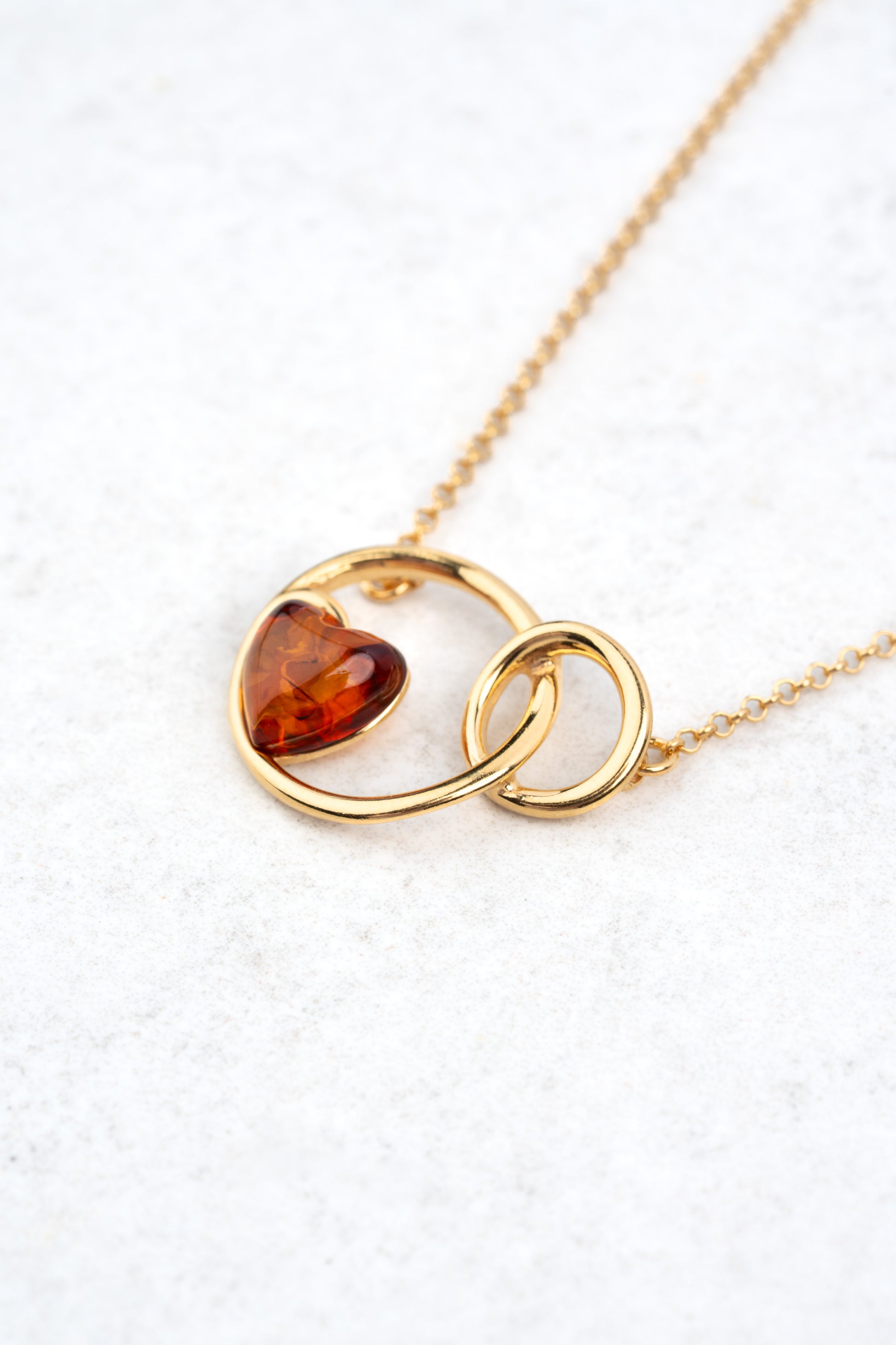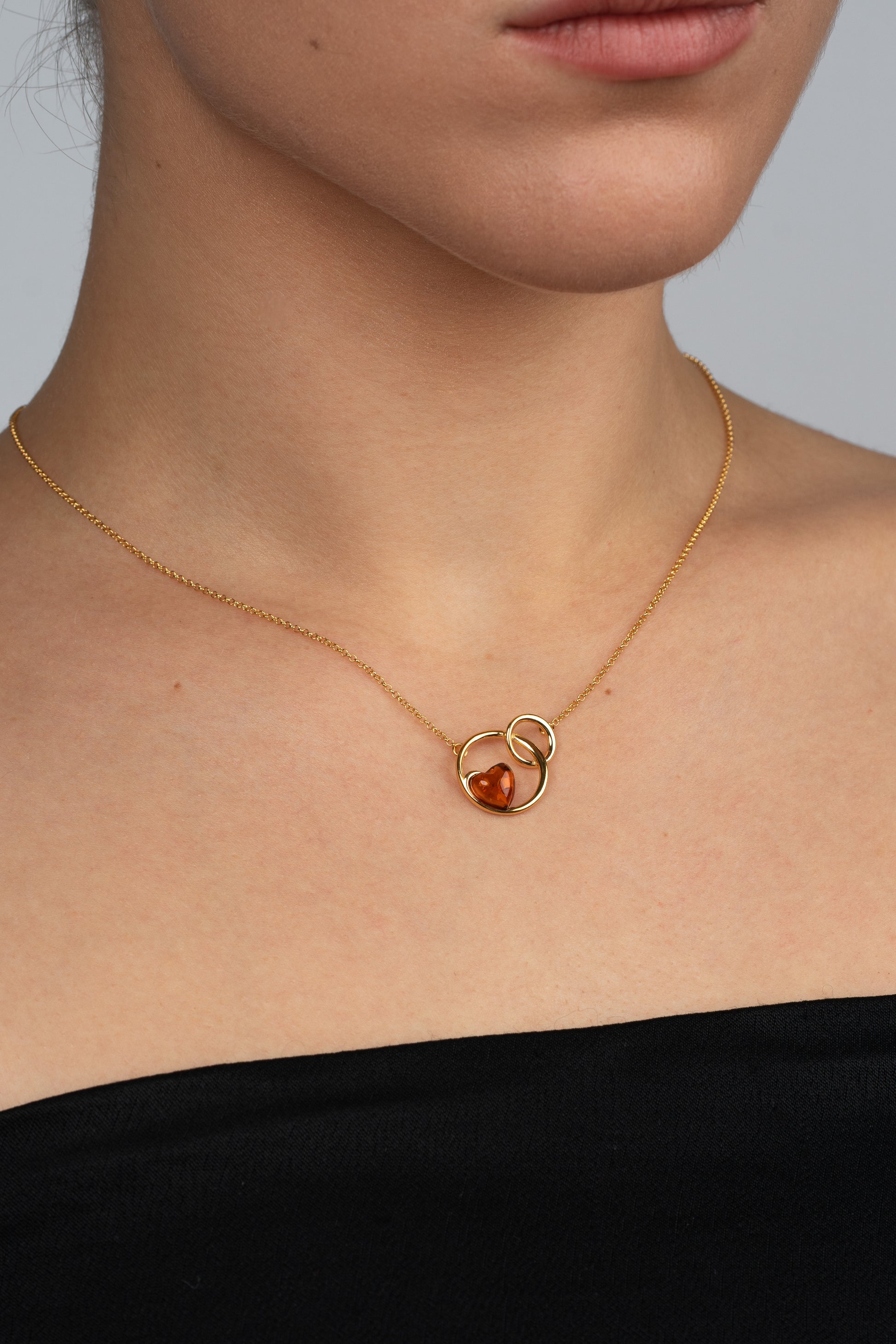 Šilta vyšninės ir gintaro spalvos širdis, įamžinta dviejose auksinėse kilpose, byloja apie ryšį – nematomą siūlą, jungiantį sielas. Savo skulptūriška, bet grakščia forma šis pakabukas subalansuoja emocijas ir geometriją, sentimentus ir stiprybę.
