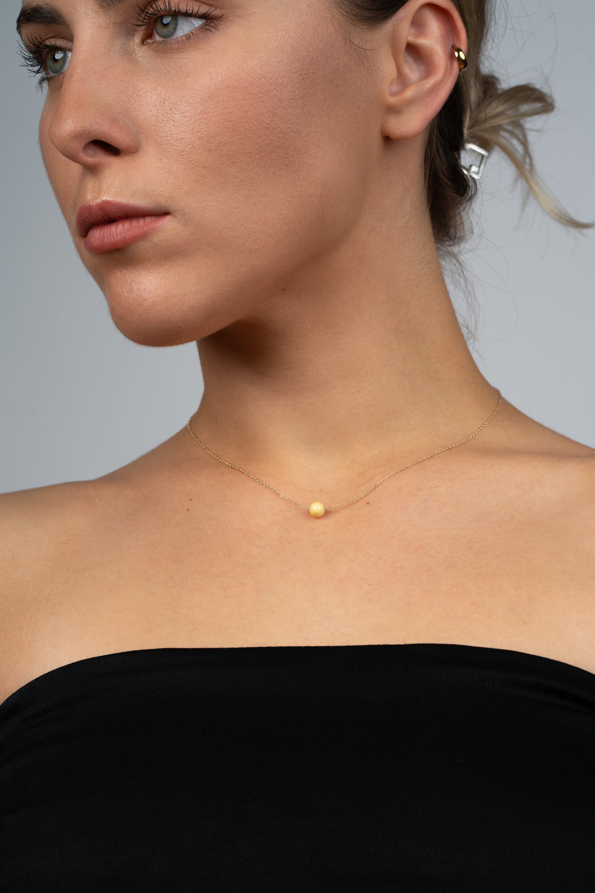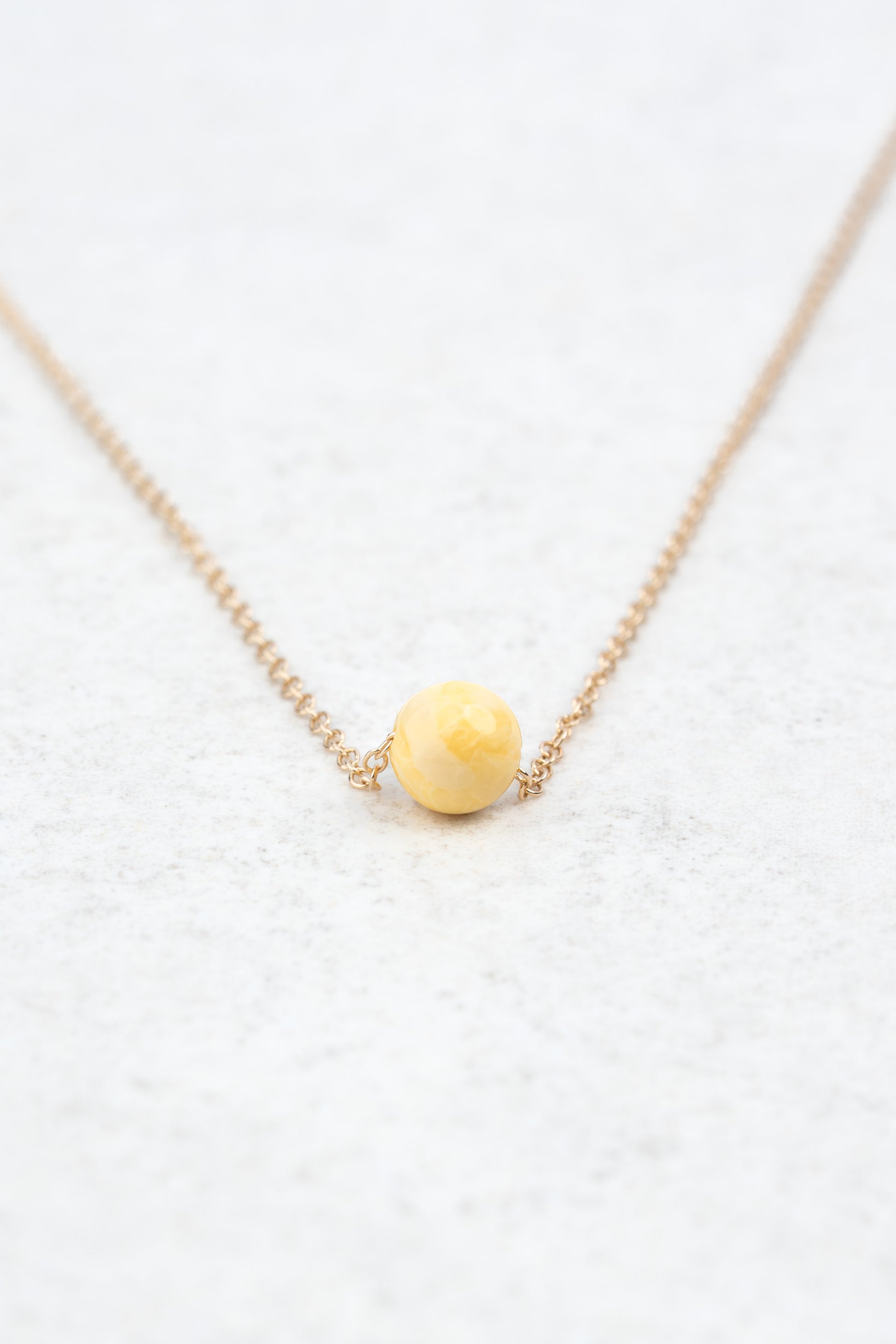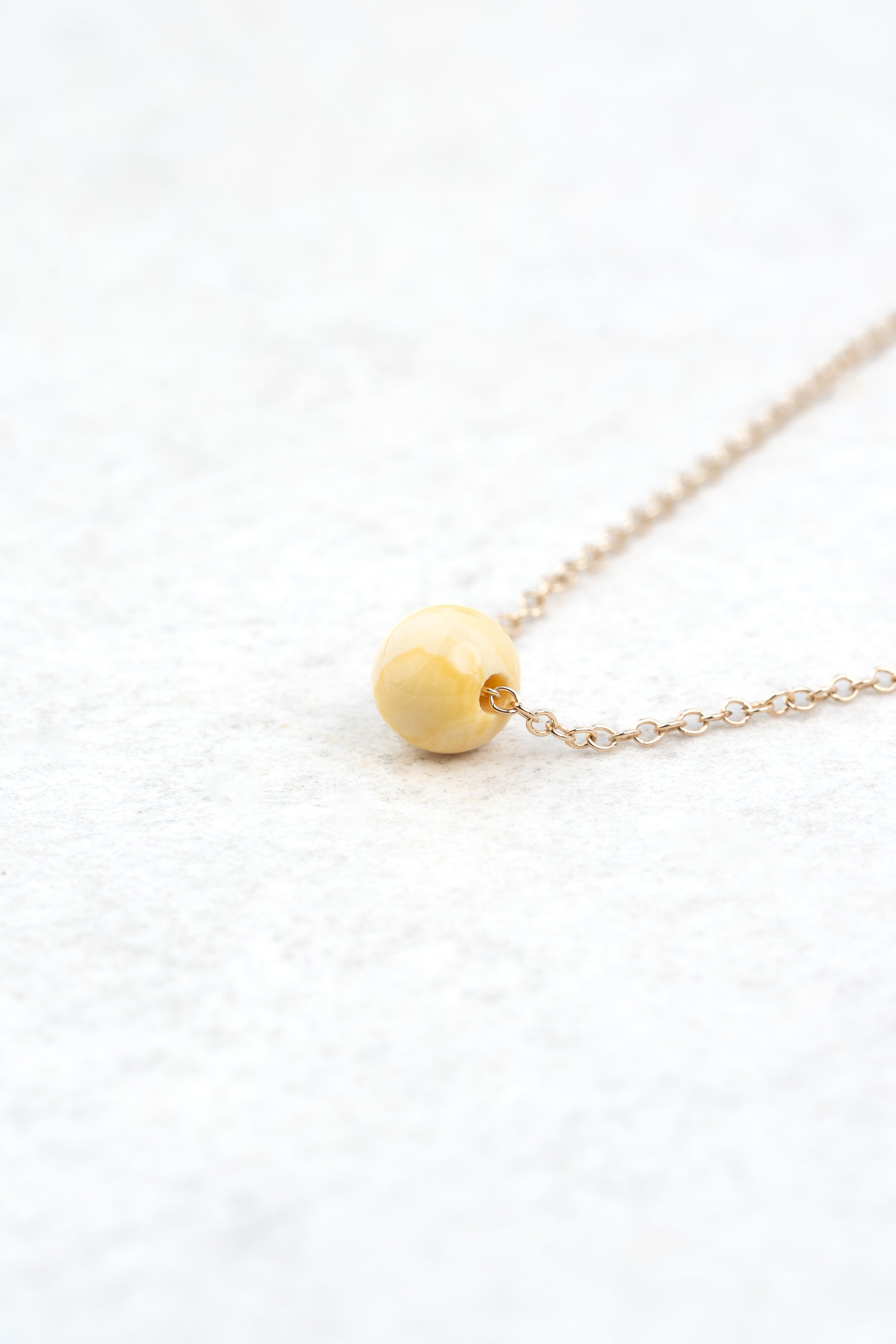 Šis minimalistinis dizainas, papuoštas vienu poliruotu baltu Baltijos gintaro rutuliu, perteikia ramią paprastumo eleganciją. Švelnus, kreminis gintaro atspalvis atspindi ramybę ir pusiausvyrą, spinduliuodamas švelnią vidinę šviesą.