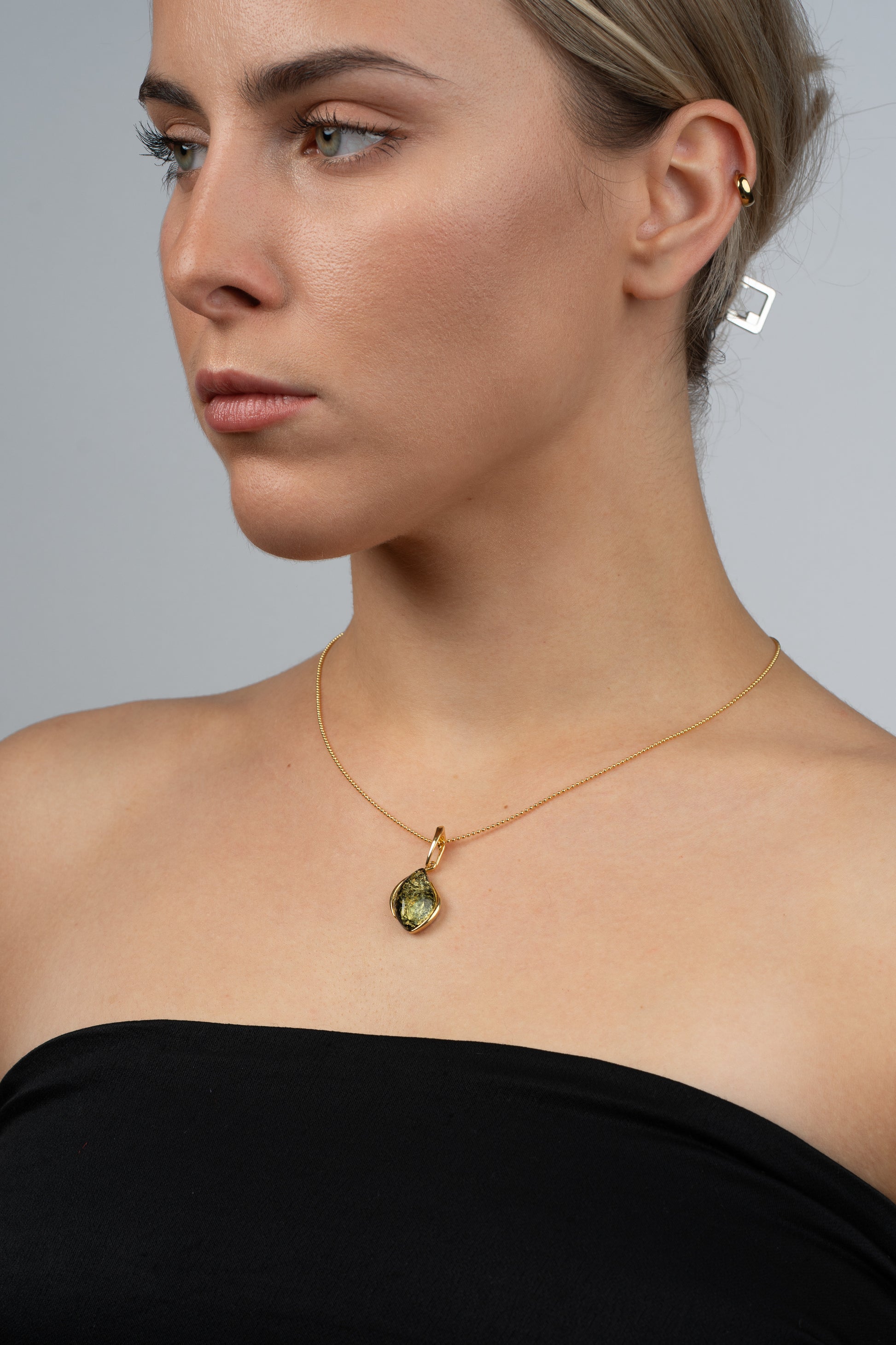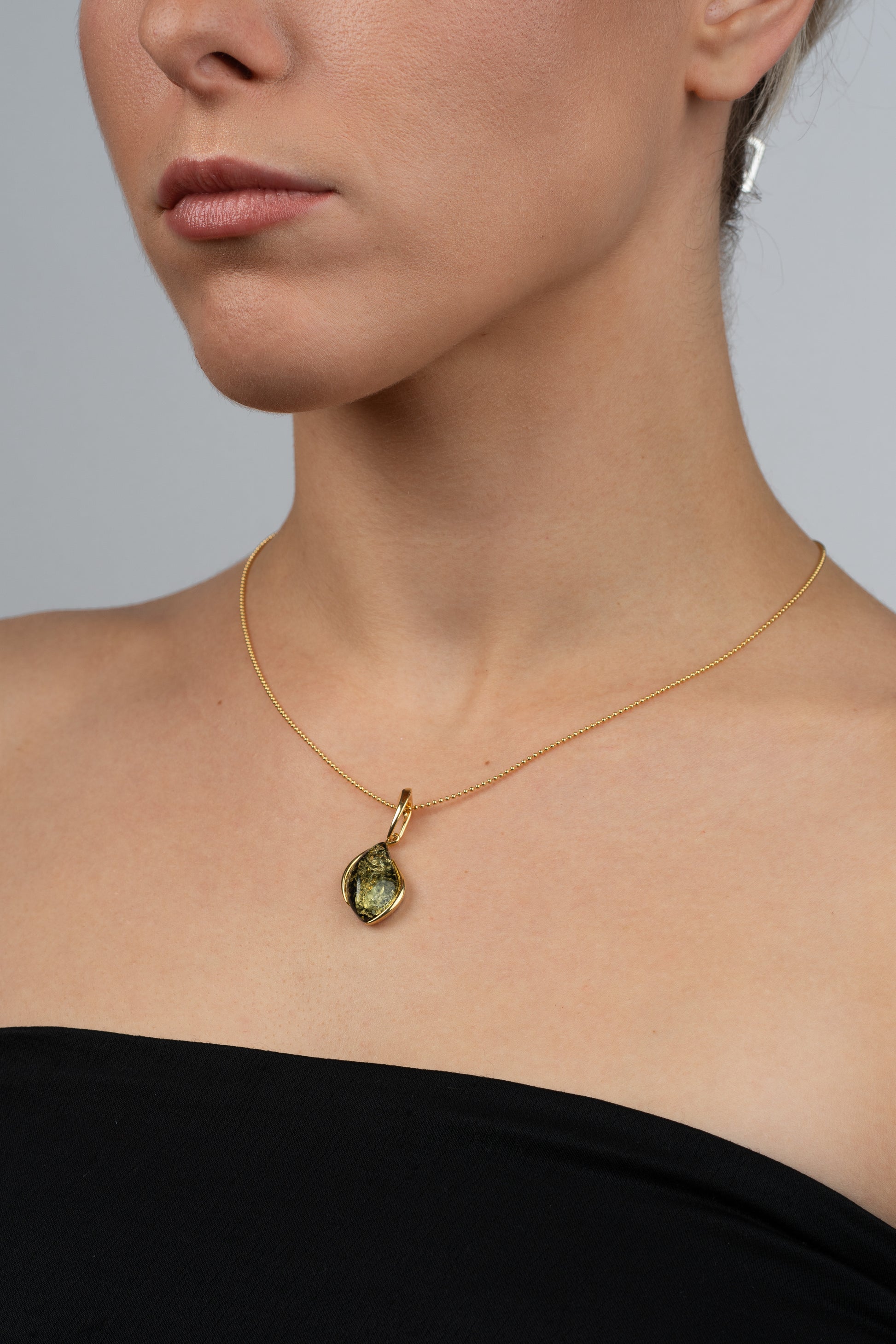 Pagamintas Baltijos regiono juvelyrų iš natūralaus žalio gintaro ir 24 karatų auksu padengto sidabro, šis pakabukas primena šviesos švytėjimą, sklindantį pro miško lapus. Organiškas, liepsną primenantis siluetas atspindi ir judėjimą, ir ramybę, užfiksuodamas amžiną gyvenimo ritmą žemėje. Elegantiškas, tačiau žemiškas „Flamma Viridis“ sujungia natūralią grožį su rafinuotu moderniu dizainu.