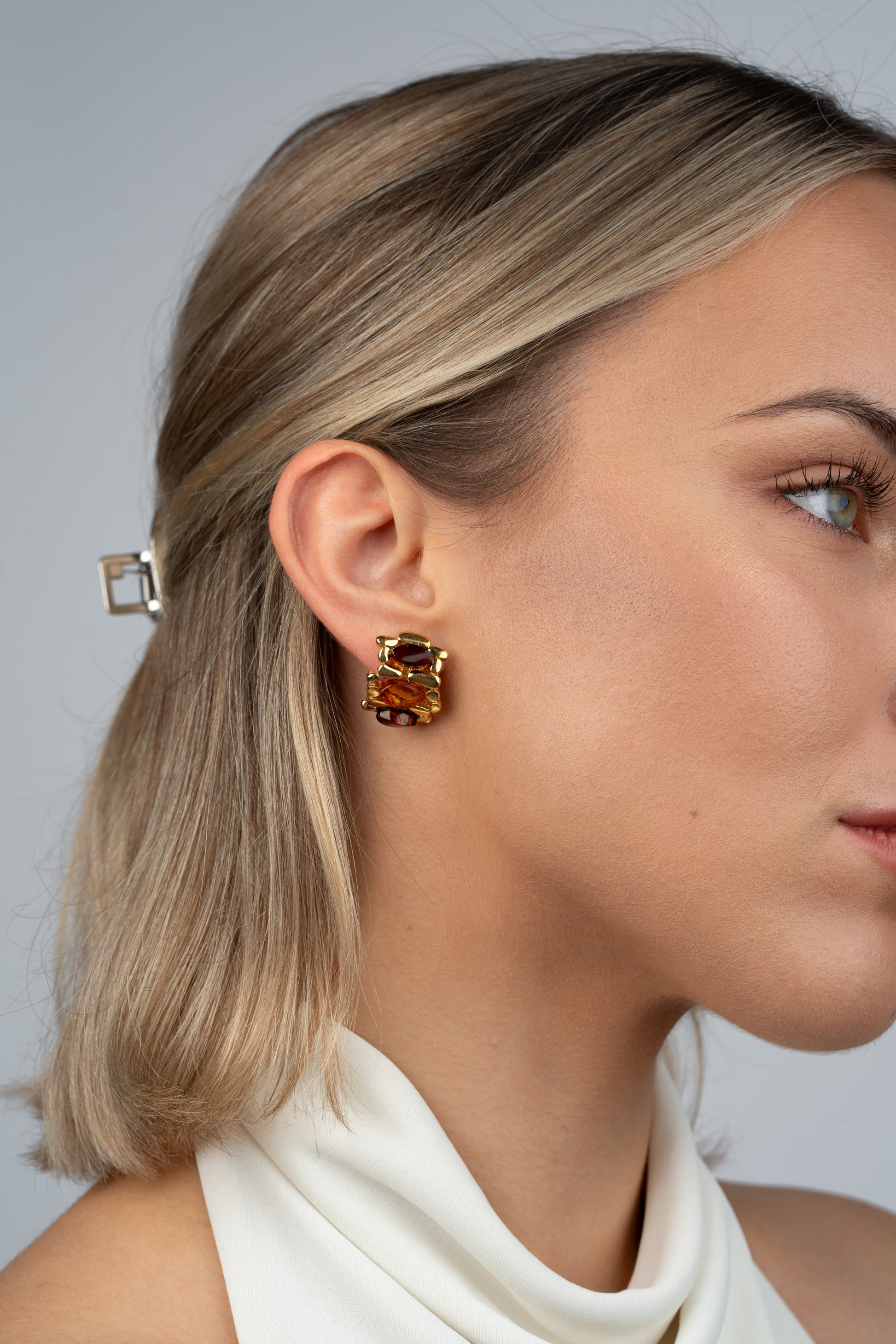 Šie auskarai, pagaminti iš spindinčio vyšnių ir medaus spalvos gintaro mišinio, alsuoja gyvos liepsnos šiluma ir gyvybingumu. Jų skulptūriška forma ir ryškūs tonai perteikia ir ugnies aistrą, ir nesenstantį Baltijos gintaro grožį.