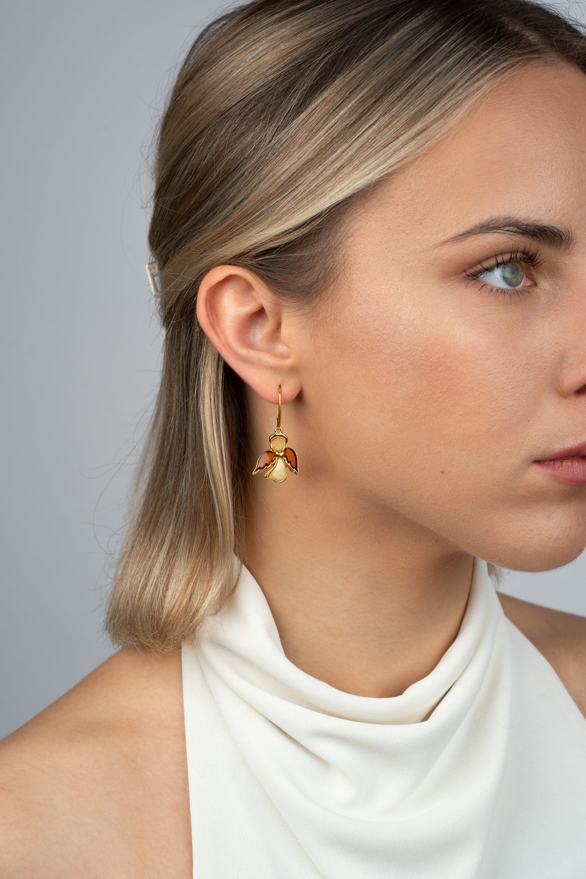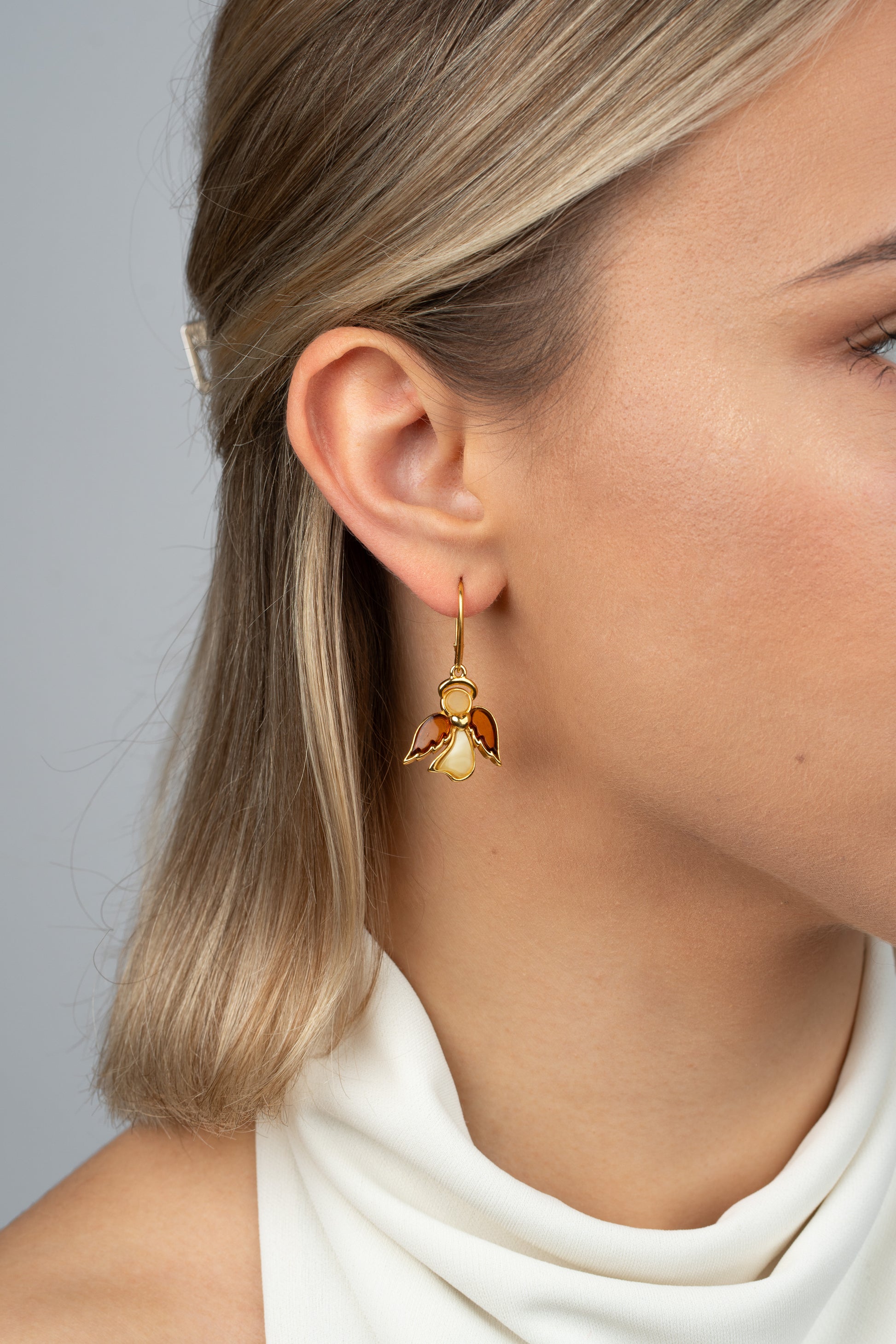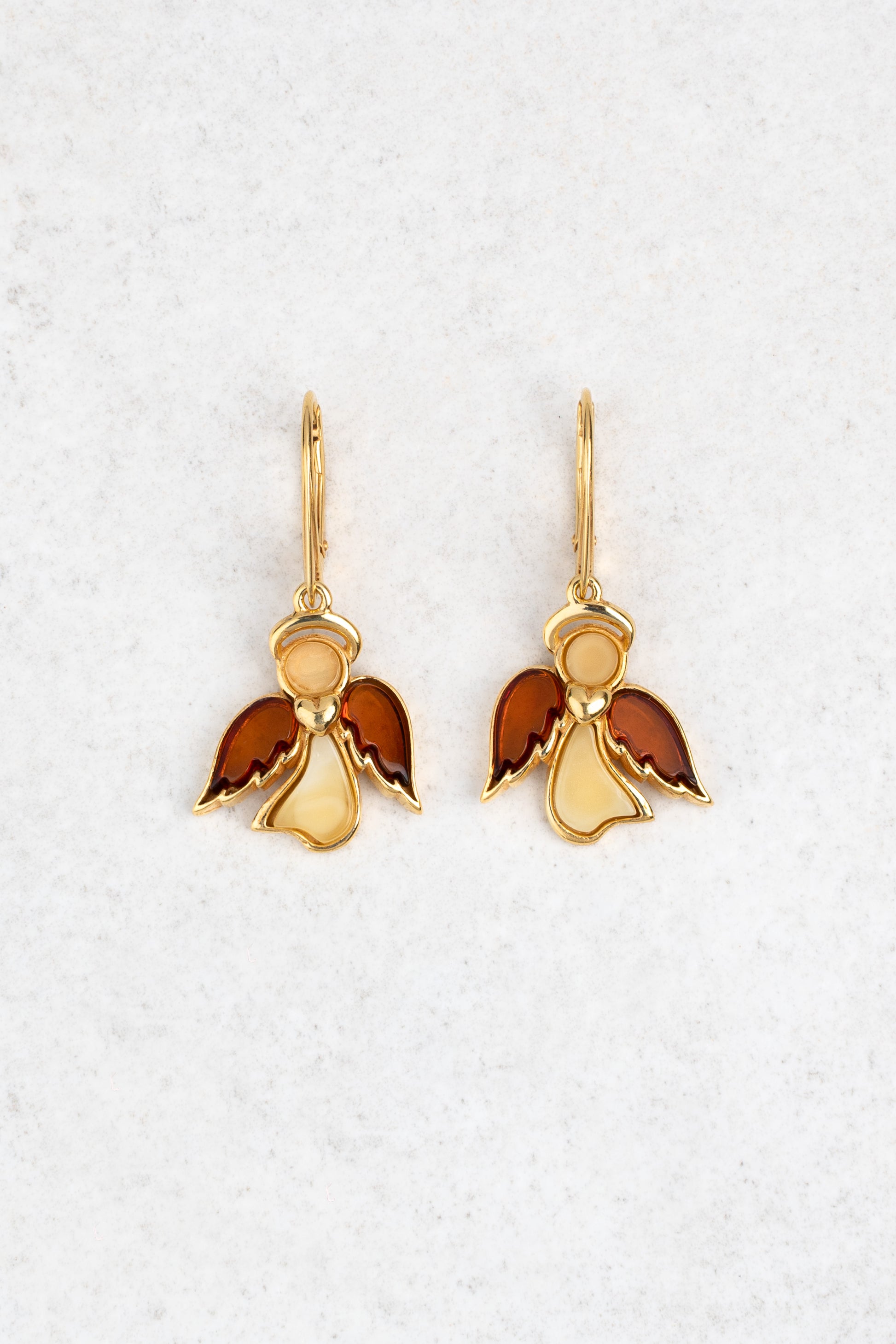 Šie auskarai, suformuoti kaip subtilios dangaus figūros, sujungia šiltą pieno ir gilų konjako spalvos gintarą, simbolizuojantį šviesą ir apsaugą. Jų grakštus dizainas primena saulės šviesos paliestus angelus sargus.