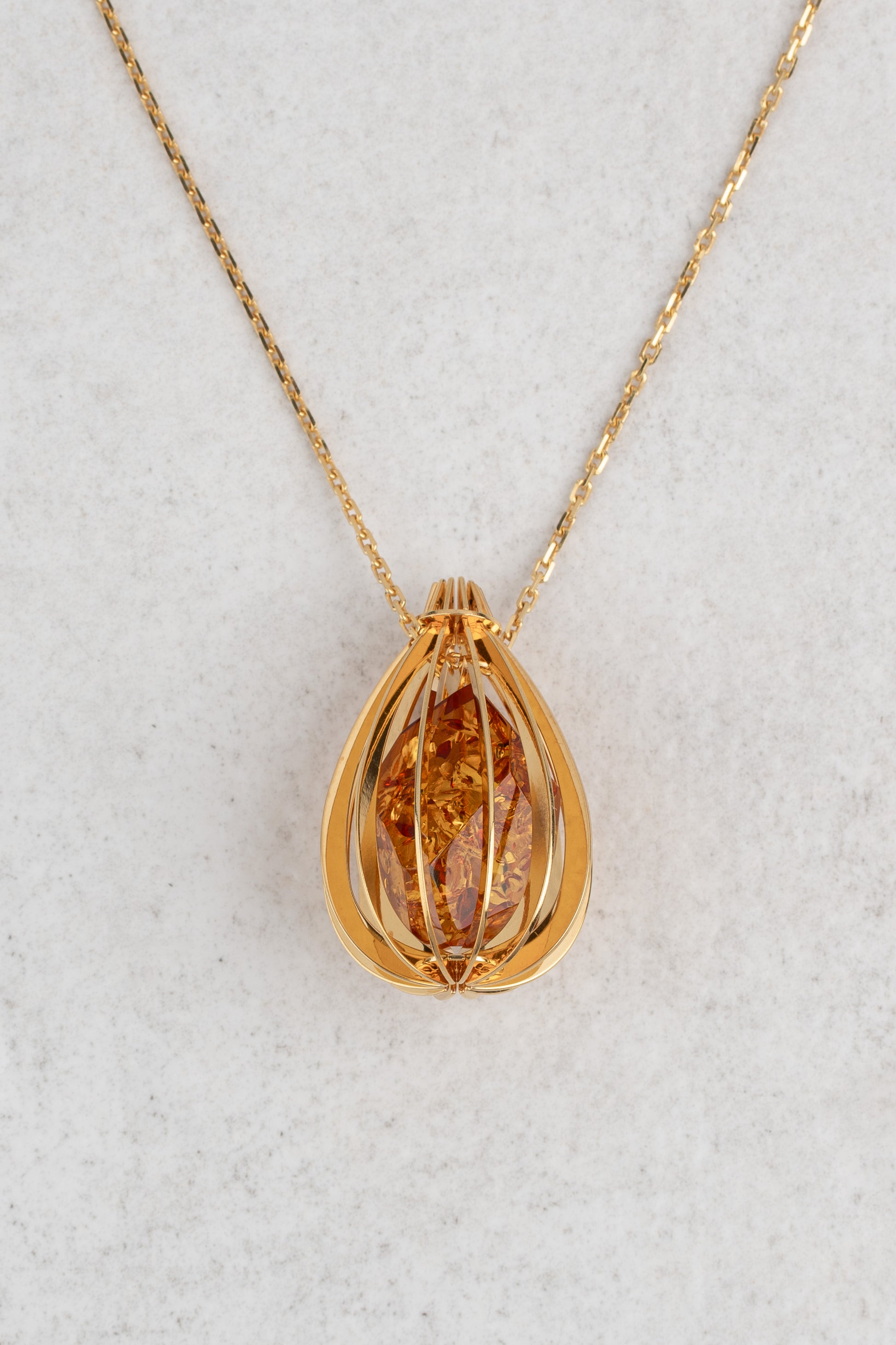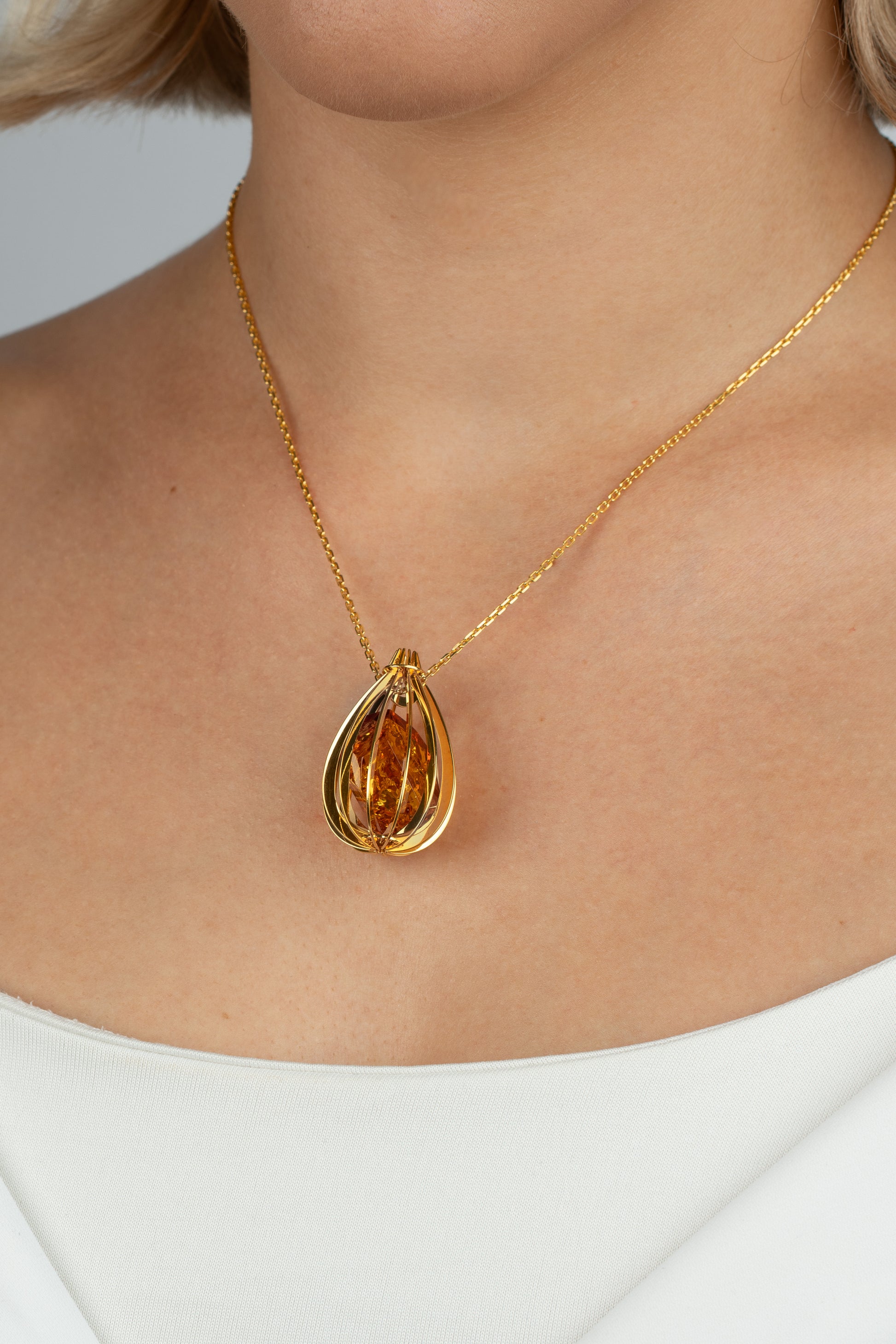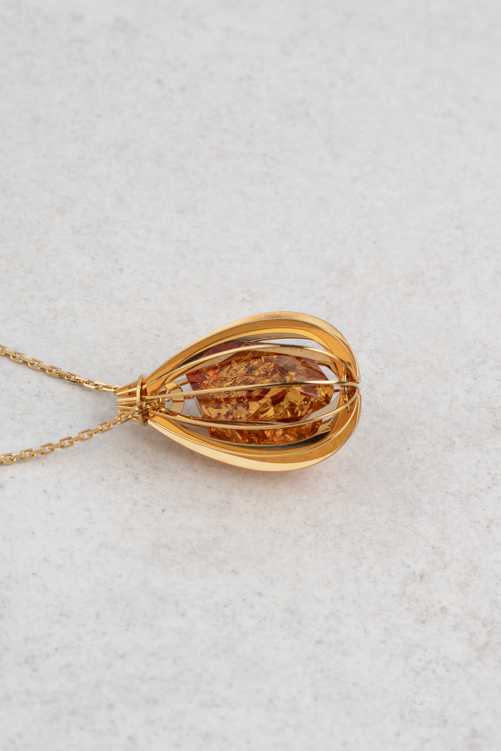 Rankų darbo, sukurtas įgudusio Baltijos meistro, šis kaklo papuošalas atskleidžia tikro Baltijos gintaro spindesį. Auksinė struktūra sustiprina jo švelnų vidinį švytėjimą, suteikdama papuošalui elegancijos, subtilios prabangos ir laiko nepavaldaus žavesio – idealiai tinka tiems, kurie vertina gamtos rafinuotą grožį.