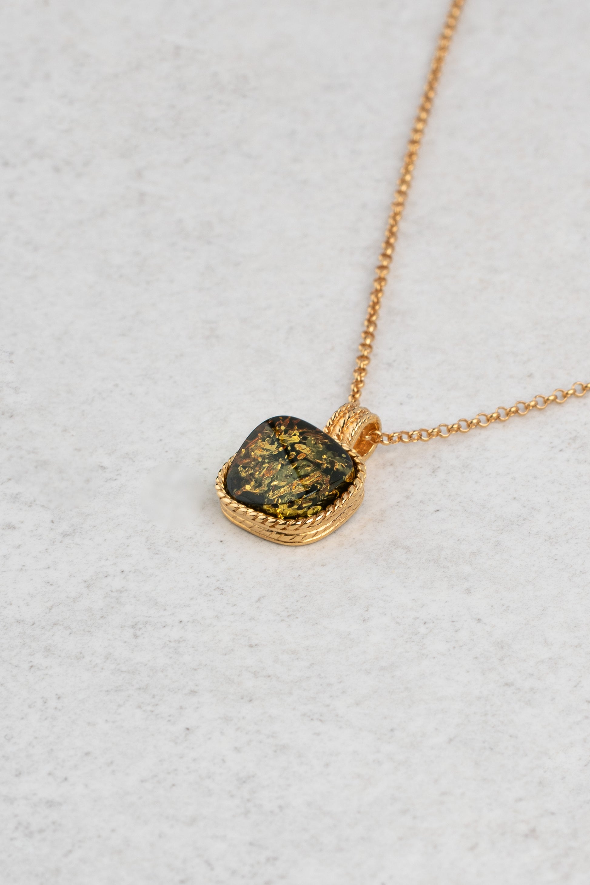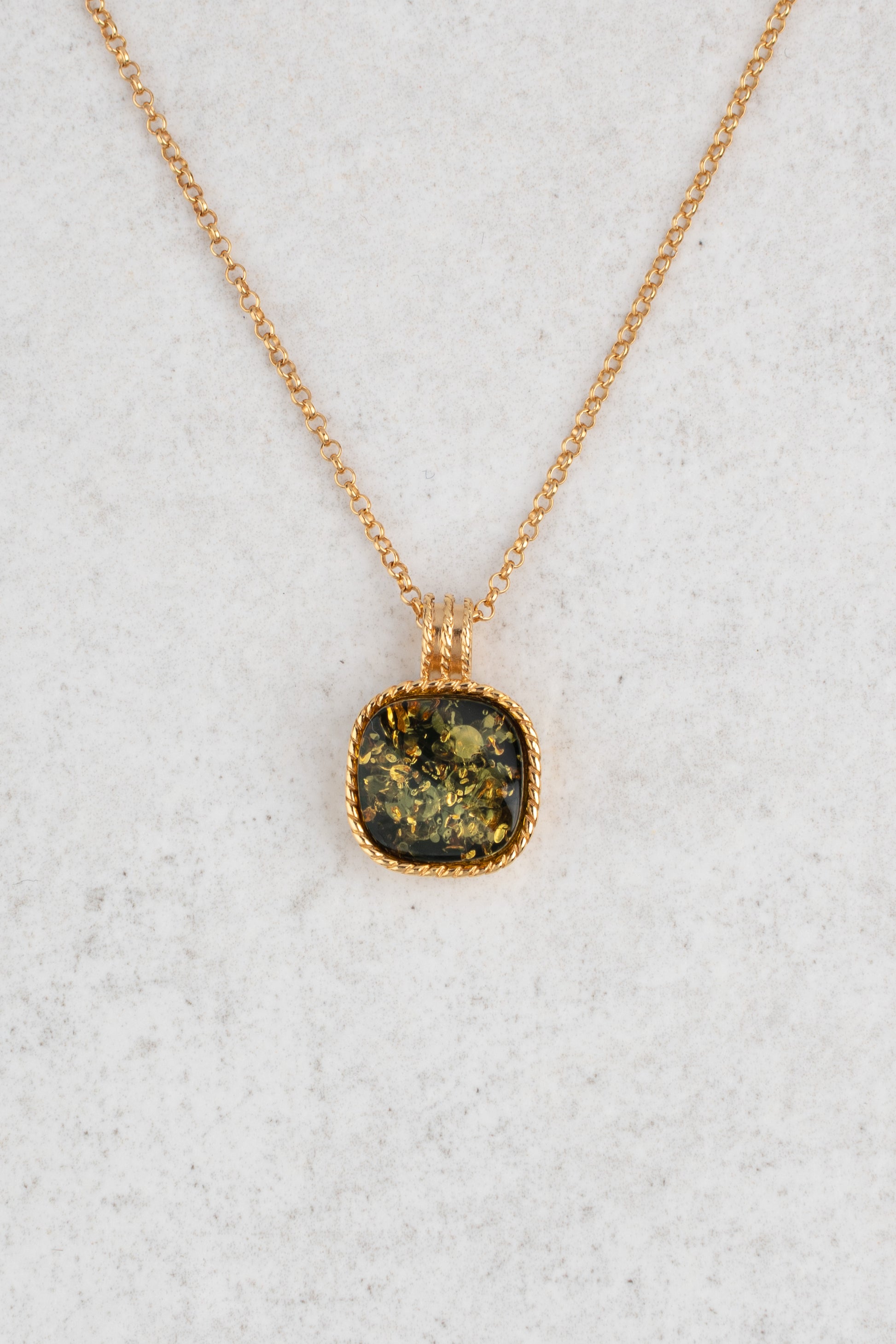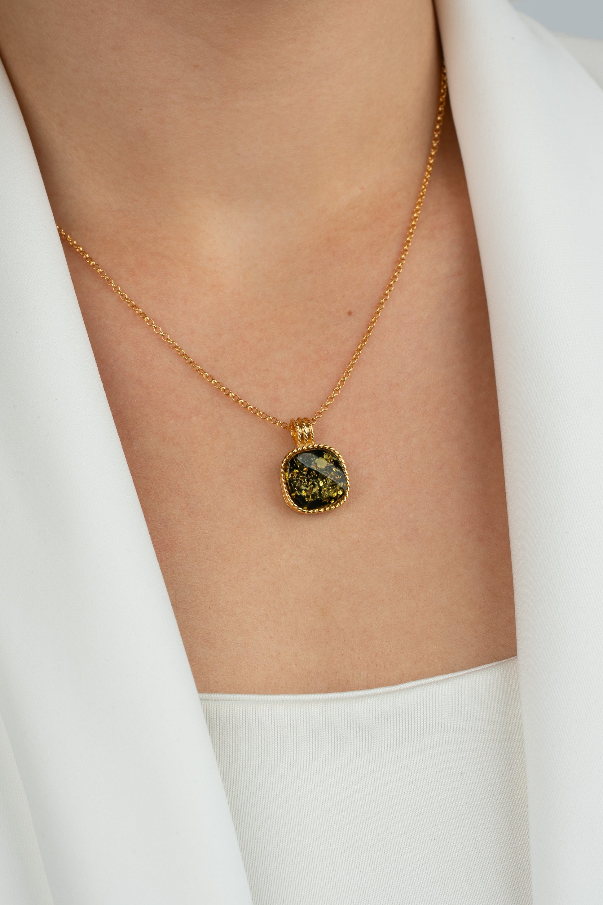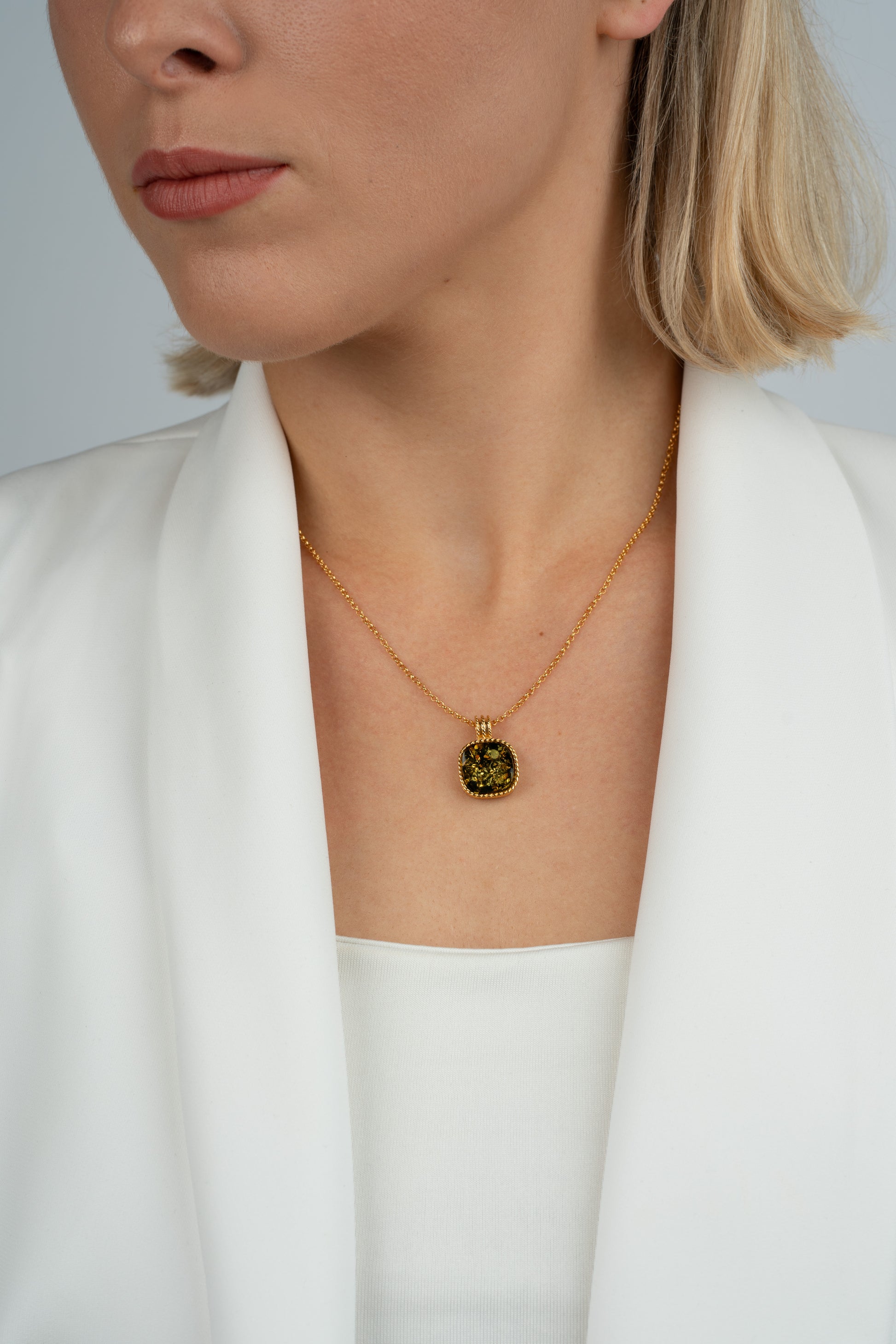 Šis vienetinis rankų darbo papuošalas, sukurtas Baltijos regiono meistro, atskleidžia autentiško Baltijos gintaro unikalumą. Netaisyklingos kvadrato formos žalias akmuo yra apgaubtas auksiniu rėmeliu, suteikiančiu pakabukui elegancijos ir modernaus prabangos.