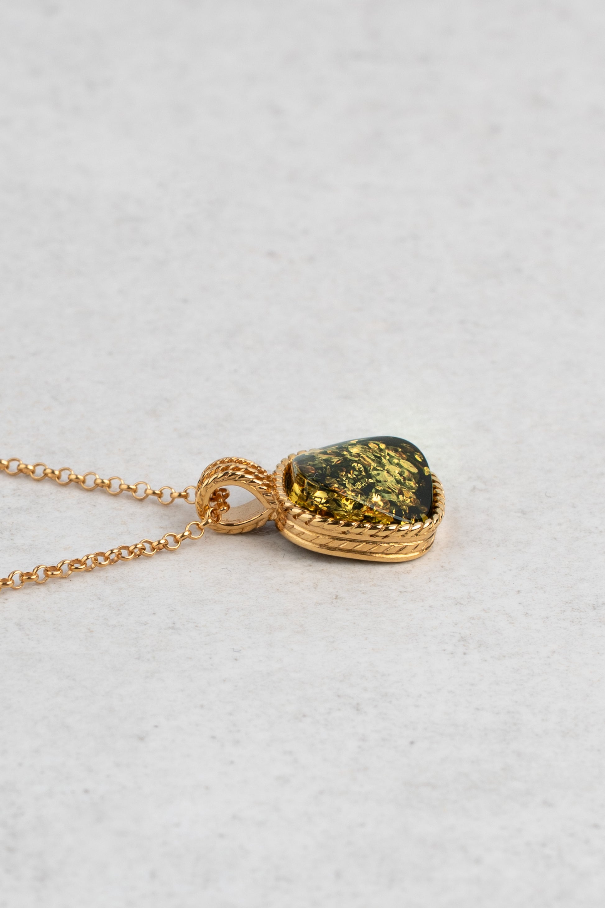 „Flamma Viridis“ (lot. „Žalioji liepsna“) – 24K paauksuotas gintarinis pakabukas su žaliu gintaru.