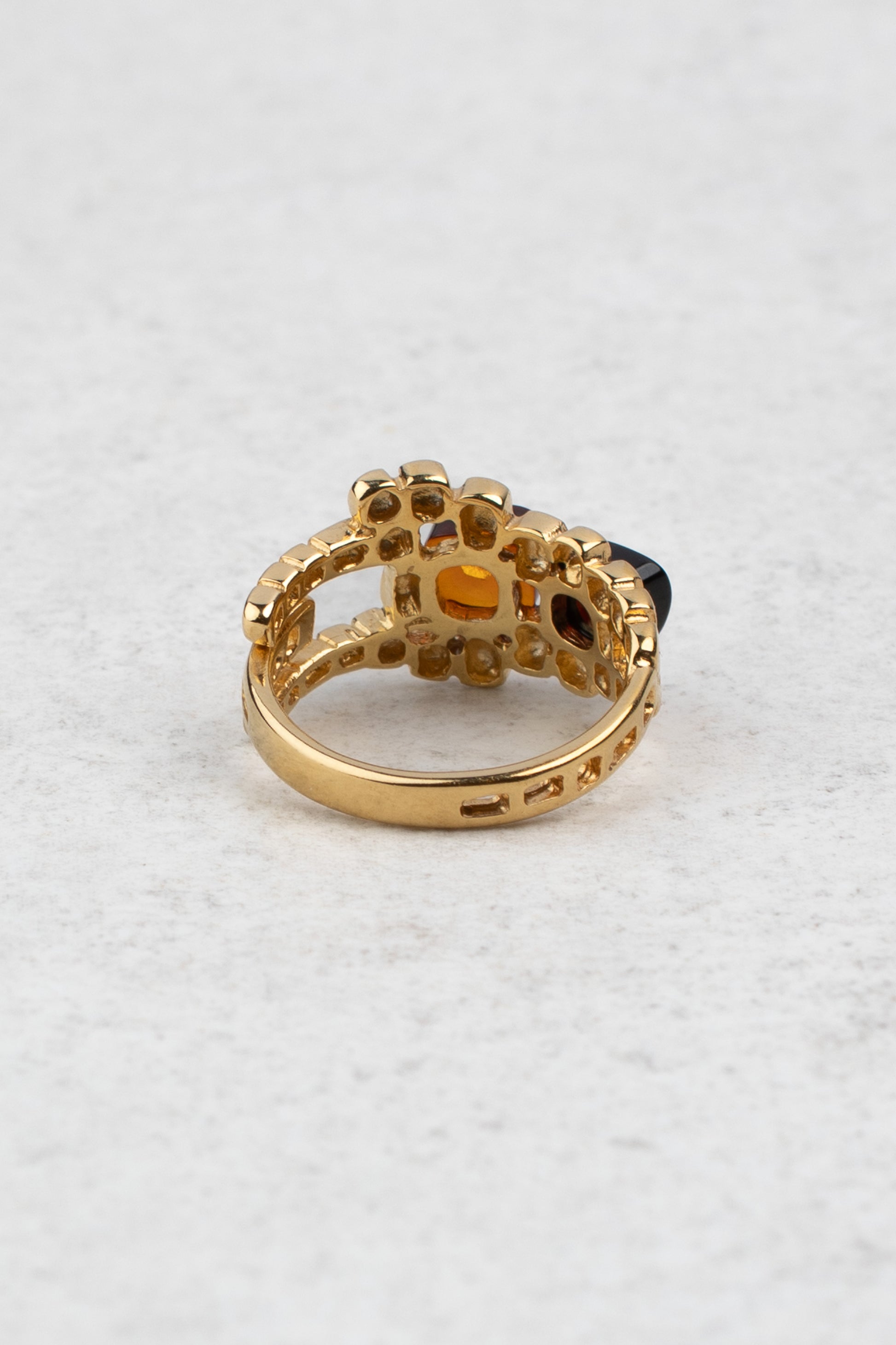 Šis dirbinys sujungia šiltą medaus spalvos Baltijos gintaro švytėjimą su vyšninio gintaro sodrumu, sukurdamas galingą kontrastą, kupiną charakterio. Meniškas paauksuotas žiedas su unikaliu geometriniu dizainu suteikia modernaus elegancijos pojūtį. Drąsus ir rafinuotas kūrinys, perteikiantis ir šviesos spindesį, ir šešėlio paslaptį.
