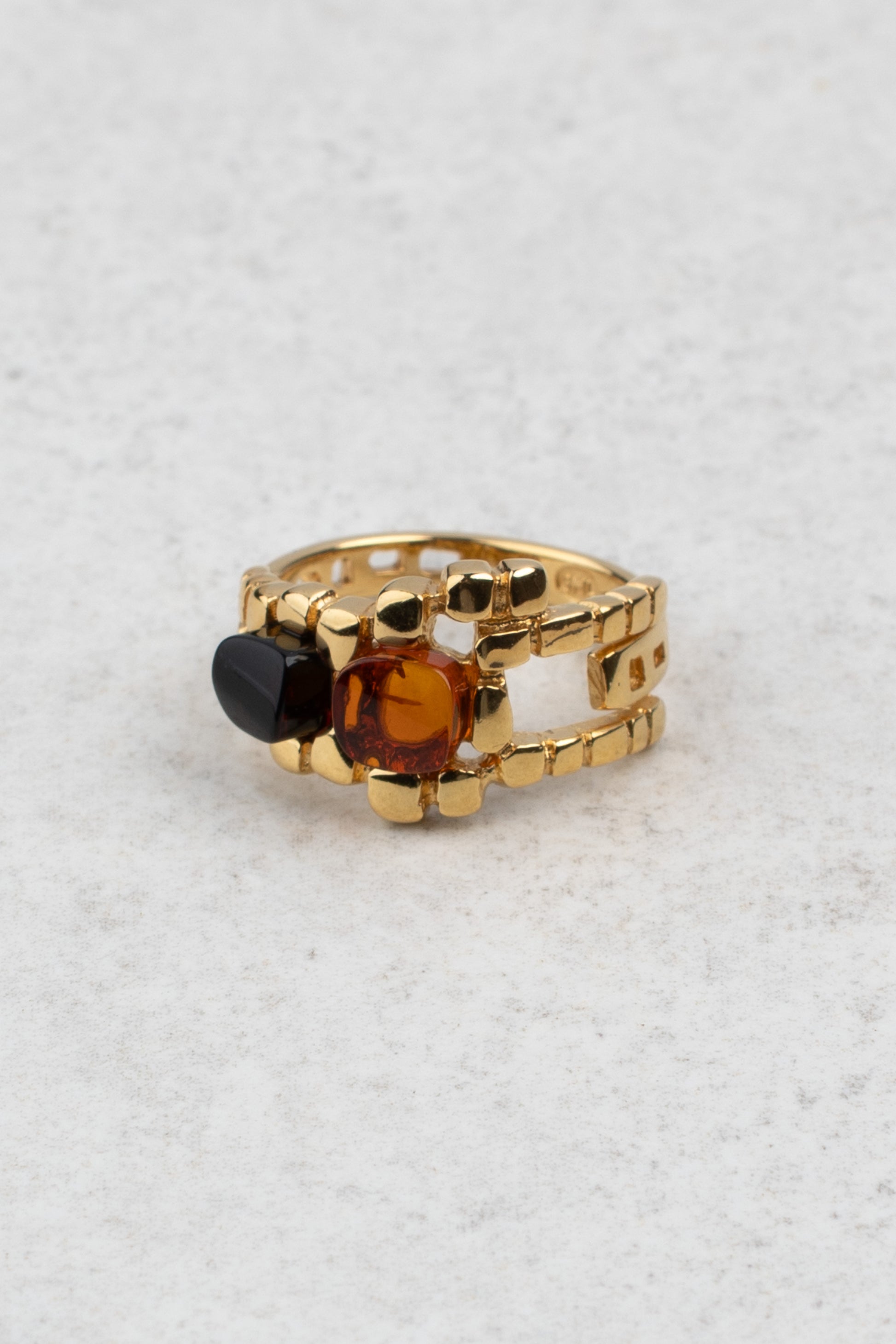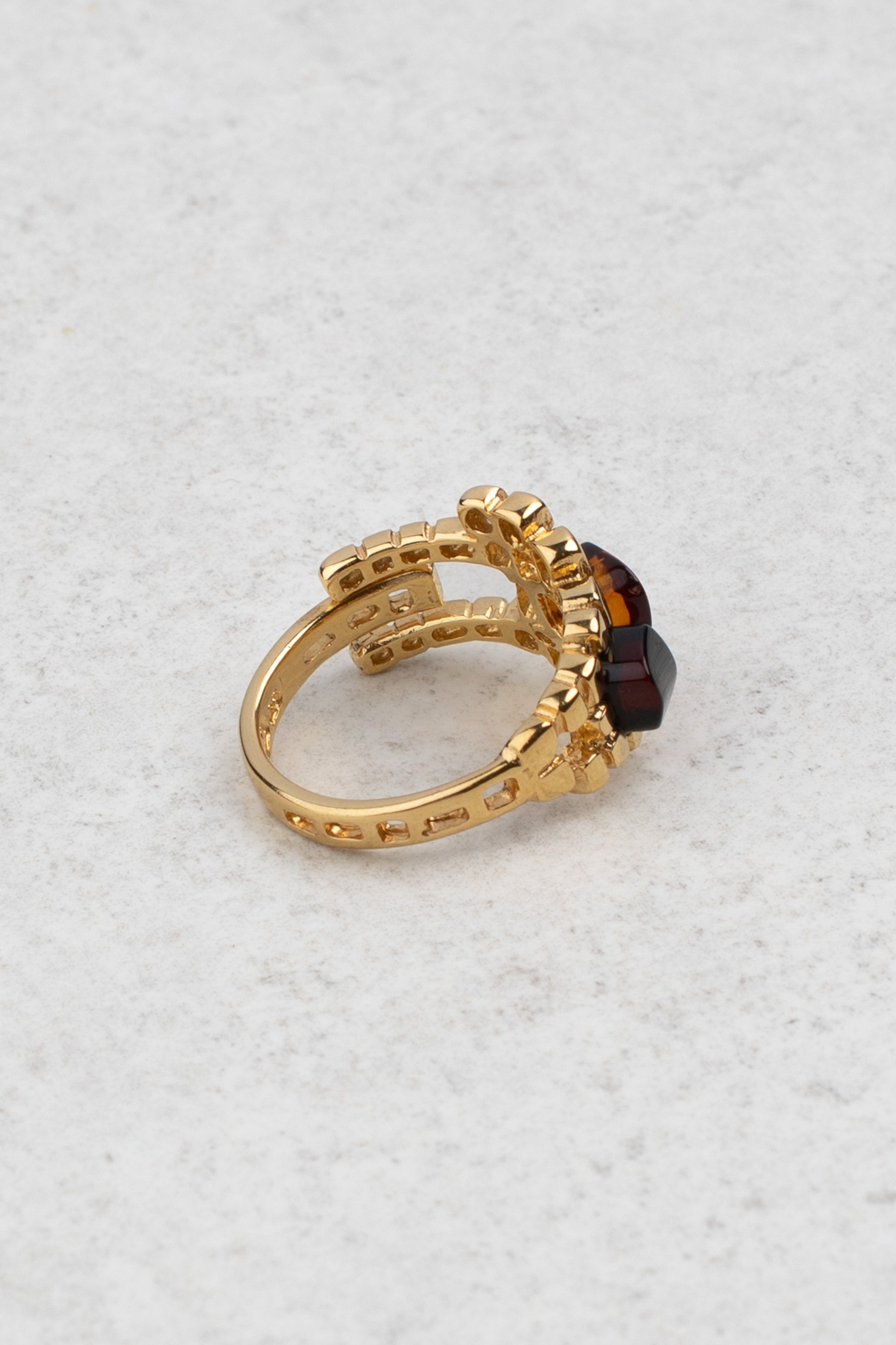 Paauksuotas gintarinis žiedas su medaus ir vyšnios spalvos gintaru "Aurum Tenebrae"