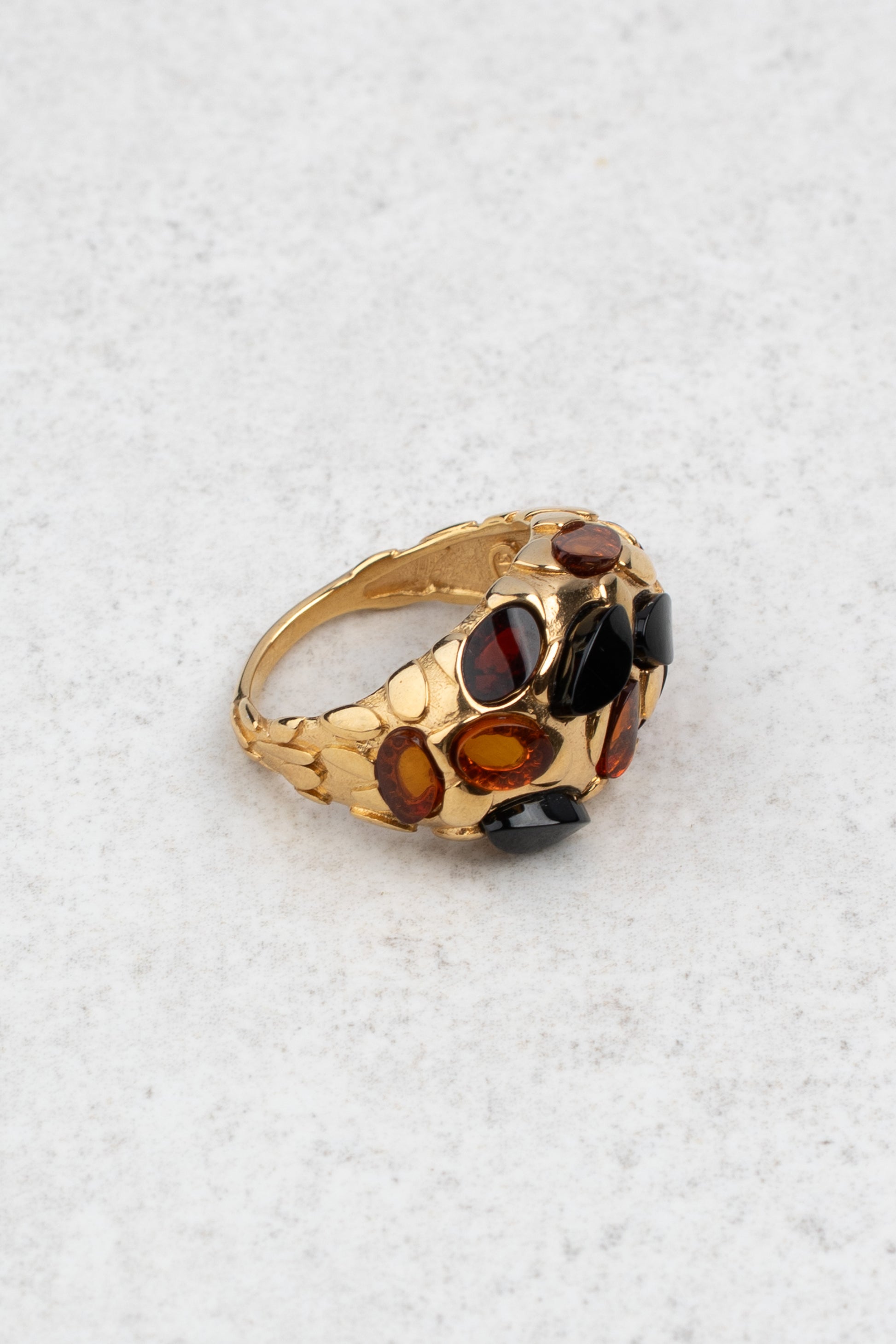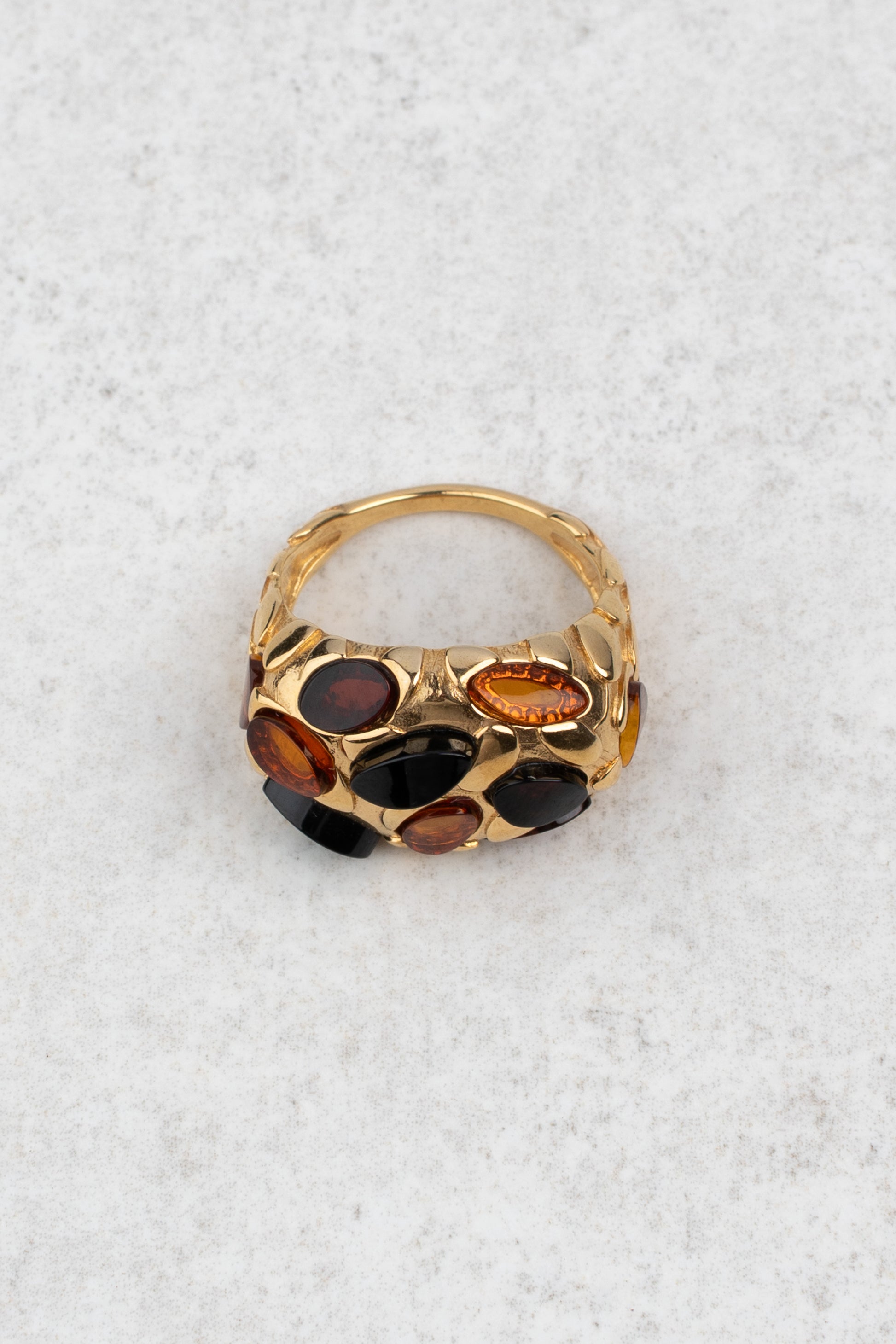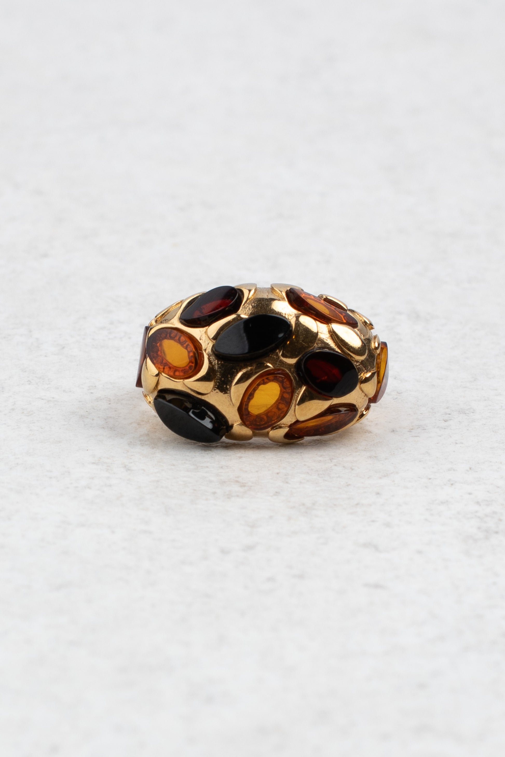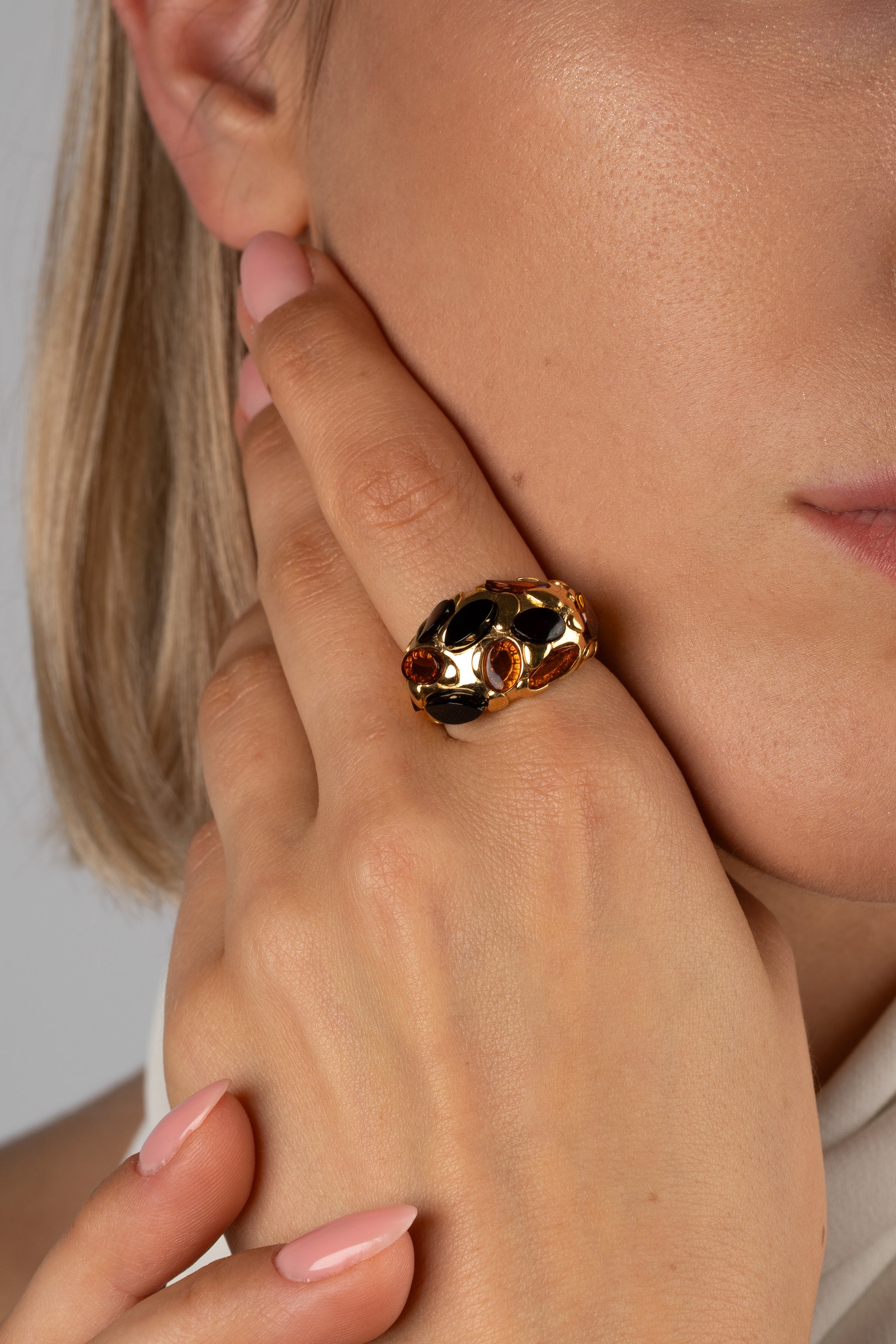 Šis drąsus ir rafinuotas žiedas atskleidžia kerintį autentiško Baltijos gintaro gylį. Sodrūs medaus, vyšnios ir gilios juodos spalvos tonai įkomponuoti į puošnų aukso dizainą, sukuriant ryškią spalvų ir šviesos harmoniją. Meniška struktūra sukelia paslapties ir nesenstančio elegancijos pojūtį.