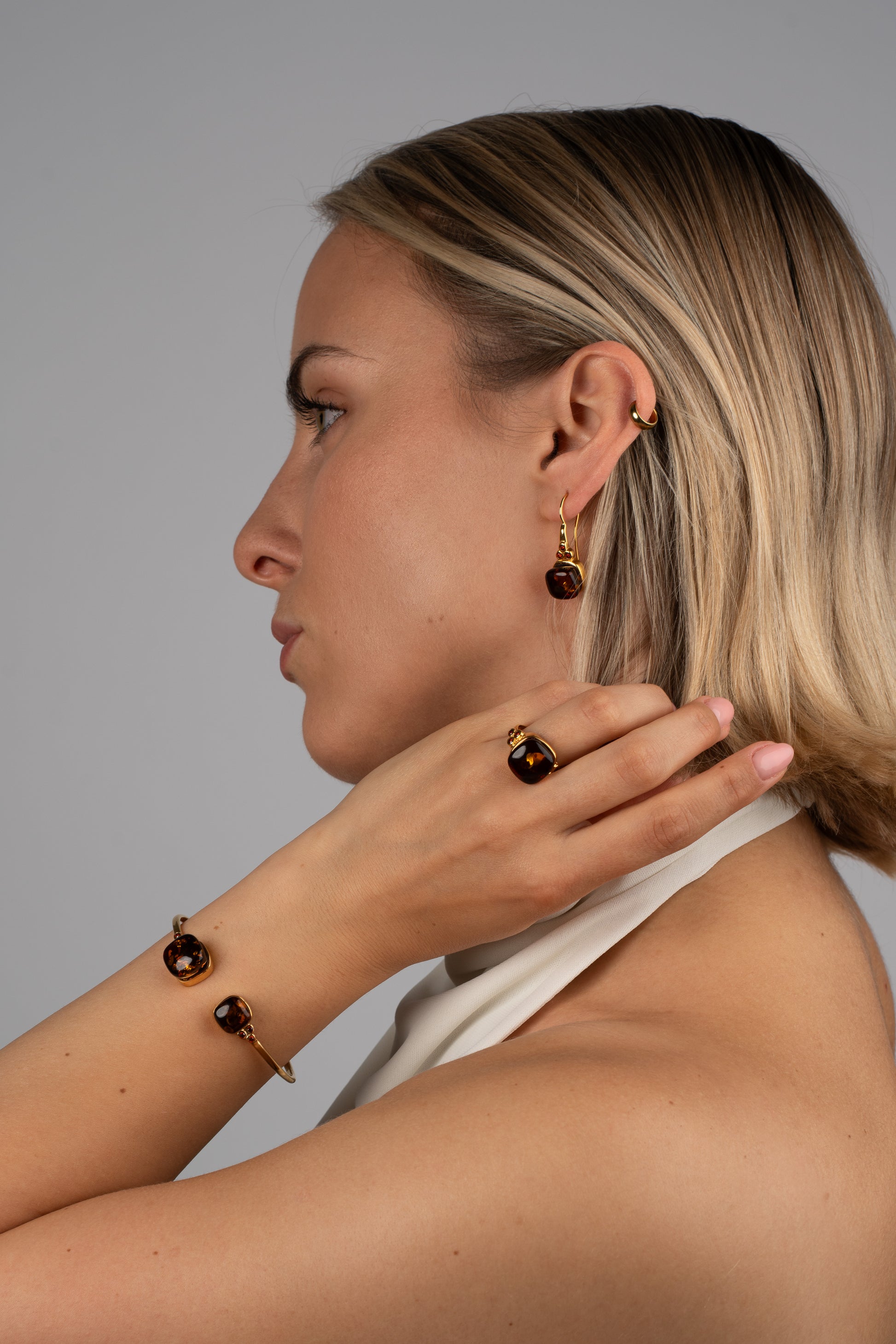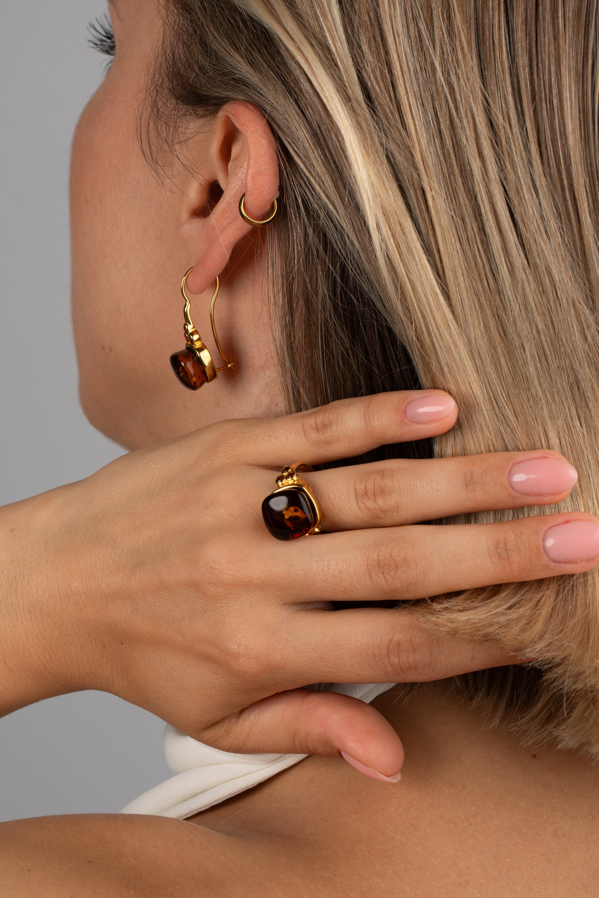 Šiltas medaus spalvos Baltijos gintaras švyti natūraliu grožiu, suteikdamas subtilios prabangos ir rafinuoto žavesio pojūtį. Auksinių detalių dizainas sustiprina gintaro švytinčią šilumą, sukurdamas harmoningą ir elegantišką kūrinį, kuriame derinamas natūralus Baltijos gintaro žavesys ir modernus rafinuotumas.
