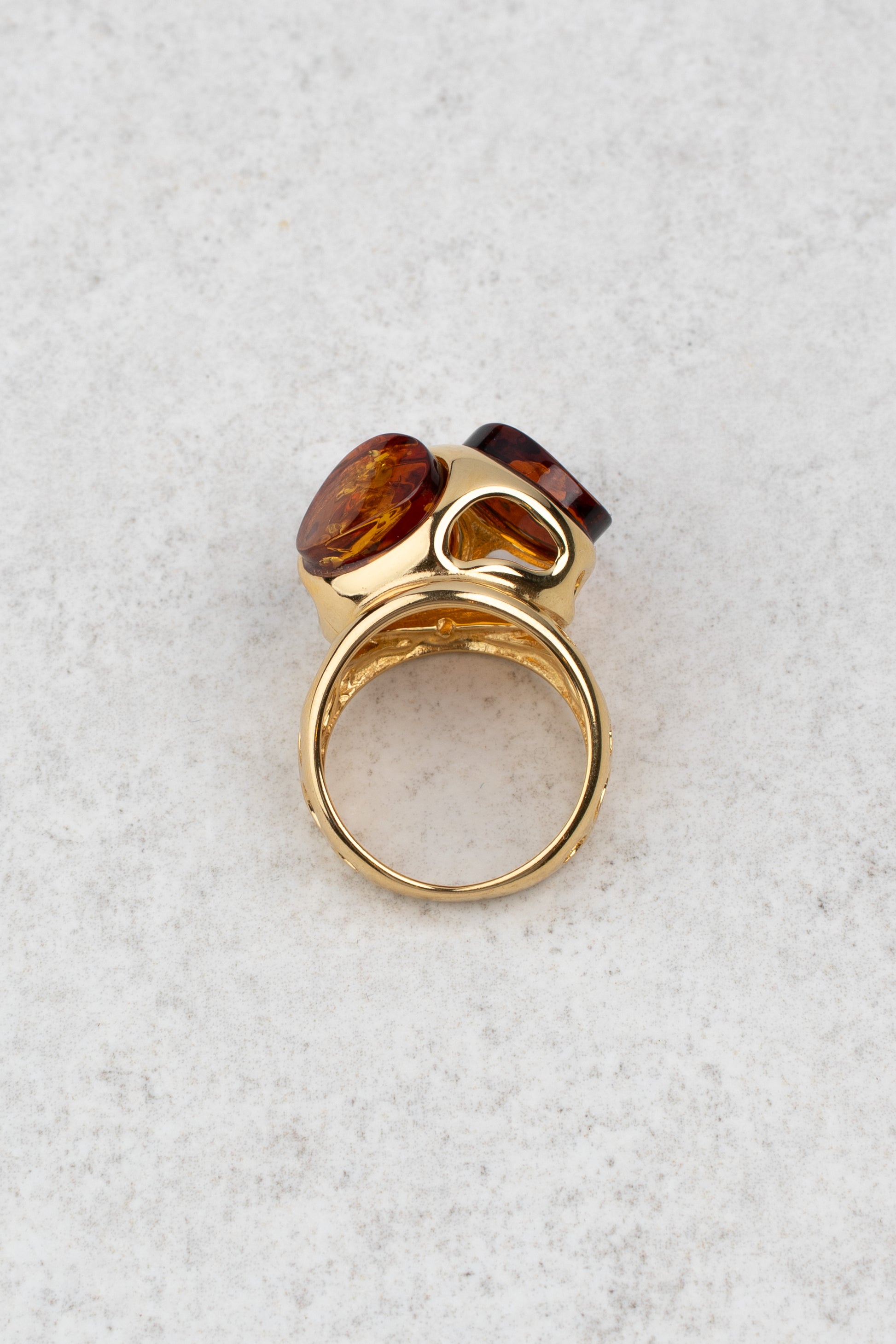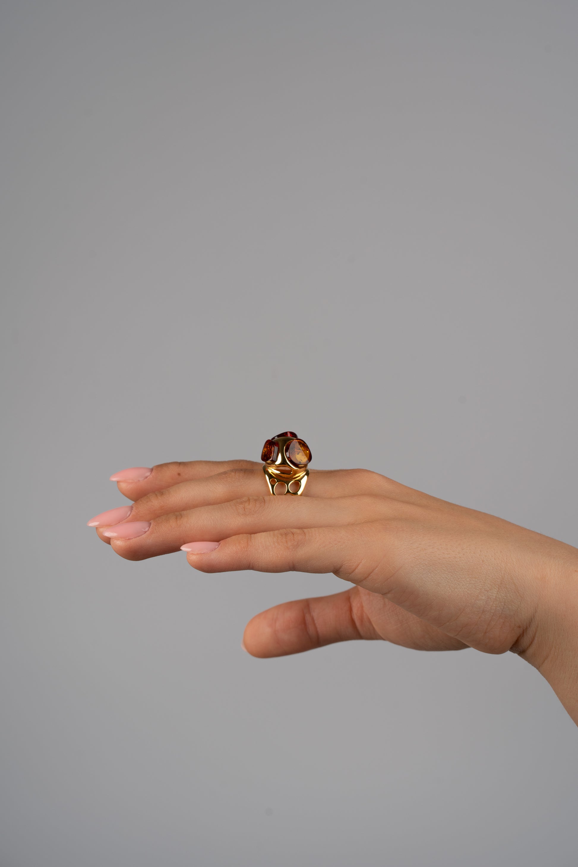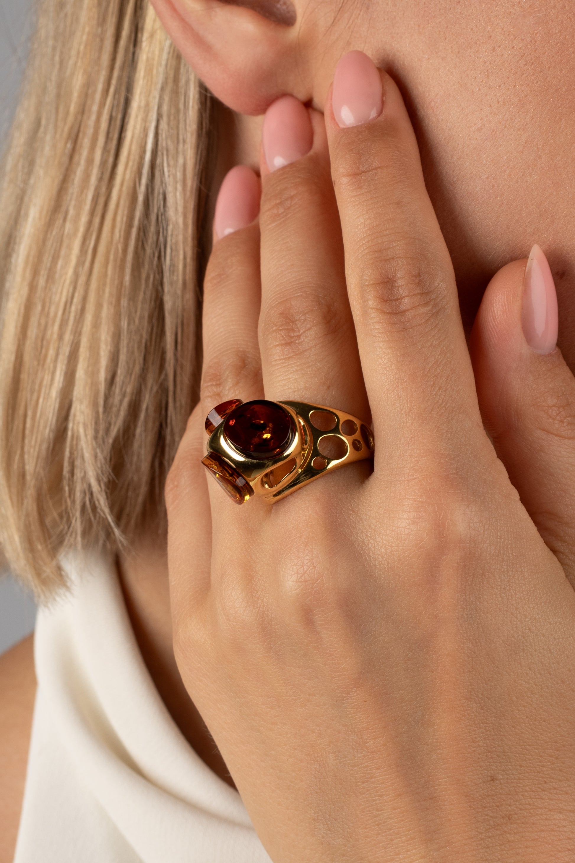 Šis elegantiškas rankų darbo žiedas atskleidžia Baltijos gintaro grožį šiltuose medaus ir sodriuose konjako atspalviuose. Skulptūriškas auksinis dizainas įrėmina gintarą lyg pražydusi gėlė, spinduliuojanti natūralia šviesa ir šiluma. Tai prabangus ir rafinuotas papuošalas, kuriame dera šiuolaikinė meistrystė ir nesenstantis grožis, jungiantis gamtos eleganciją su išskirtine prabanga.