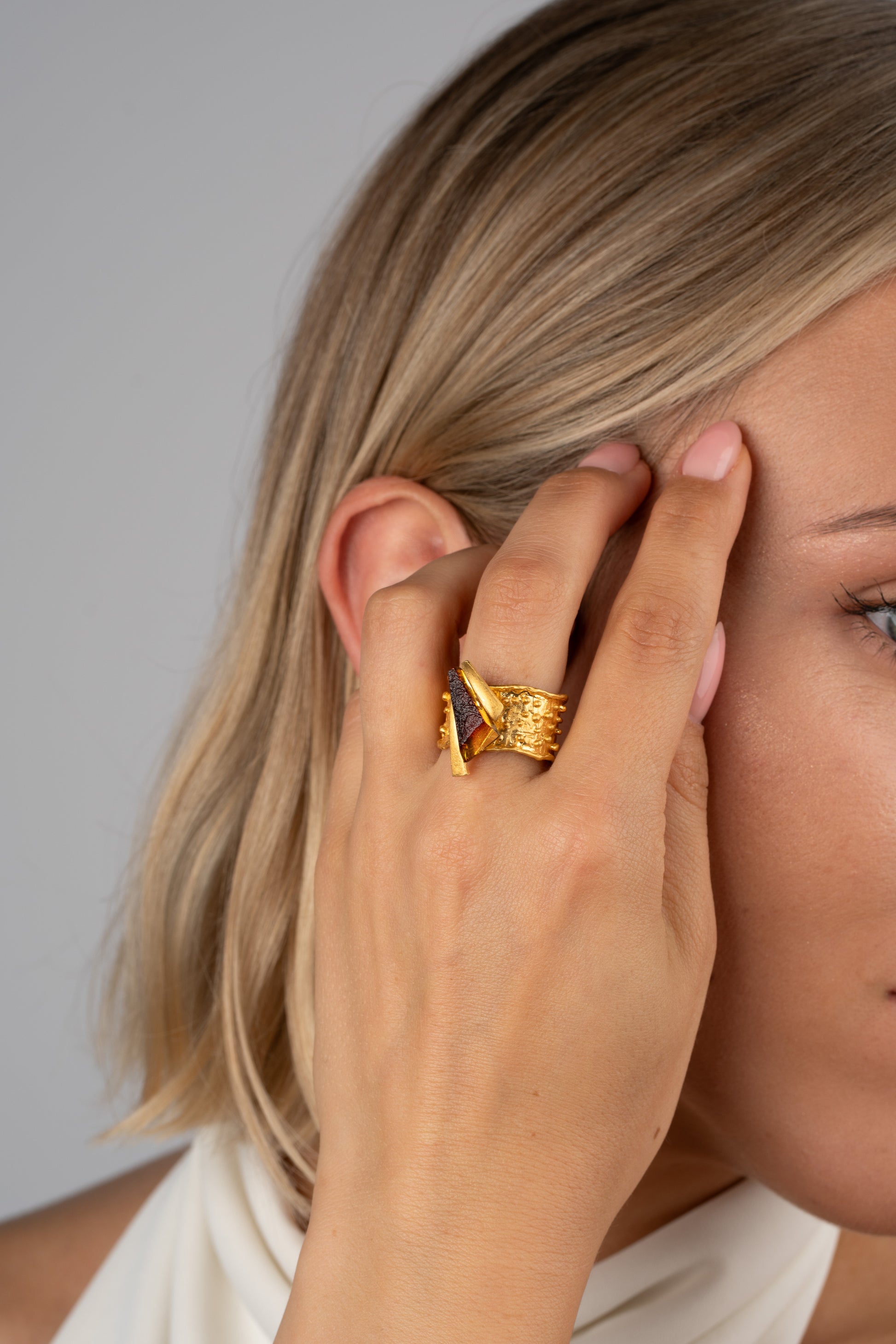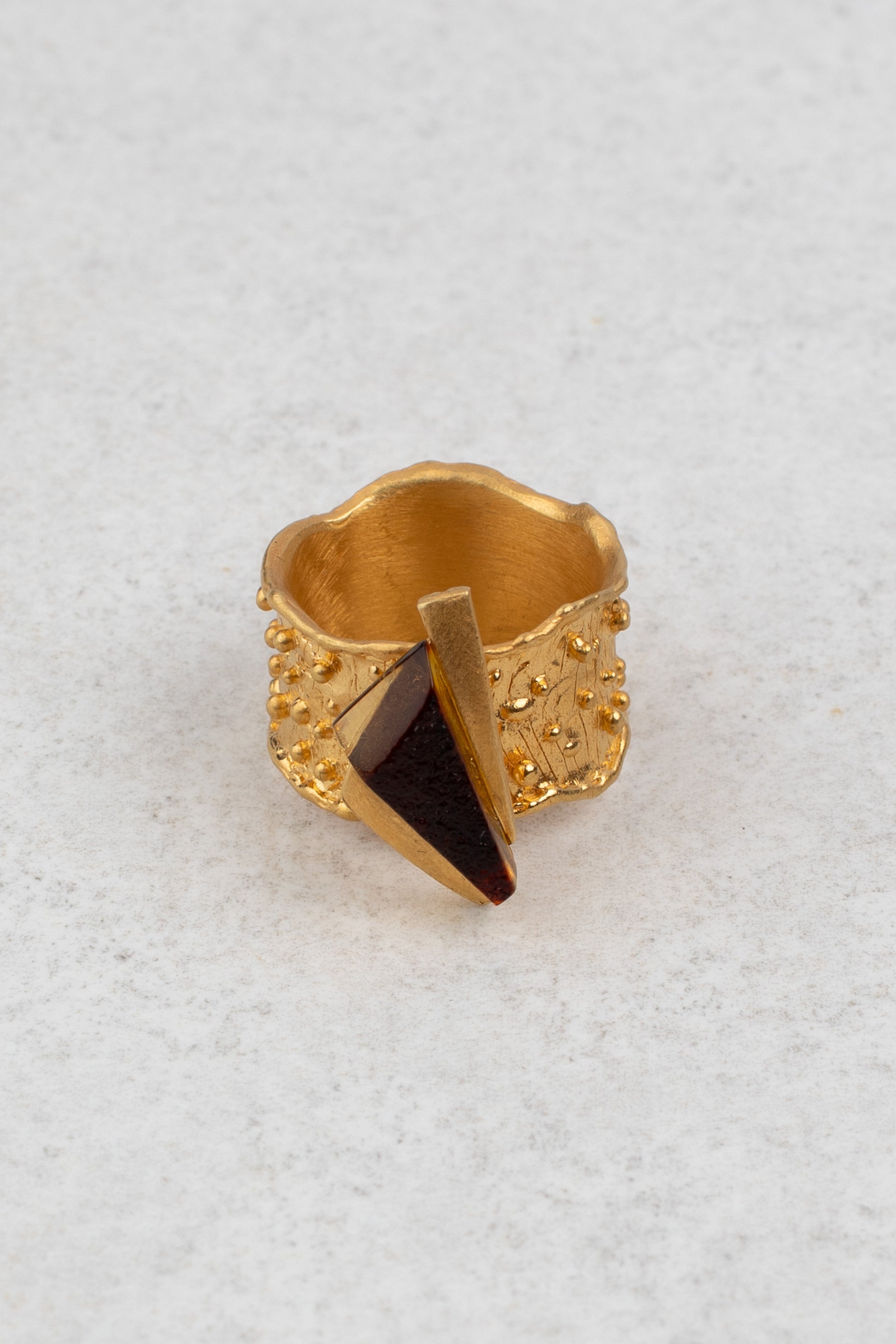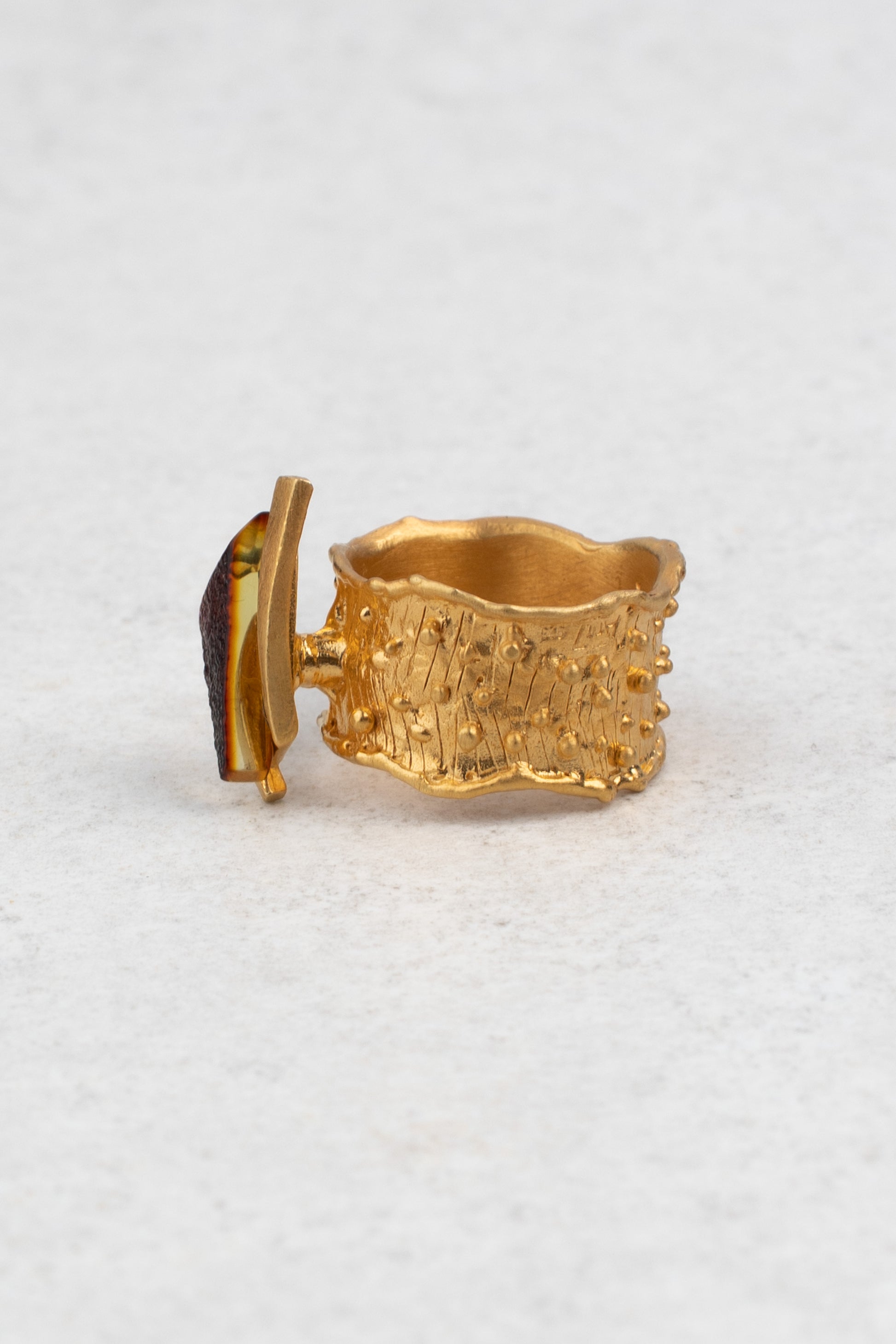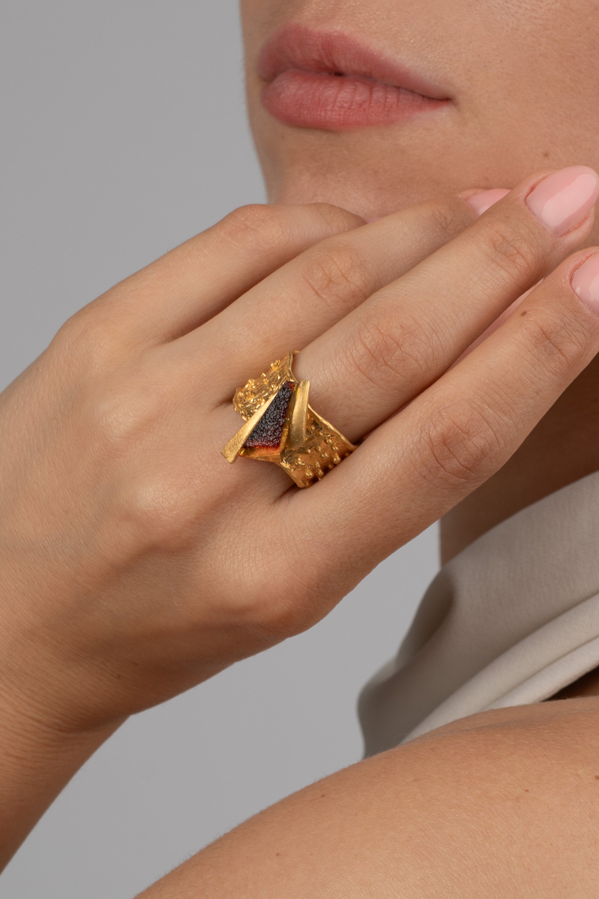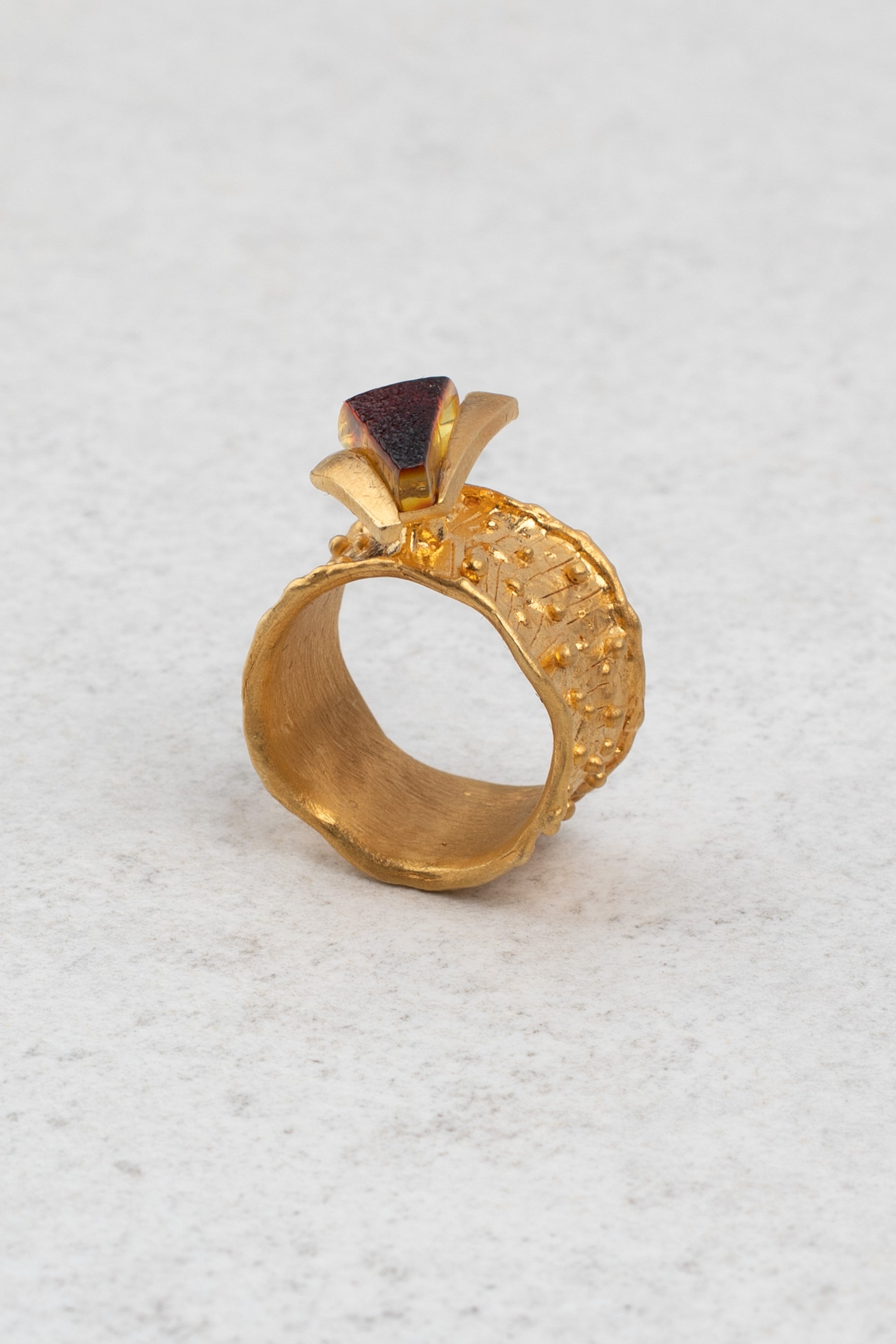“Aurea Radix” (lot. „Auksinė šaknis“) – 24K paauksuotas matinio aukso žiedas su vyšnios spalvos gintaru. Šis rankų darbo žiedas atskleidžia sodrias ir šiltas Baltijos gintaro spalvas, o gilus vyšnios atspalvis spinduliuoja natūralų elegantiškumą. Netaisyklingos, subtiliai struktūruotos aukso detalės suteikia žiedui prabangos ir architektūrinę įdomybę, derindamos modernumą su nesenstančiu rafinuotumu. Tai išskirtinis kūrinys, kuriame susilieja natūralus grožis, elegancija ir originali formos raiška.