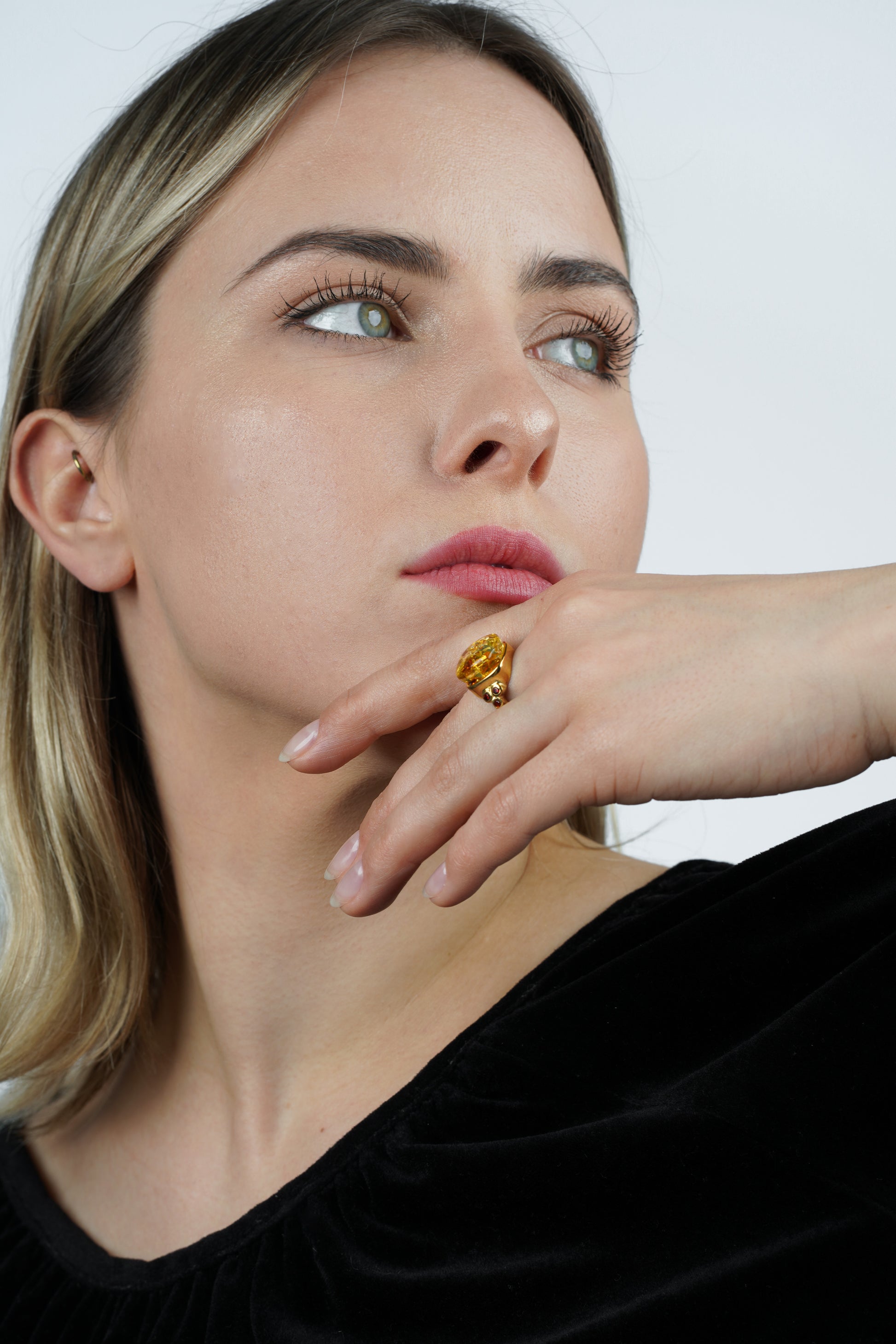 „Aurum Umbrae“ (lot. „Auksinis šešėlis“) – 24K paauksuotas gintarinis žiedas su geltonuoju gintaru.
