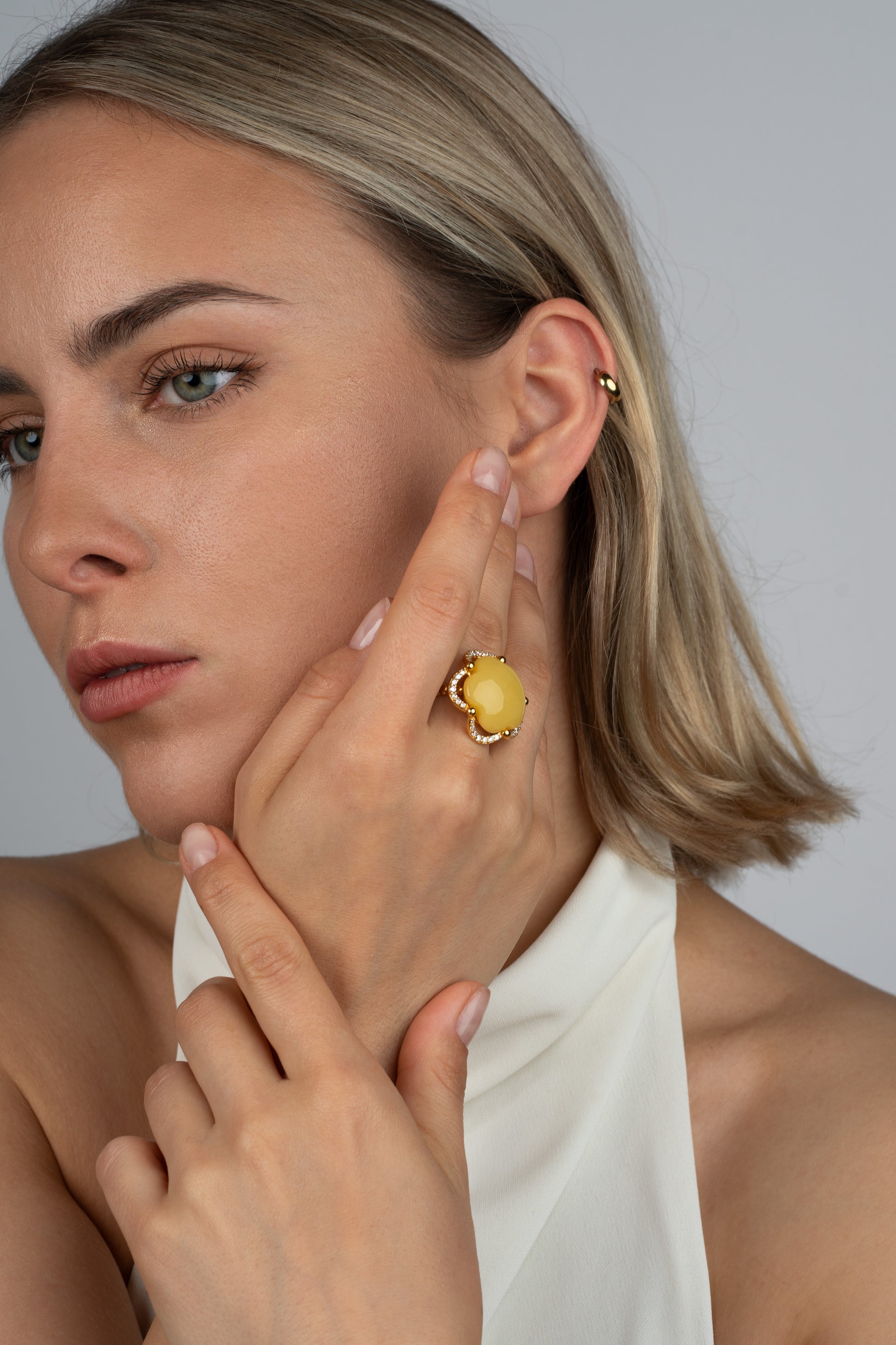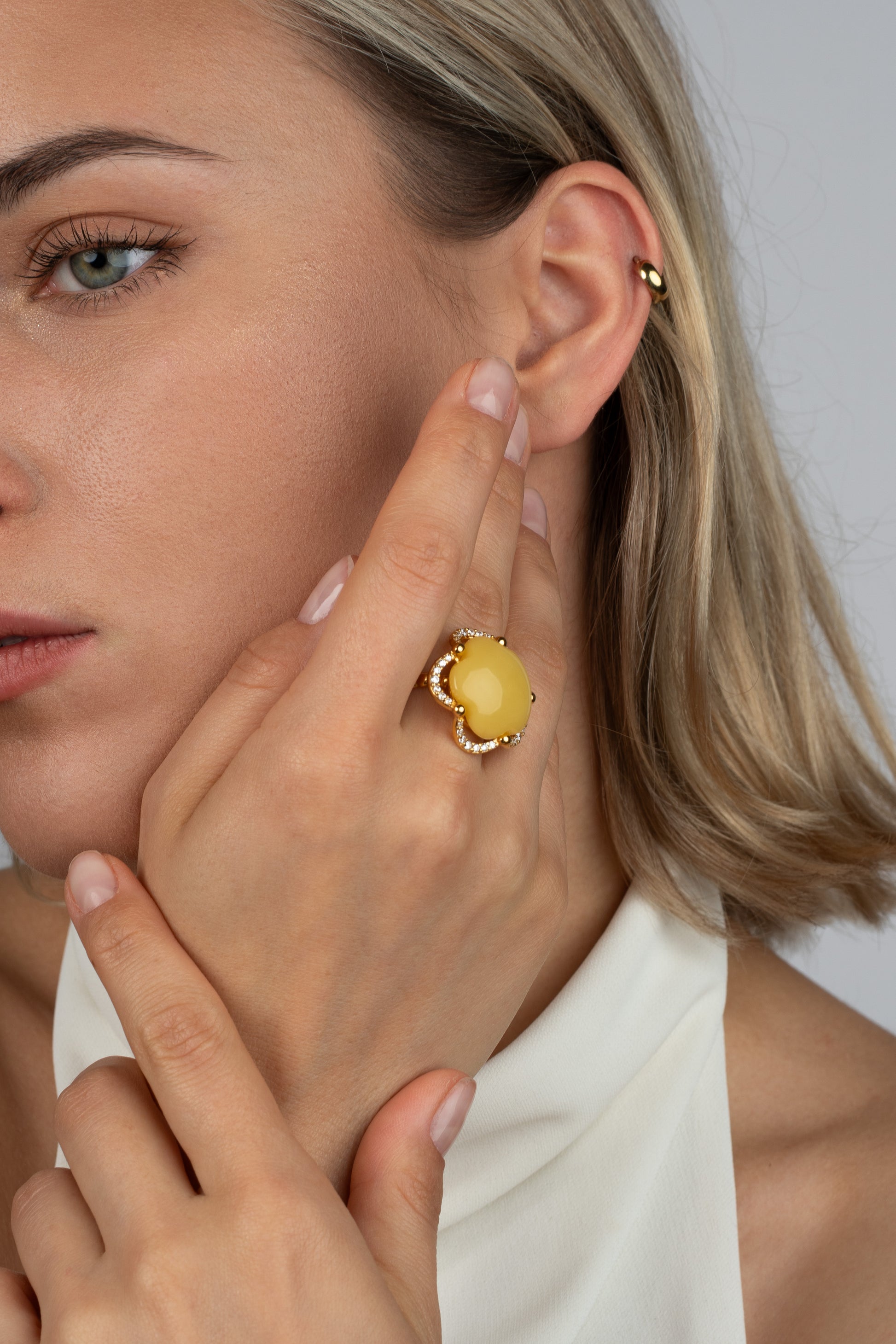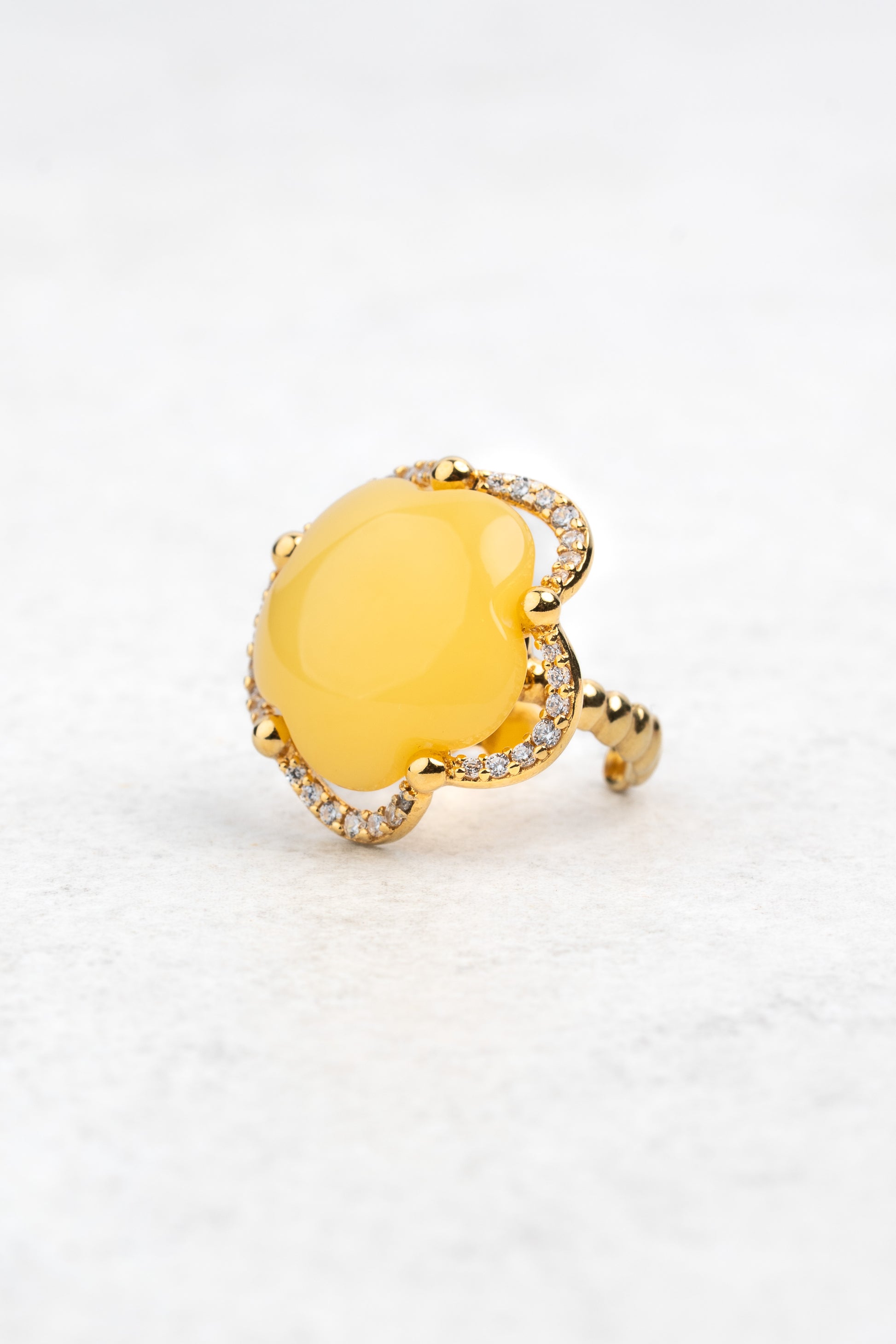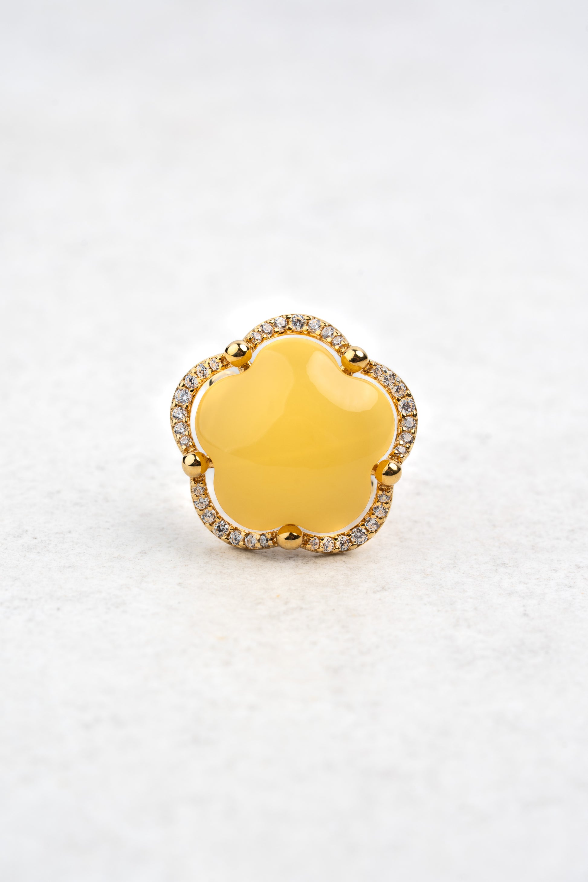 Švelnus geltonas gintaras centre spinduliuoja šilumą ir gyvybingumą, jį įrėmina subtilus žėrinčių akmenų aureolė, primenanti saulės šviesos paliestus žiedlapius. Šis dizainas perteikia natūralaus grožio ir rafinuoto meistriškumo harmoniją.