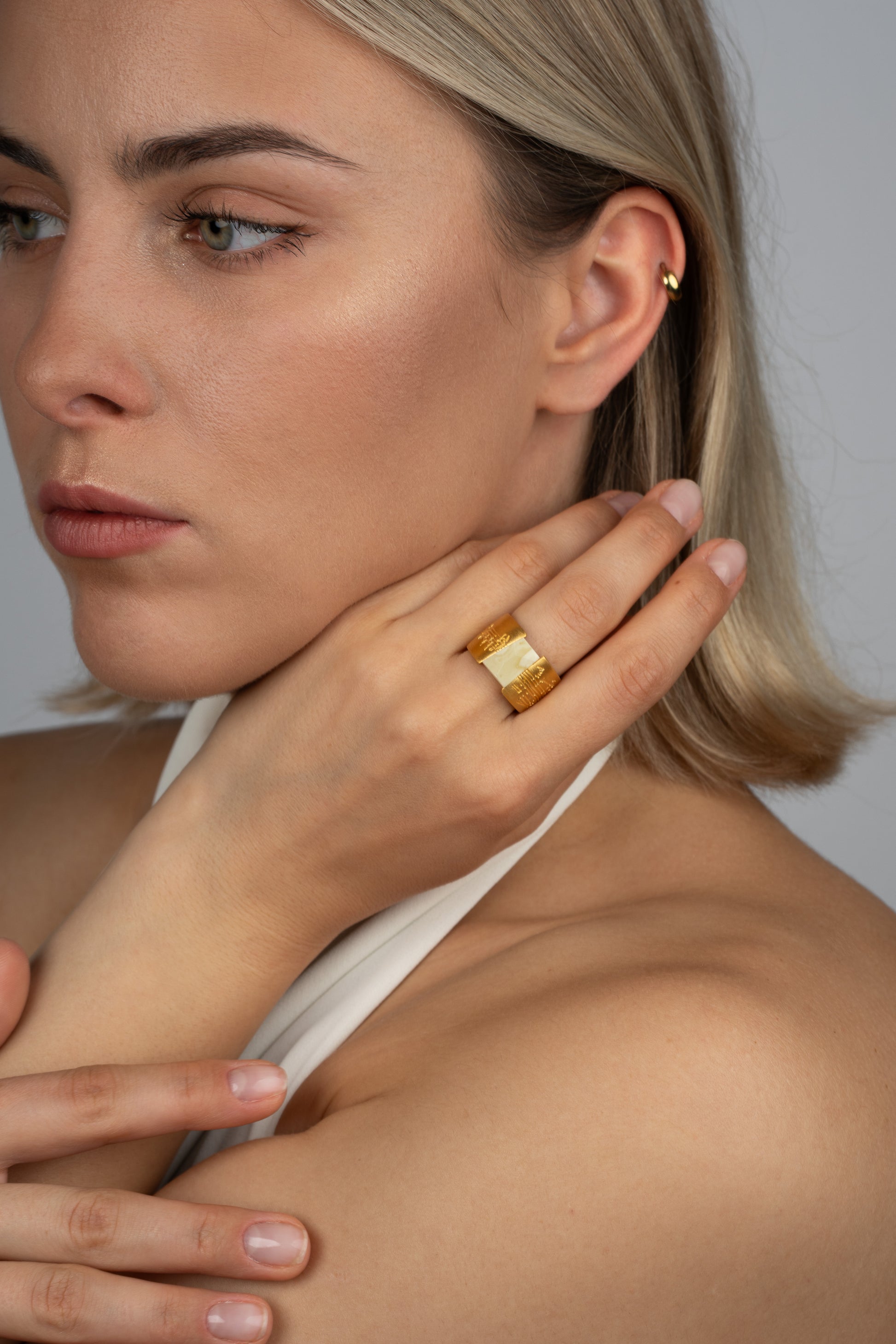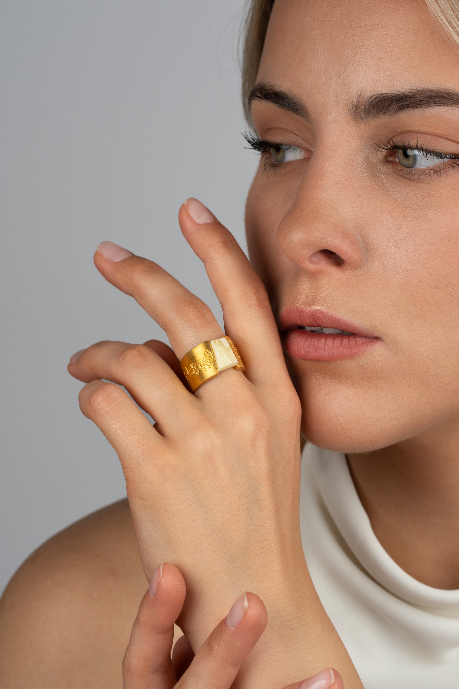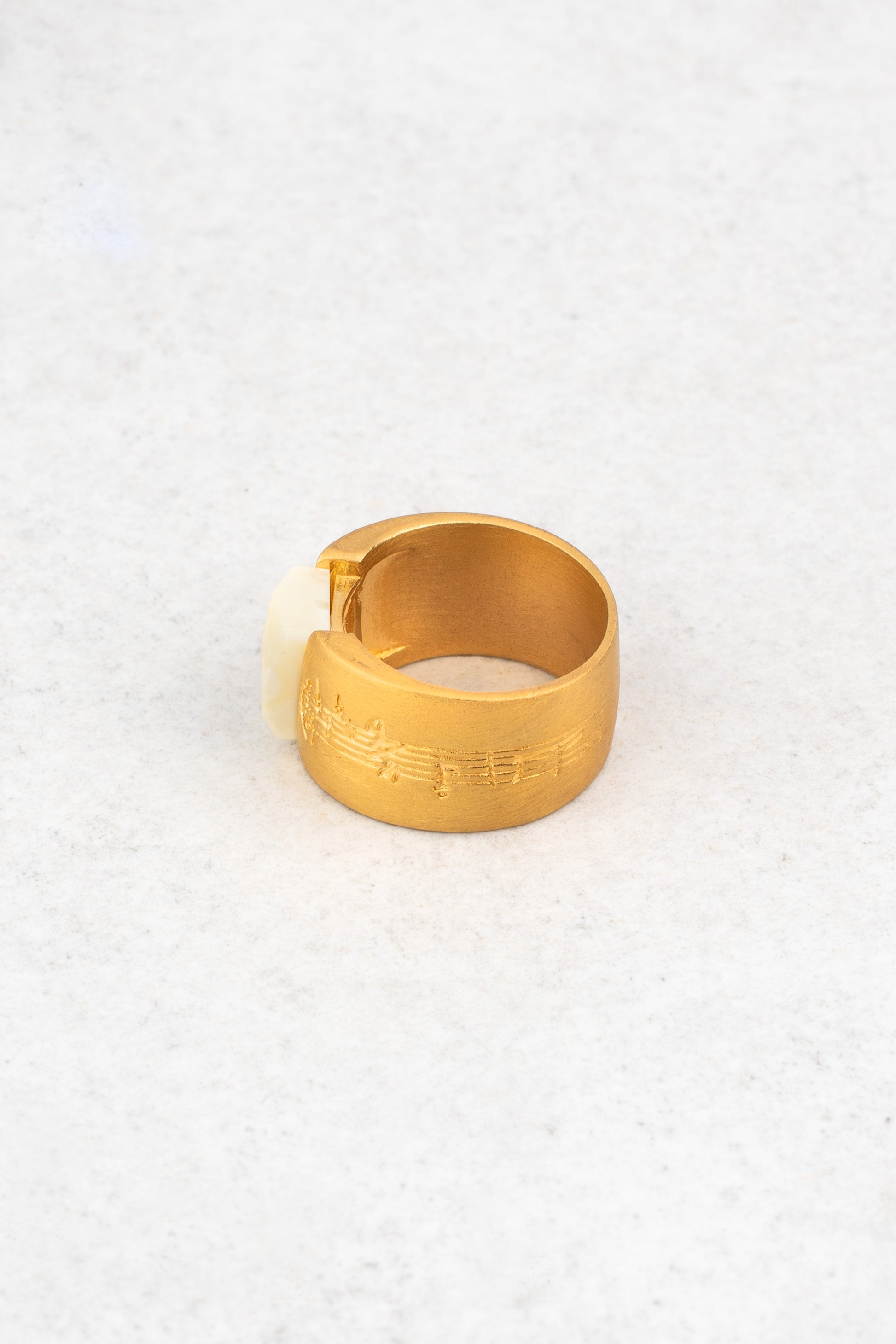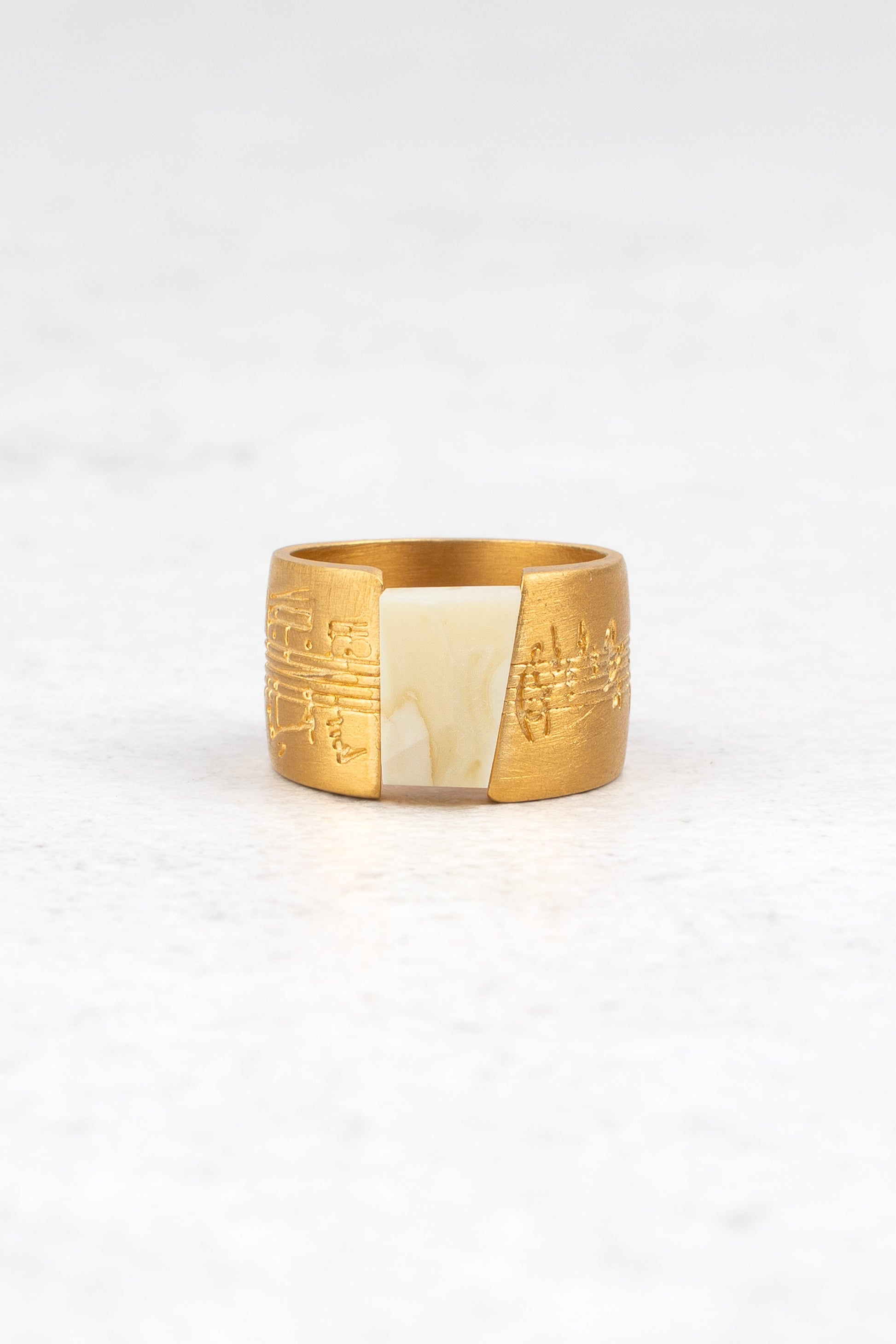 Žiedą puošia ryškus baltasis gintaras, inkrustuotas matinio aukso juostoje, graviruotais simboliais. Dizainas įkūnija jėgą ir tyrumą, primindamas dangaus tylą ir nesenstantį gamtos grožį.