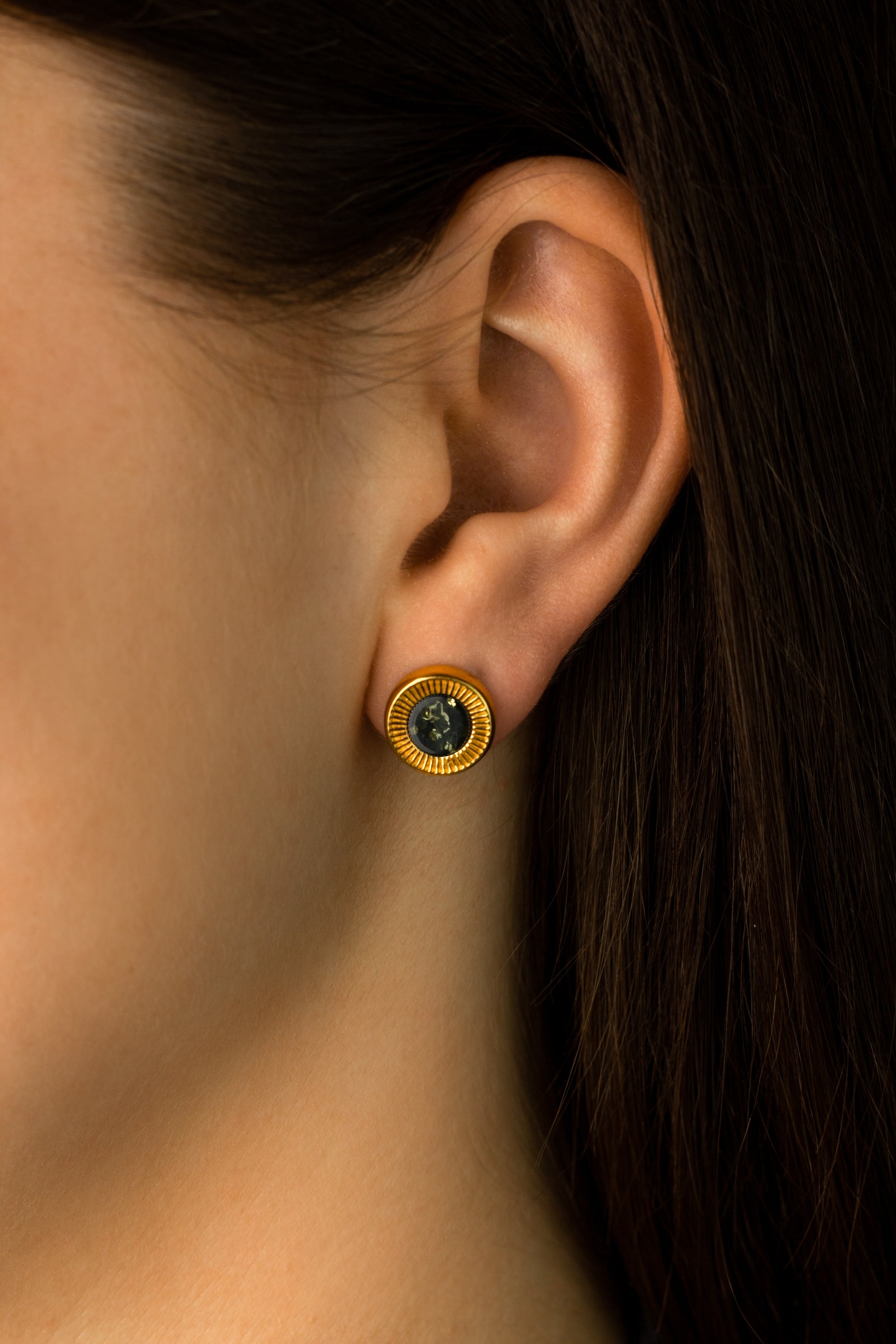 Paauksuoti žaliojo gintaro auskarai „Aurea Solis“ (lot. „Auksinė saulė“) – elegantiško dizaino žalios spalvos Baltijos gintaru, apsupti detalaus, tekstūruoto 24 karatų paauksuoto rėmelio.