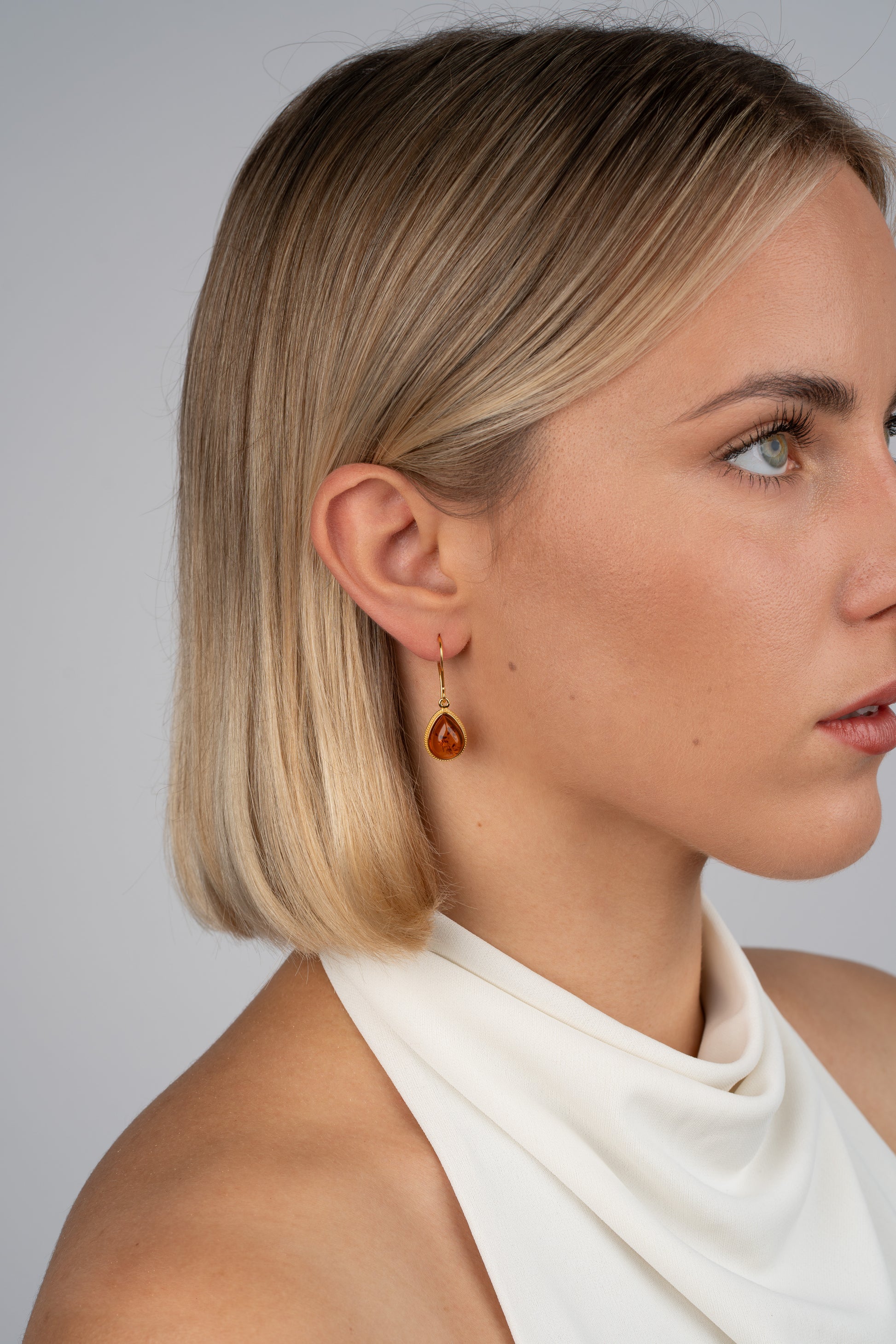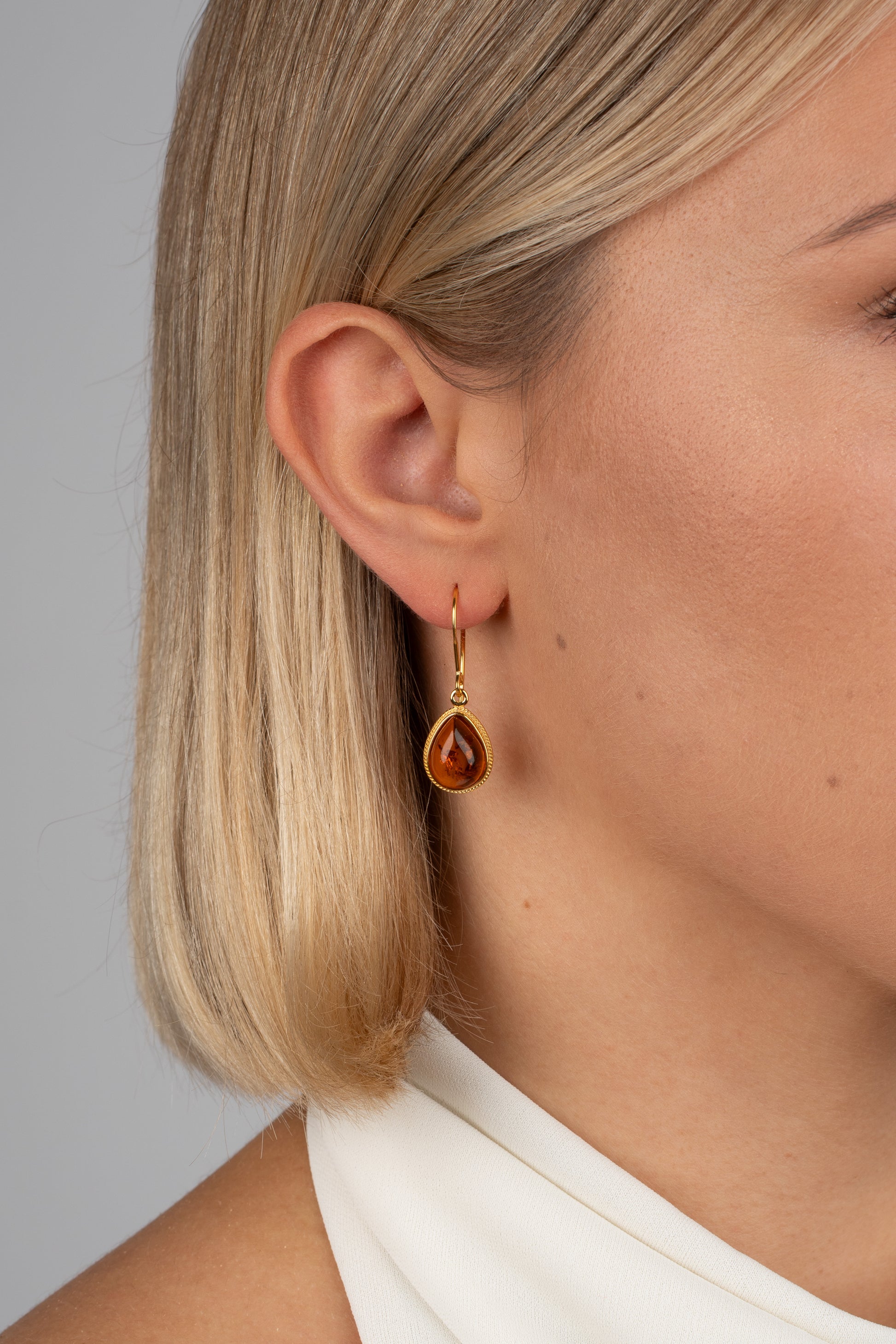 „Gutta Mundi“ (lot. „Pasaulio lašas“) – rankų darbo gintariniai auskarai, dengti 24k auksu, su natūraliu konjako atspalvio Baltijos gintaru.