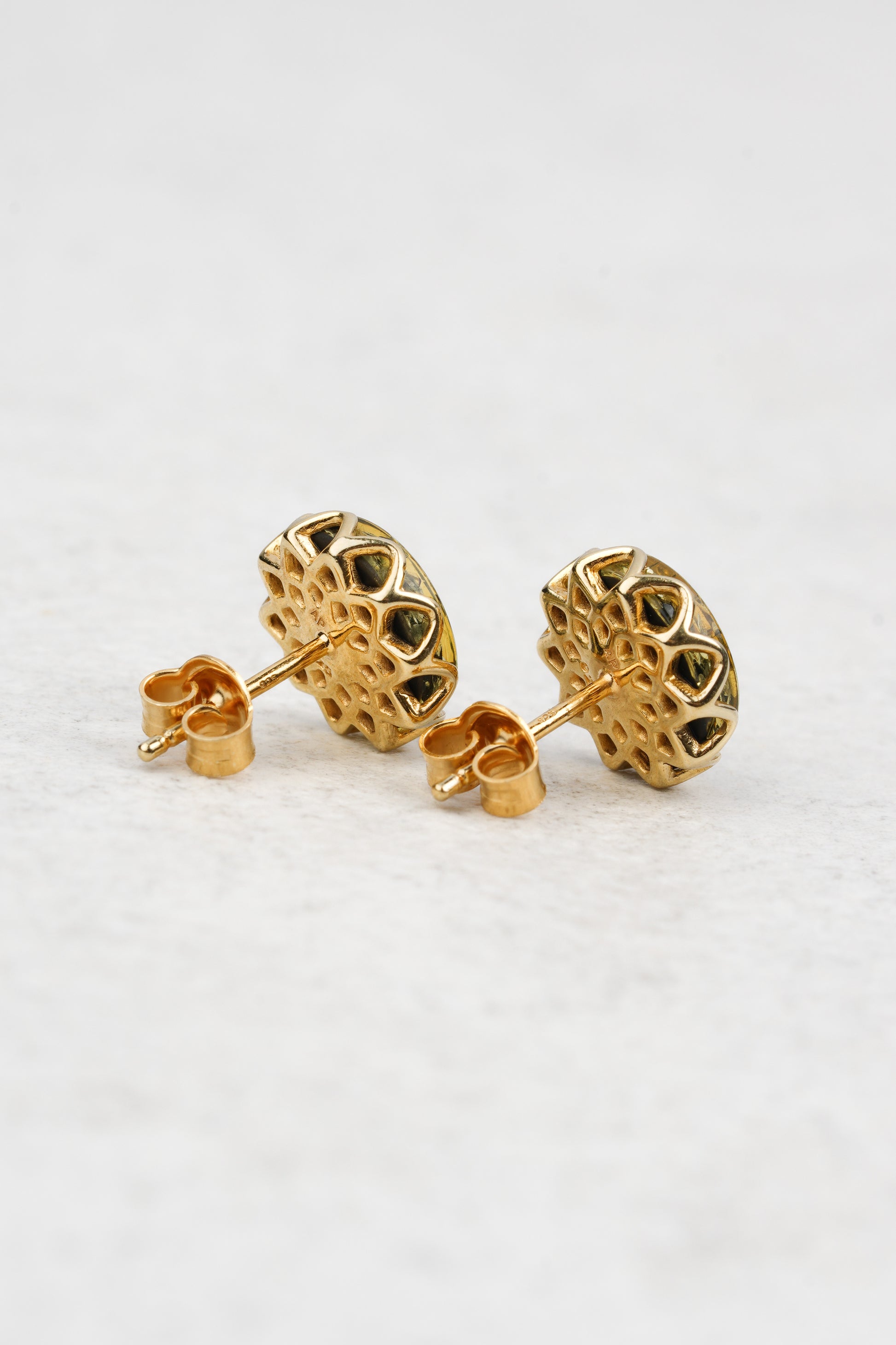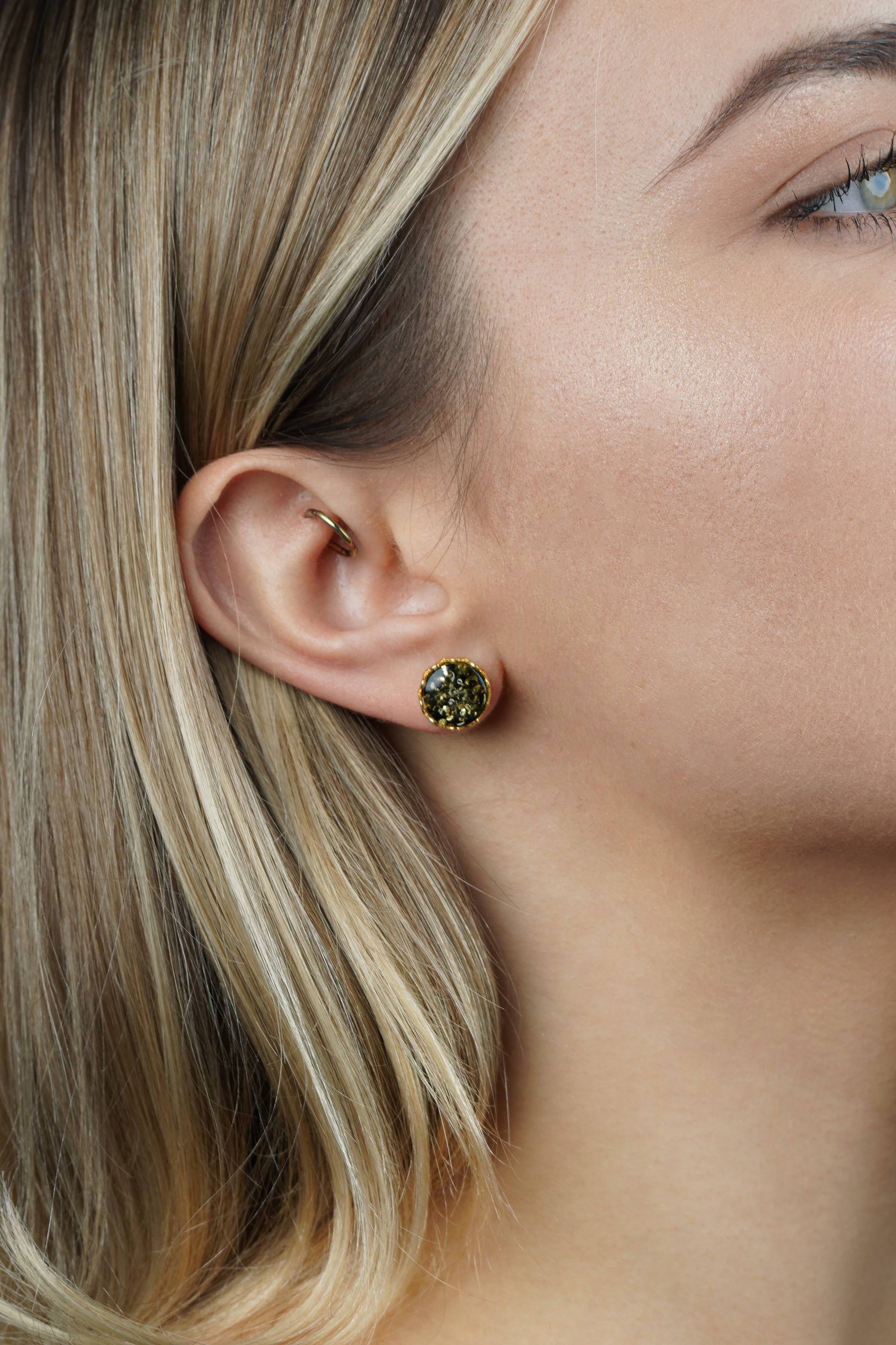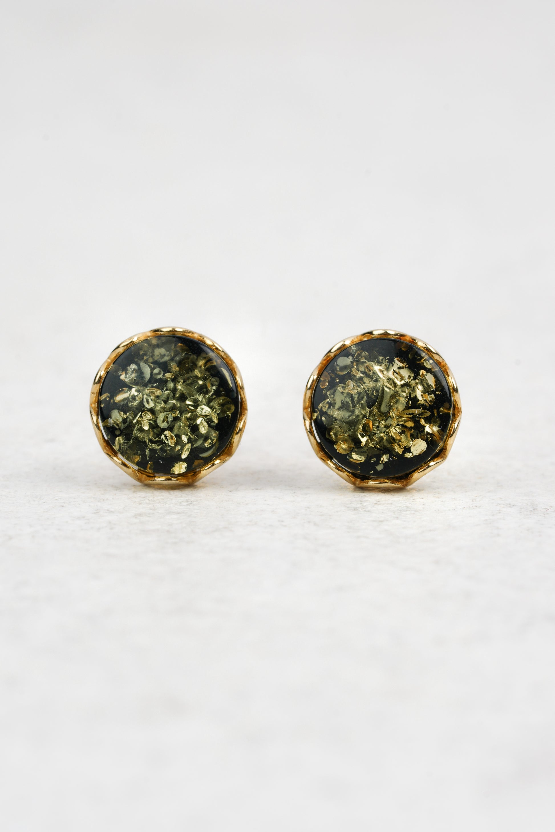 Paauksuoti žaliojo gintaro auskarai „„Nympha Succini“ (lot. „Gintaro nimfa“) – elegantiško dizaino žalios spalvos Baltijos gintaru, apsupti detalaus, tekstūruoto 24 karatų paauksuoto rėmelio.