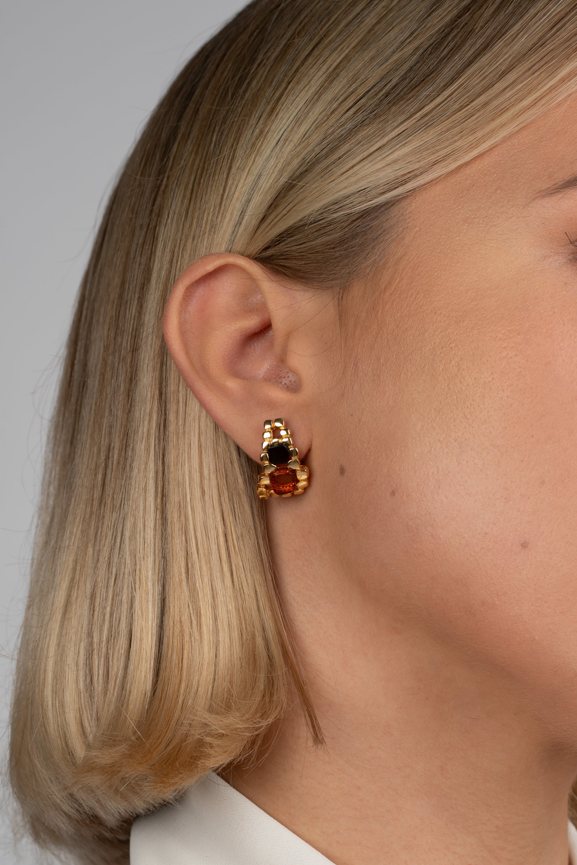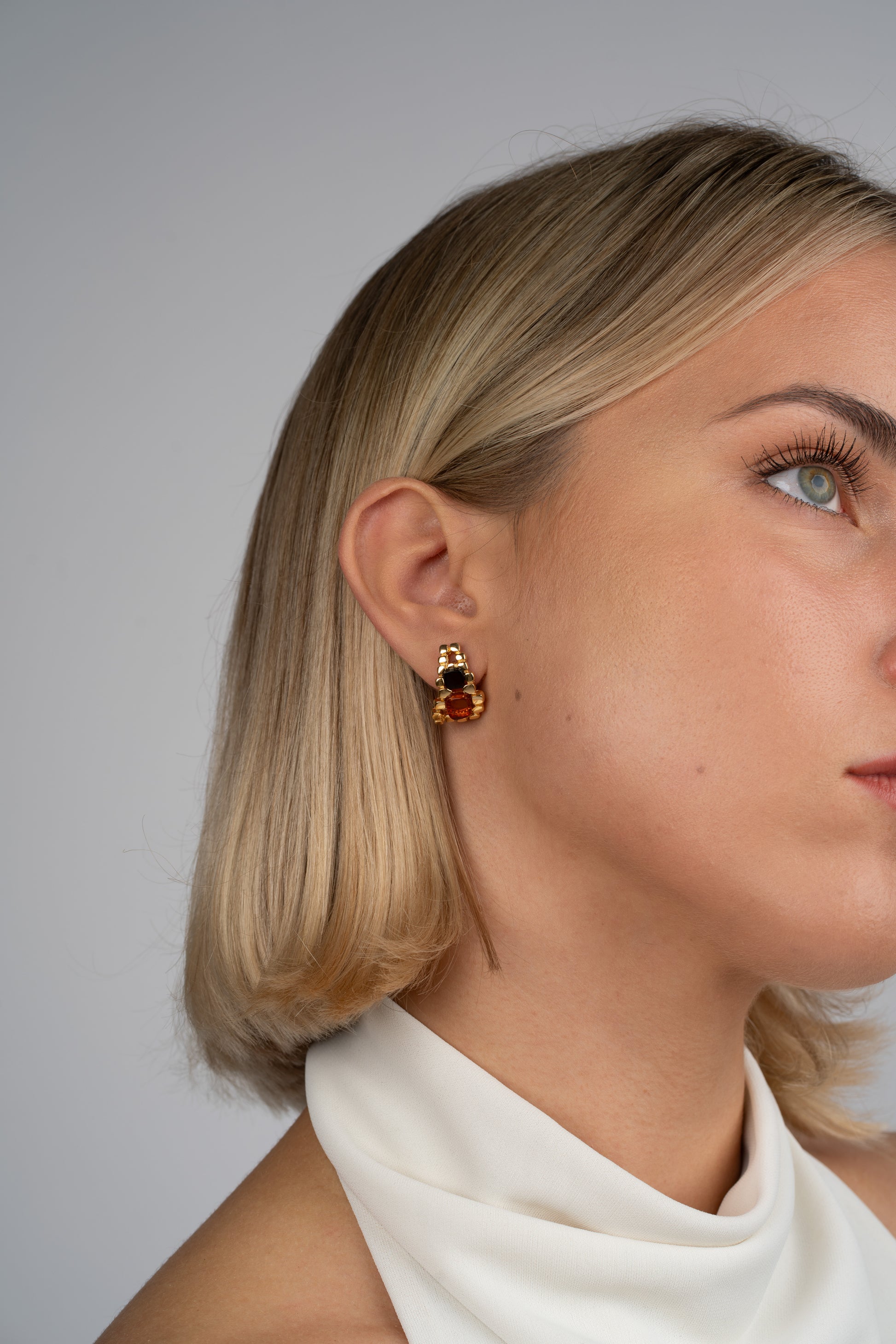 „Obscura Mellis“ (lot. „Tamsusis medus“) - rankų darbo 24k paauksuoti gintariniai auskarai, kuriuose kontrastuojantys konjako ir juodojo atspalvio Baltijos gintaro akmenys sukuria paslaptingą, bet kartu harmoningą derinį.