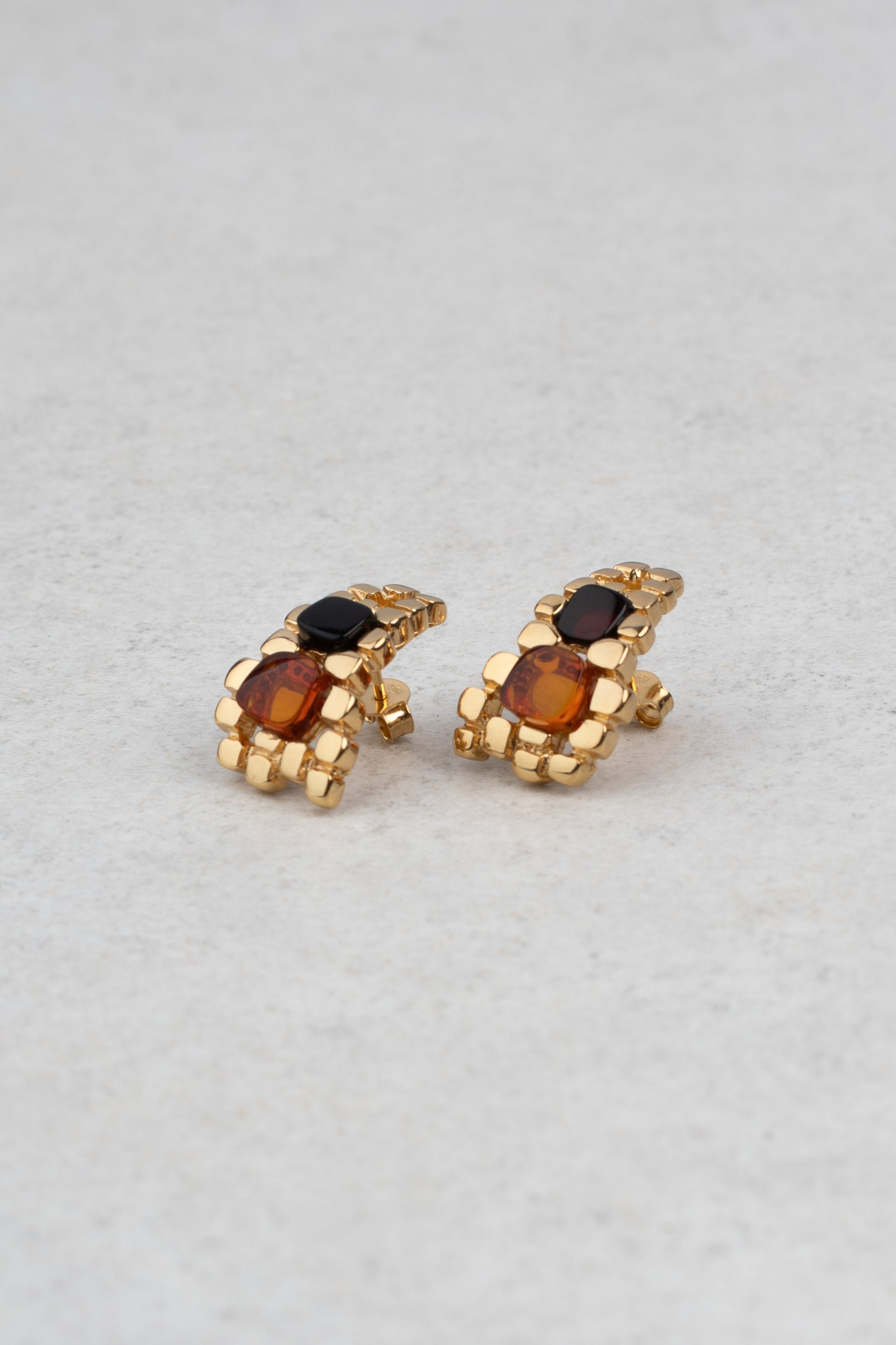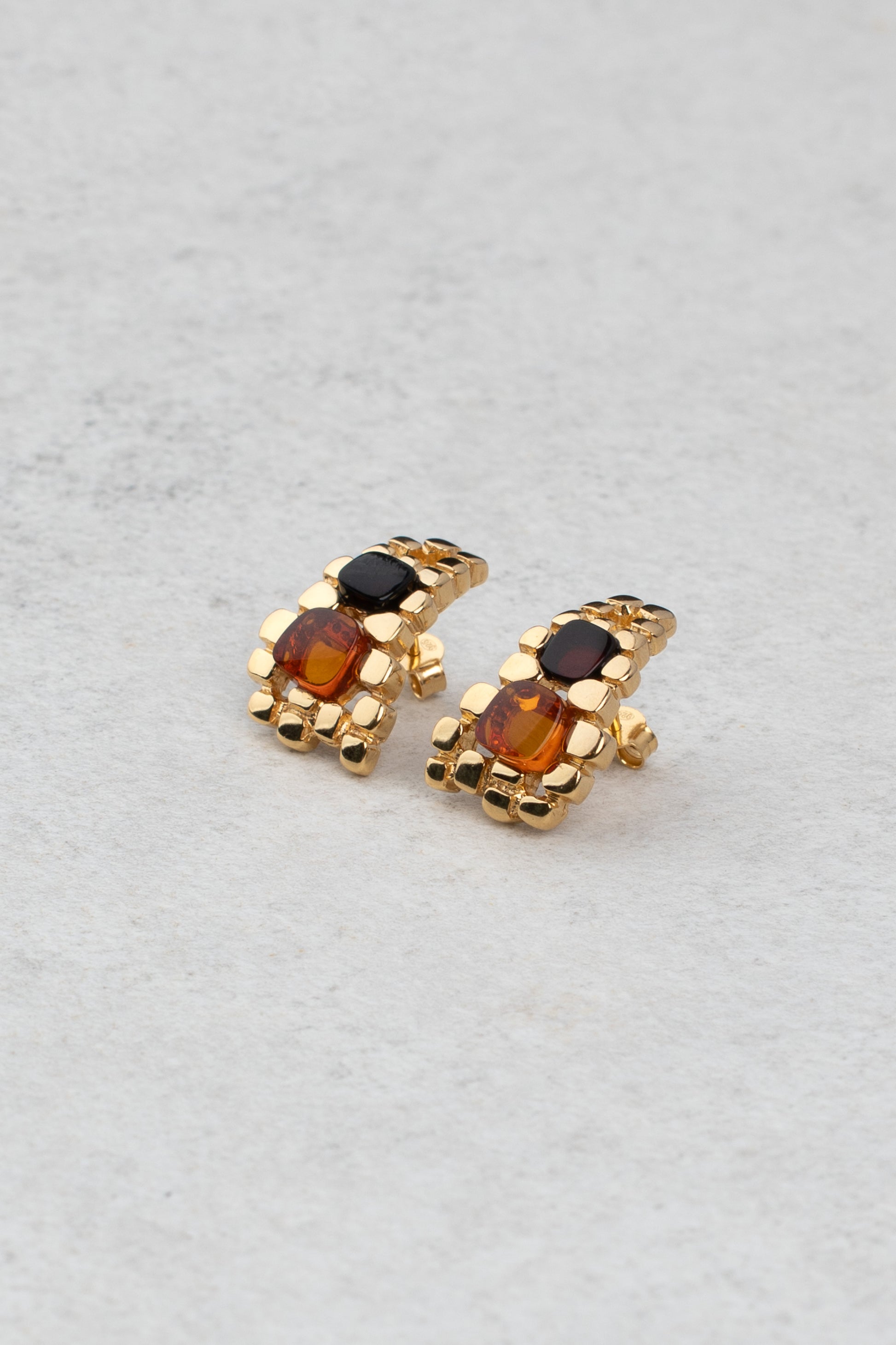Geometrinė forma primena mozaiką, kurioje kiekviena detalė atskleidžia gintaro turtingą spalvų gylį. Sukurti Baltijos regiono juvelyrų, šie auskarai jungia senąsias tradicijas su modernia estetika.