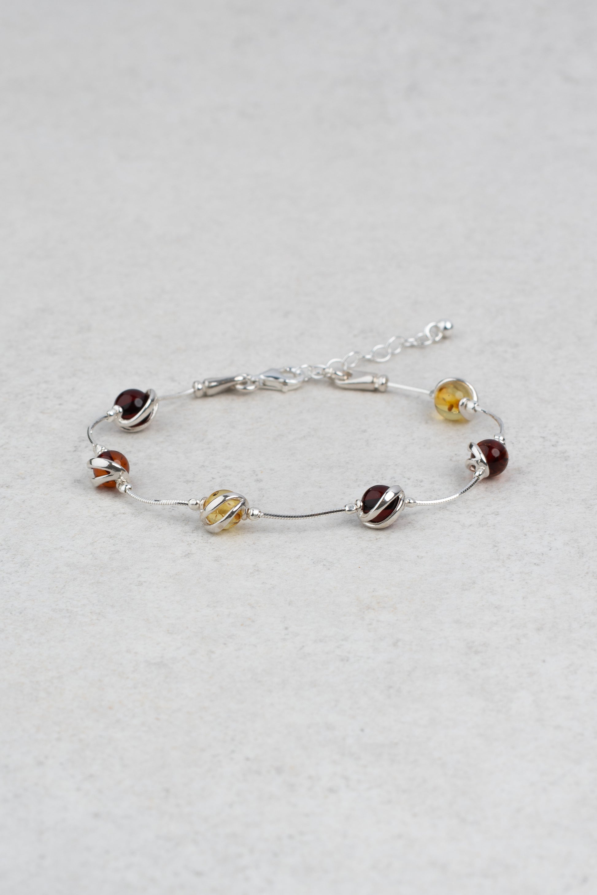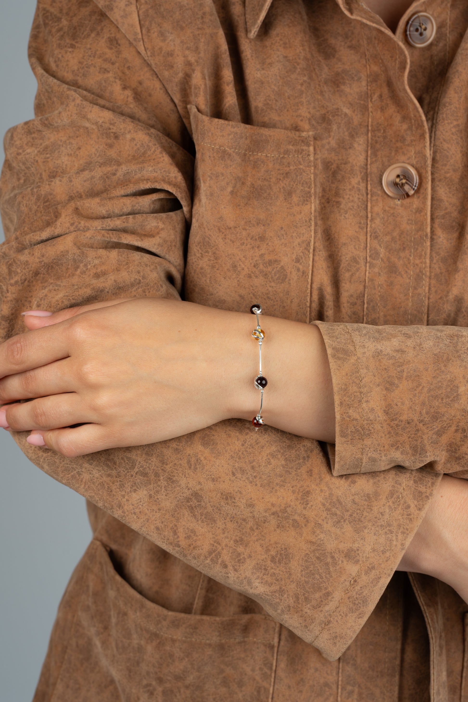 Subtili rankų darbo gintarinė apyrankė, sukurta Baltijos regiono juvelyrų. Ji pagaminta iš natūralaus Baltijos gintaro ir 925 sidabro, kuriame įkomponuoti gintaro rutuliukai tarsi įrėminti švelniu metalo apskritimu. Šis derinys kuria šiuolaikišką, tačiau kartu ir klasikinę estetiką, primenančią gamtos darną. Apyrankė išryškina gintaro spalvų įvairovę – nuo saulėto geltonio iki sodraus vyšninio tono, simbolizuojančių gyvybės ciklą ir gamtos tėkmę.