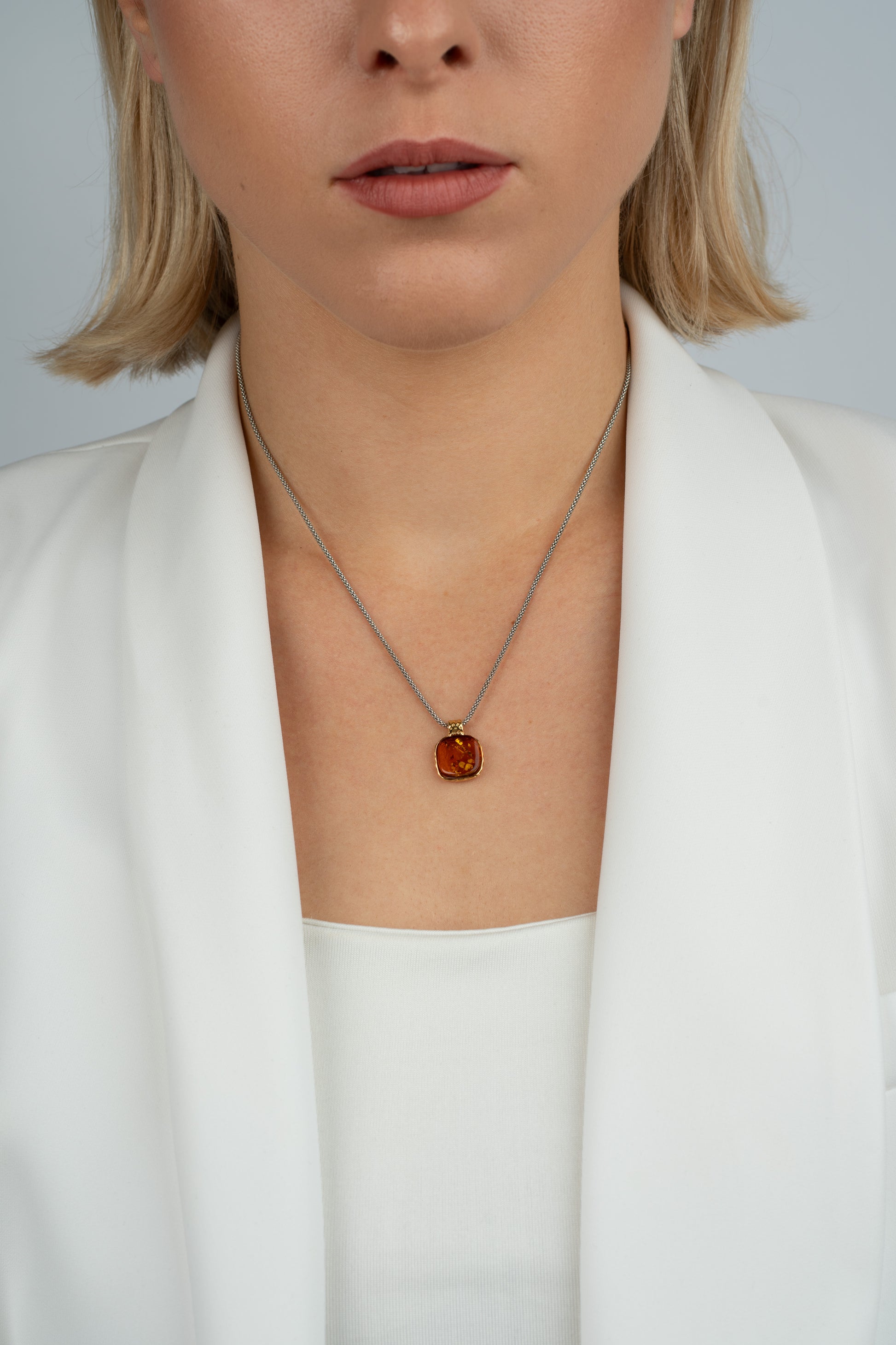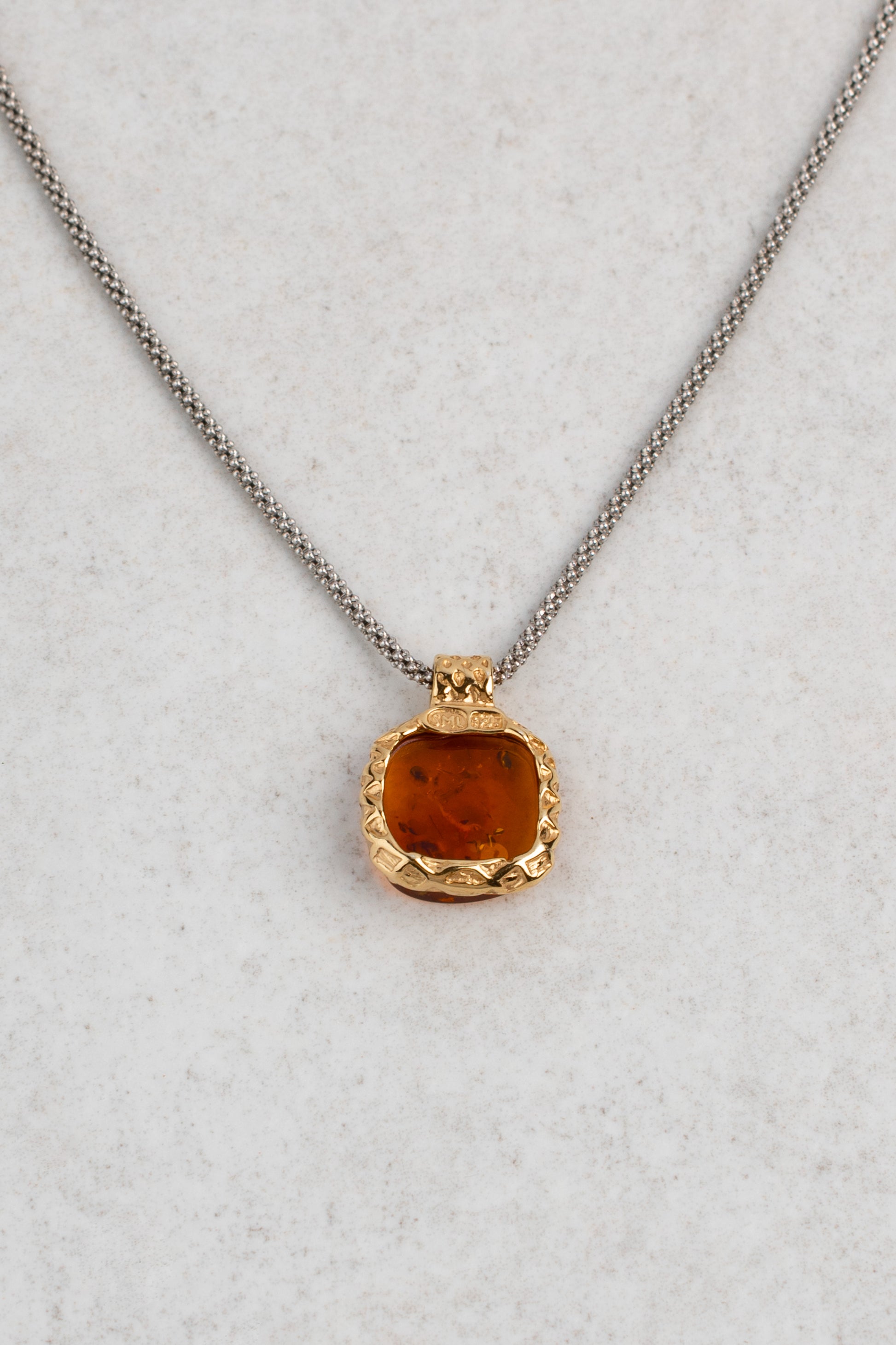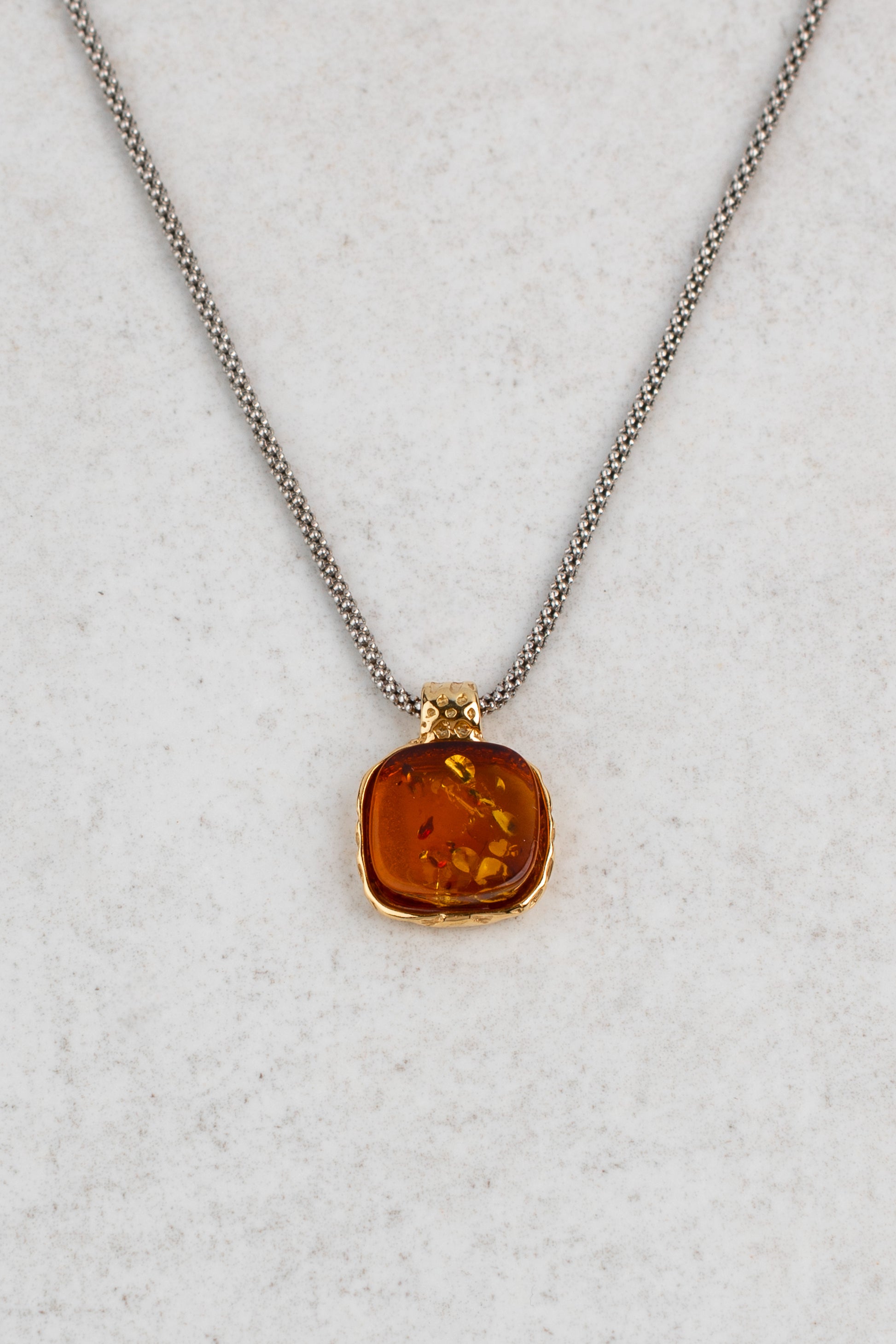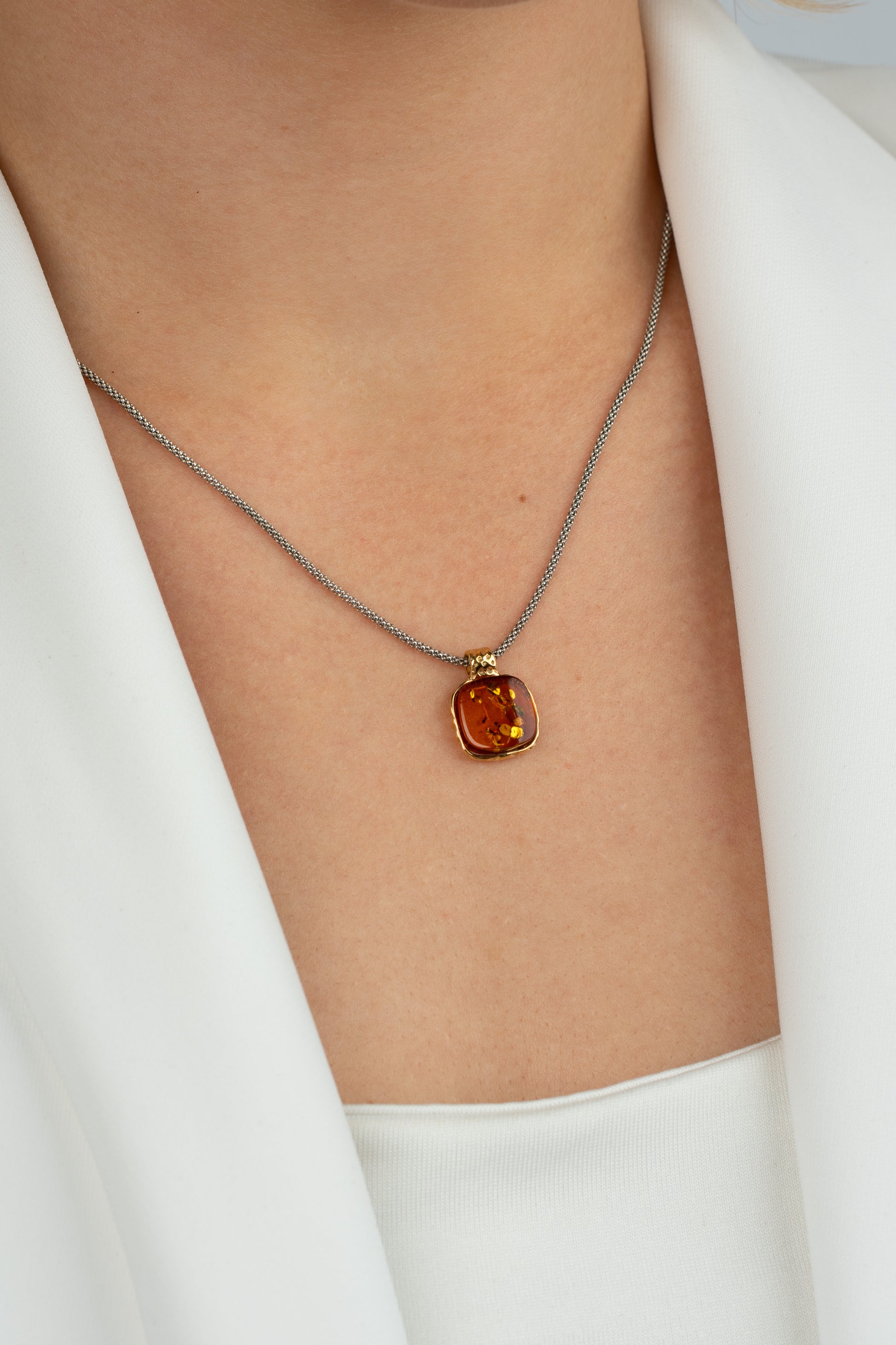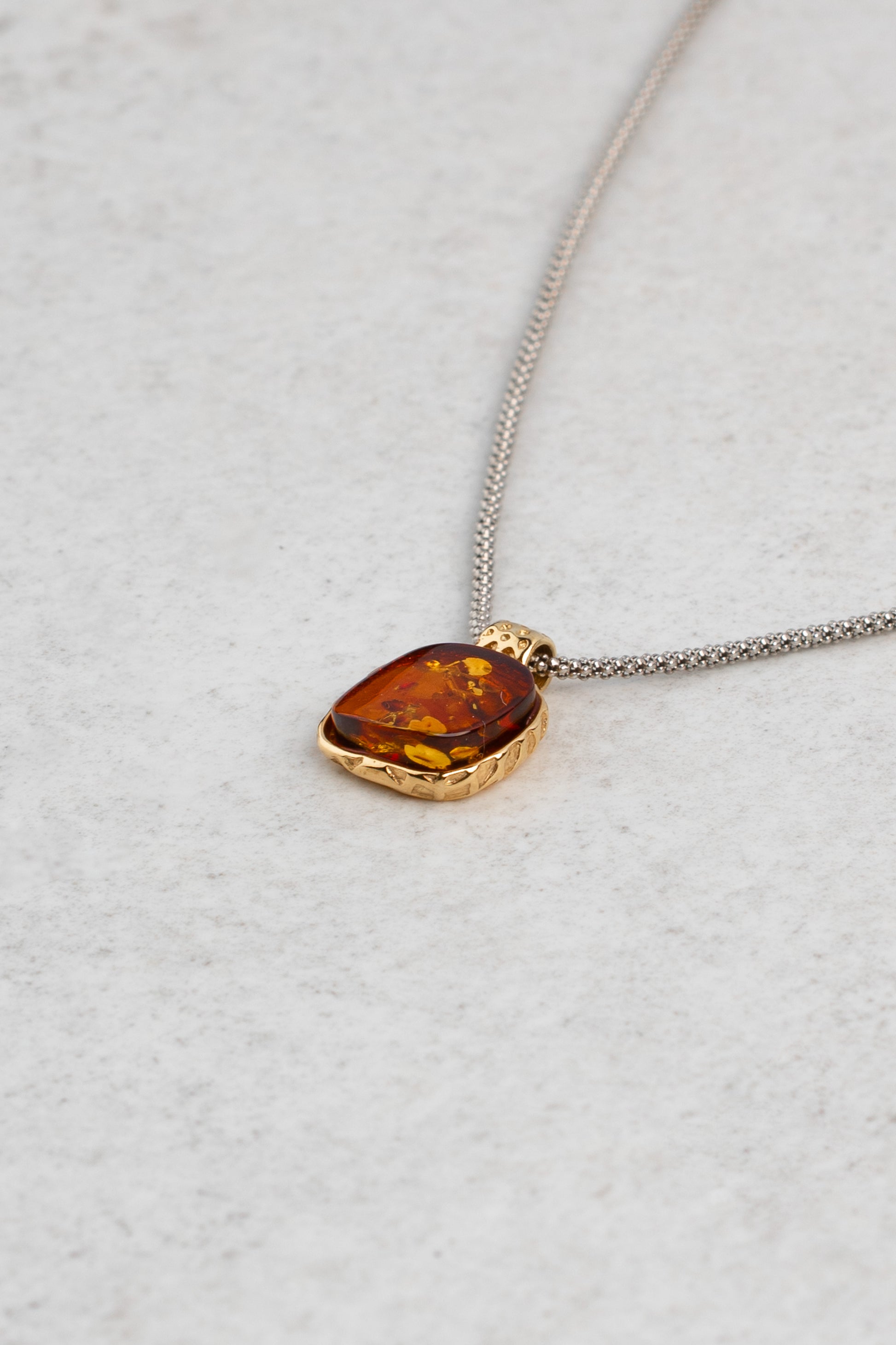 Ši rankų darbo grandinėlė, sukurta Baltijos meistro, išryškina natūralų autentiško Baltijos gintaro grožį. Netaisyklingos kvadratinės formos medaus spalvos gintaras skleidžia šiltą švytėjimą, o paauksuotas rėmelis sustiprina jo spindesį, suteikdamas papuošalui elegancijos ir modernios prabangos dermę. Rafinuotas ir laiko nepavaldus juvelyrikos kūrinys, kuriame darniai susilieja gamtos šiluma ir meistro meistrystė.