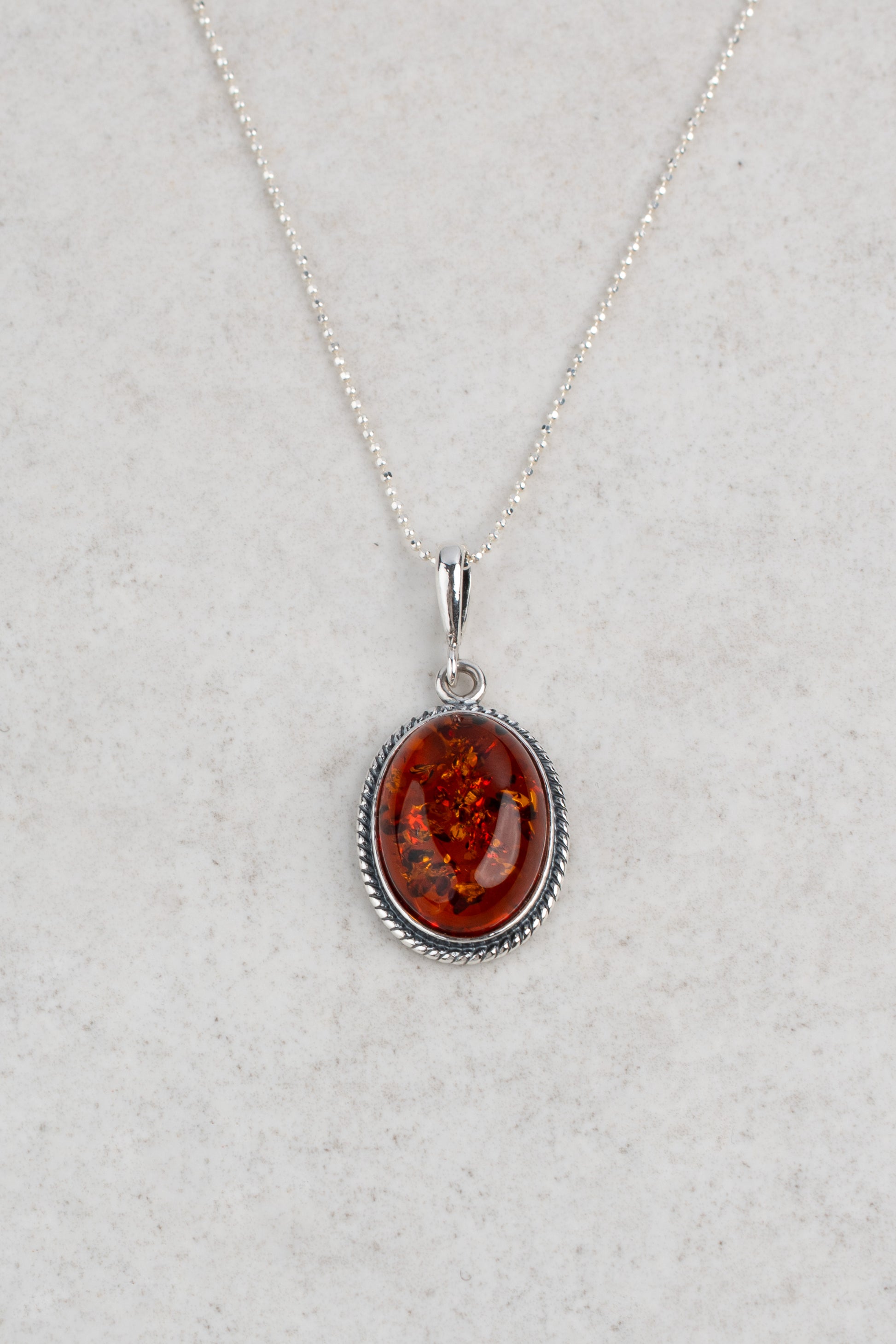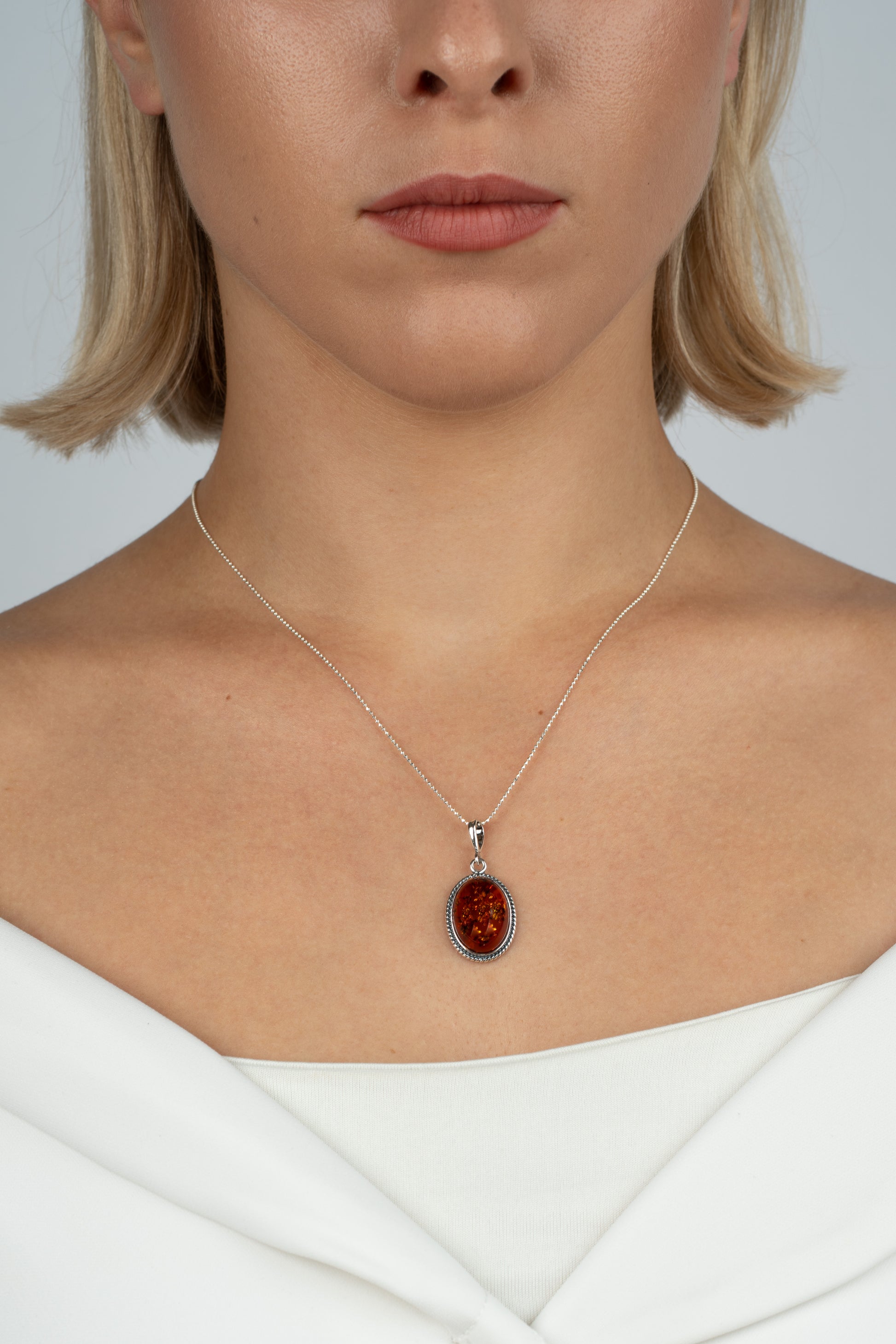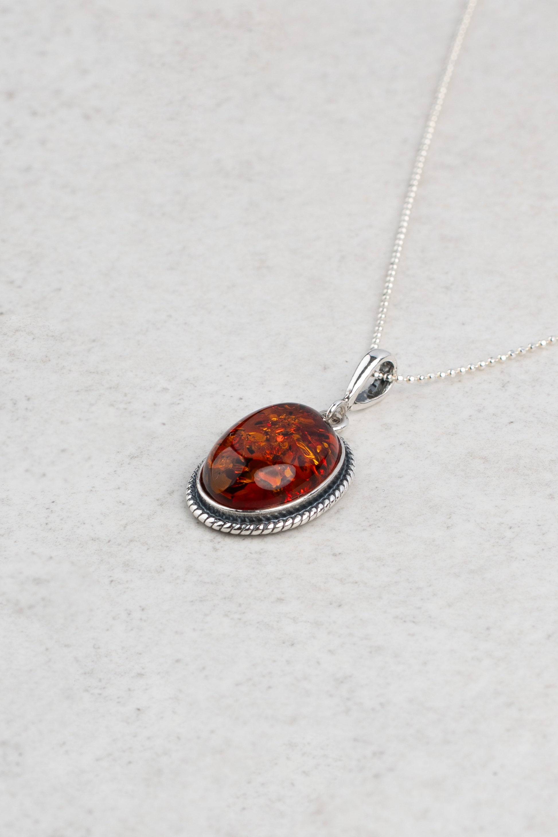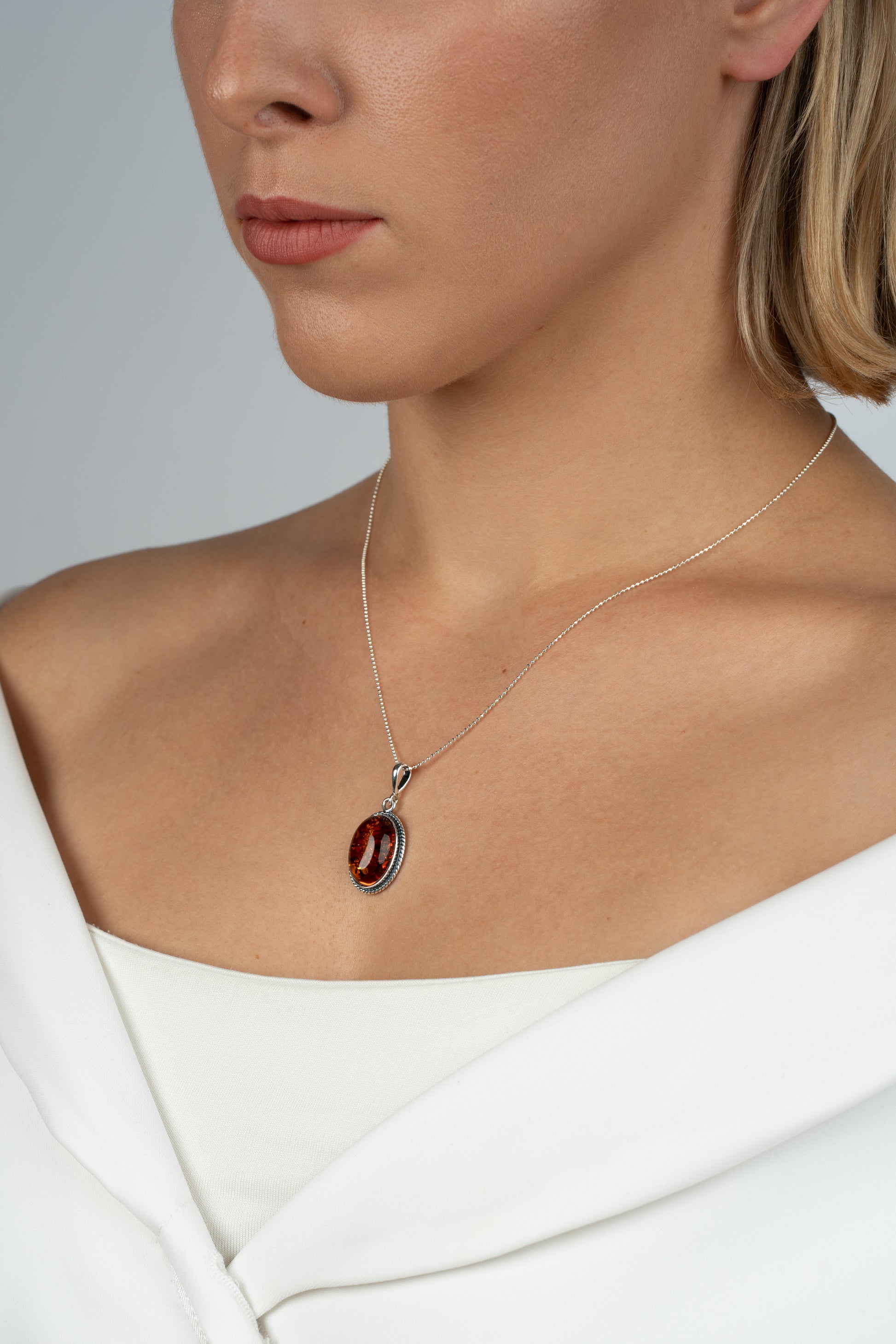 Šie rankų darbo vėriniai išryškina natūralų autentiško Baltijos gintaro grožį. Šiltas, medaus atspalvio gintaras spinduliuoja švelnų švytėjimą, o struktūruotas sidabrinis apvadas elegantiškai įrėmina akmenį. Rafinuotas ir nesenstantis kūrinys, kuriame dera modernumas ir klasikinis žavesys.