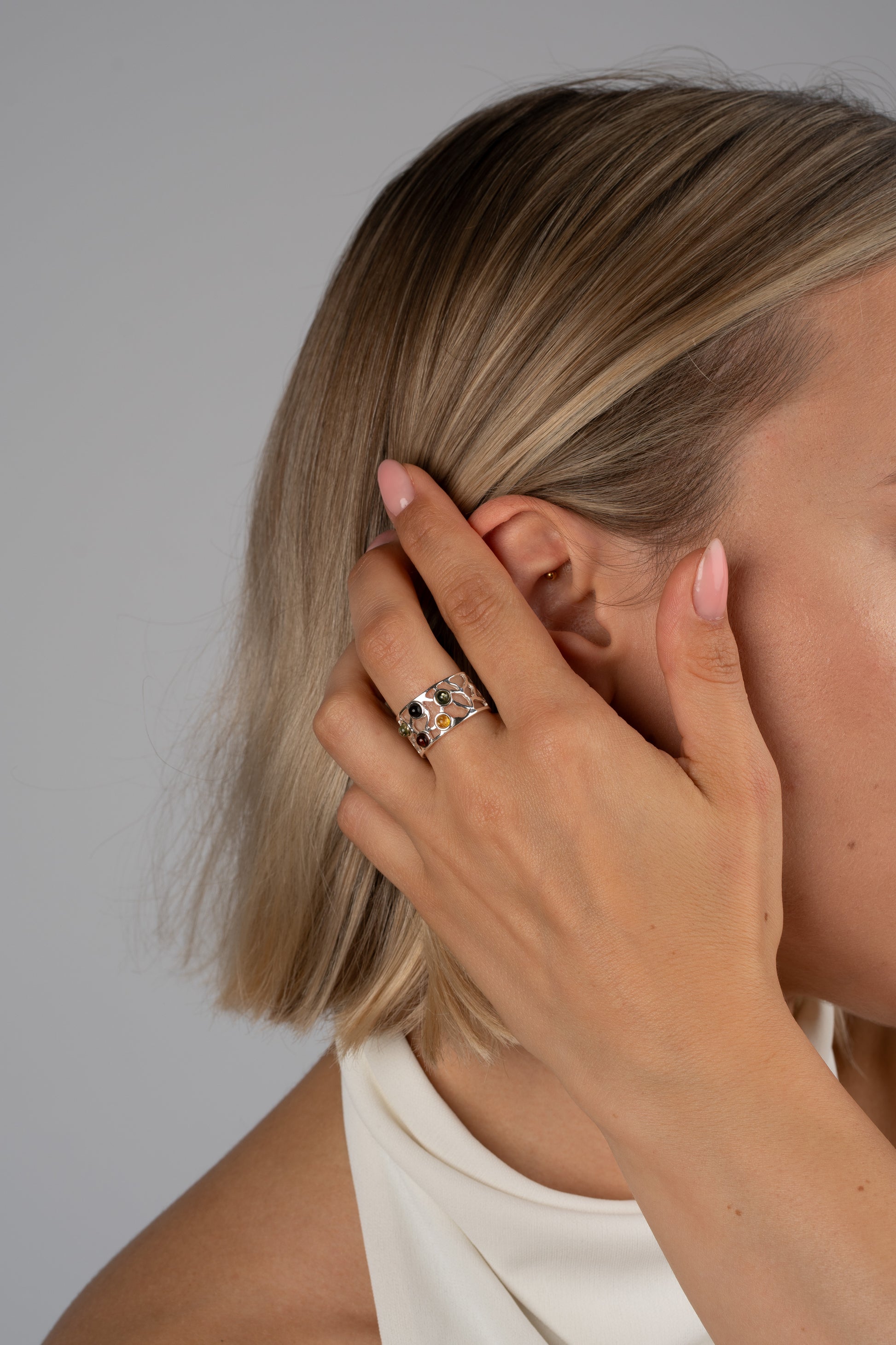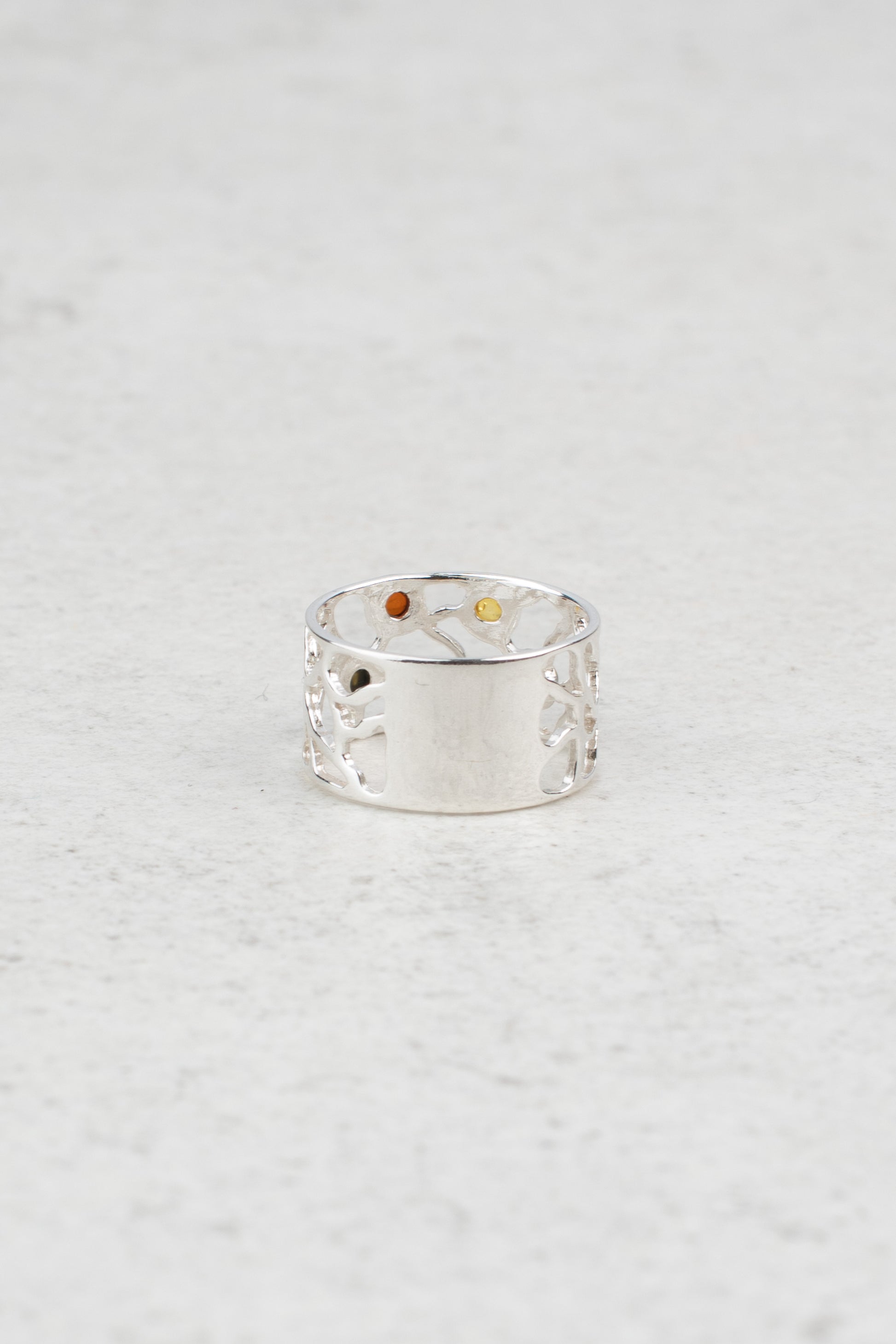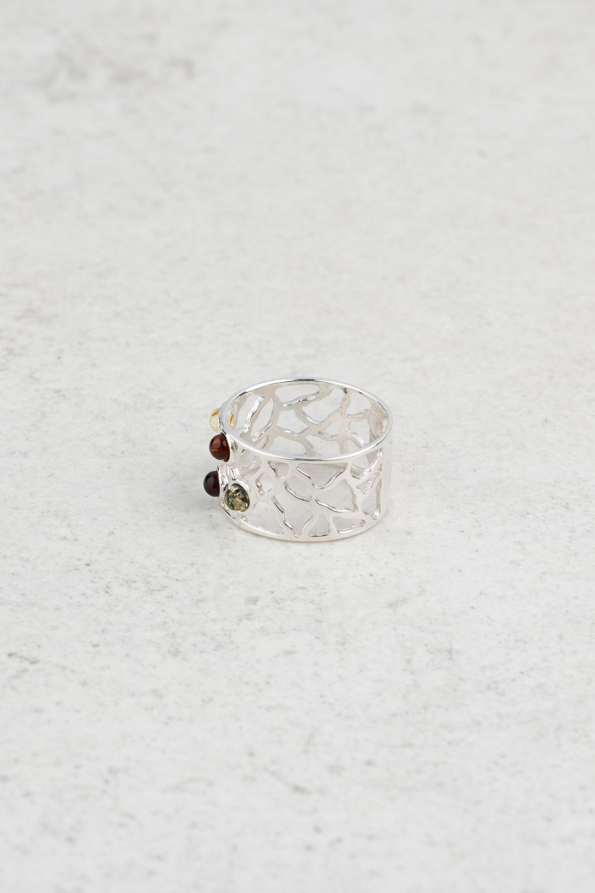 Modernus žiedo dizainas įrėmina natūralius Baltijos gintaro akmenis, kurie, regis, sklandžiai įsilieja į šią elegantišką kompoziciją.